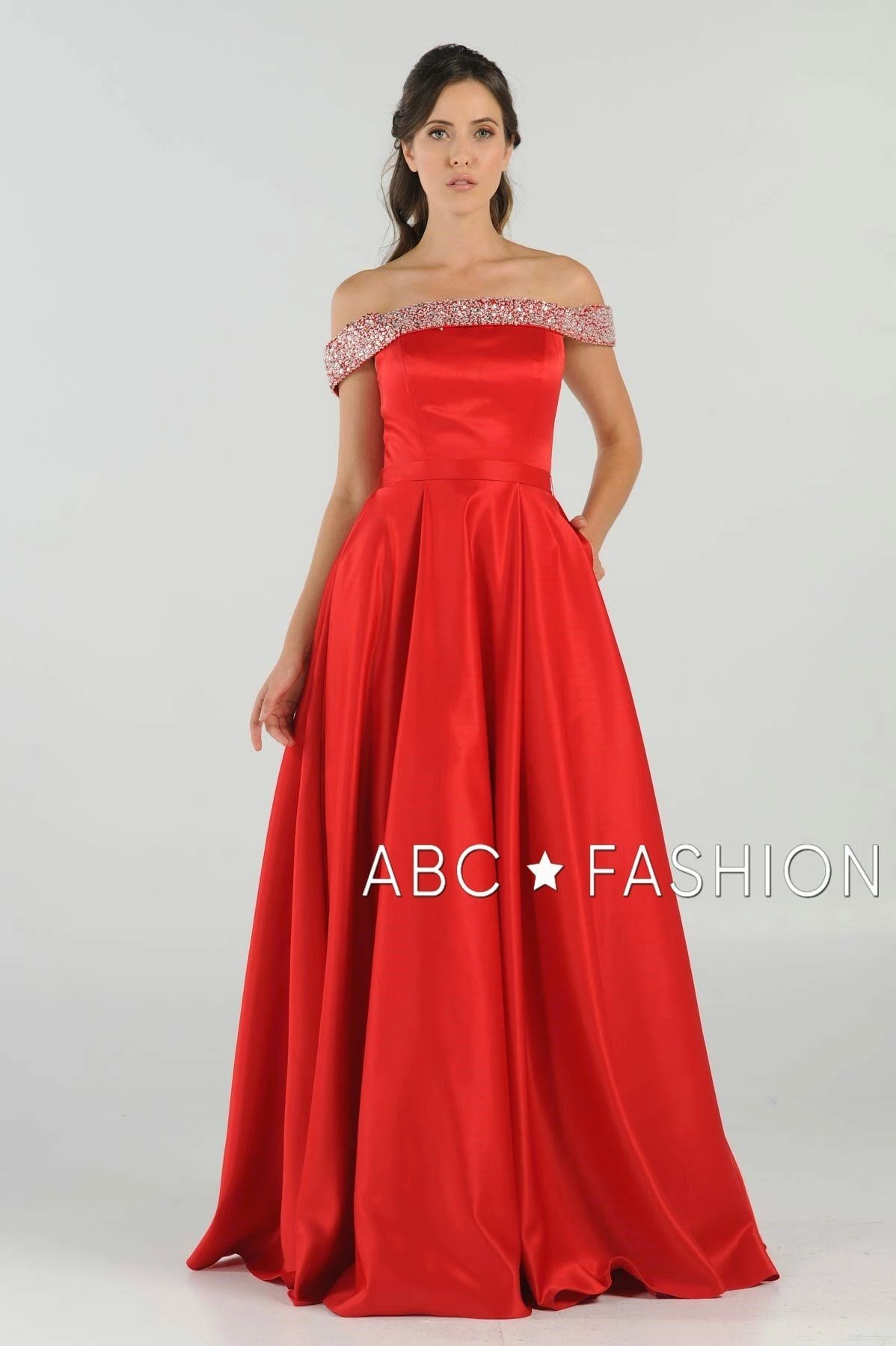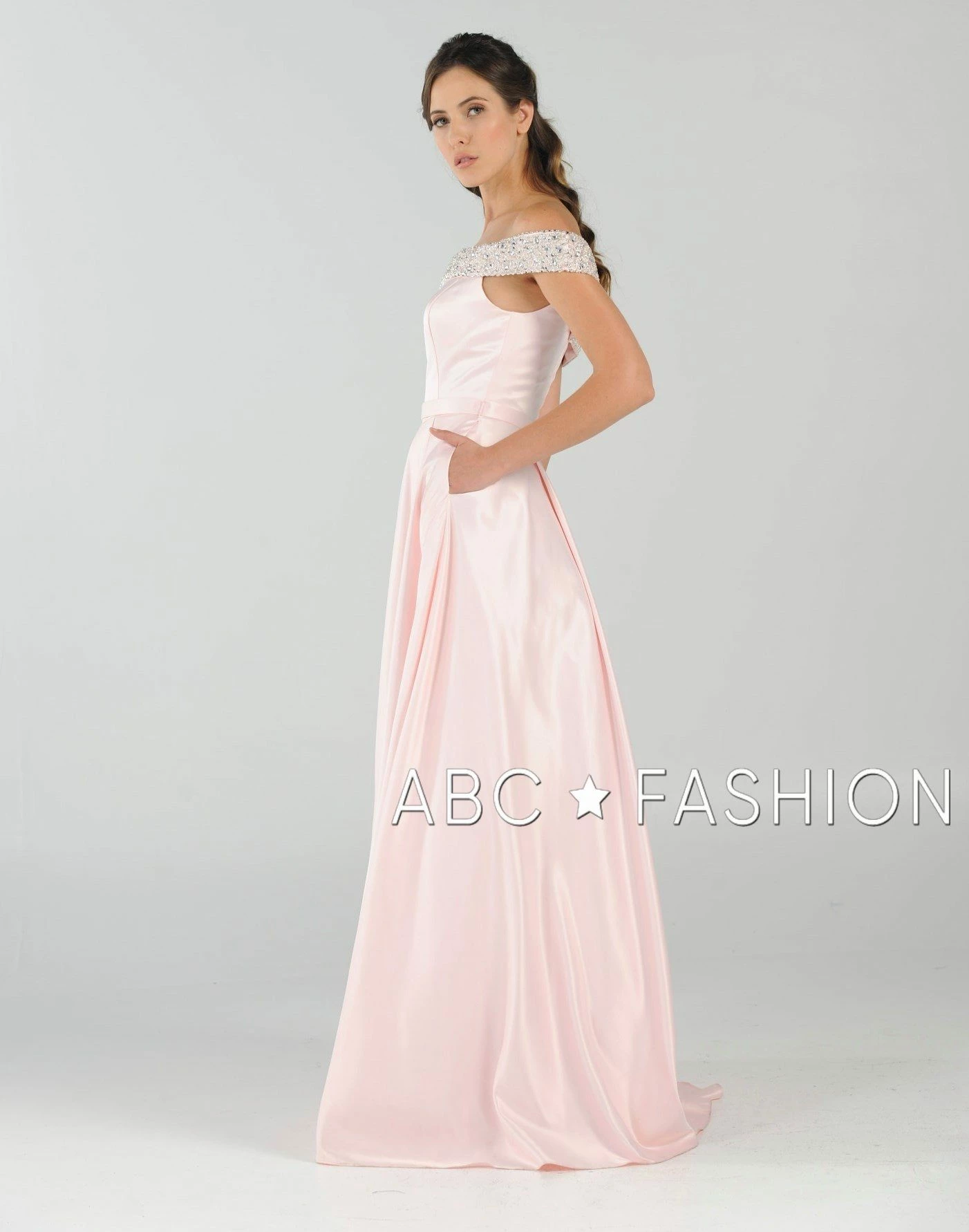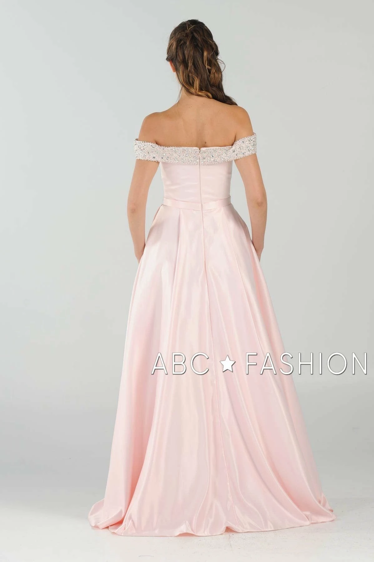 Captivate the room in this beaded off the shoulder ball gown with side pockets by Poly USA 8242. Gorgeous off the shoulder satin dress adorned with dazzling rhinestones and sequins, floor length A-line skirt, side pockets, and a zipper closure. Affordably priced under $250, this dress is perfect for any formal event and will keep you on budget!