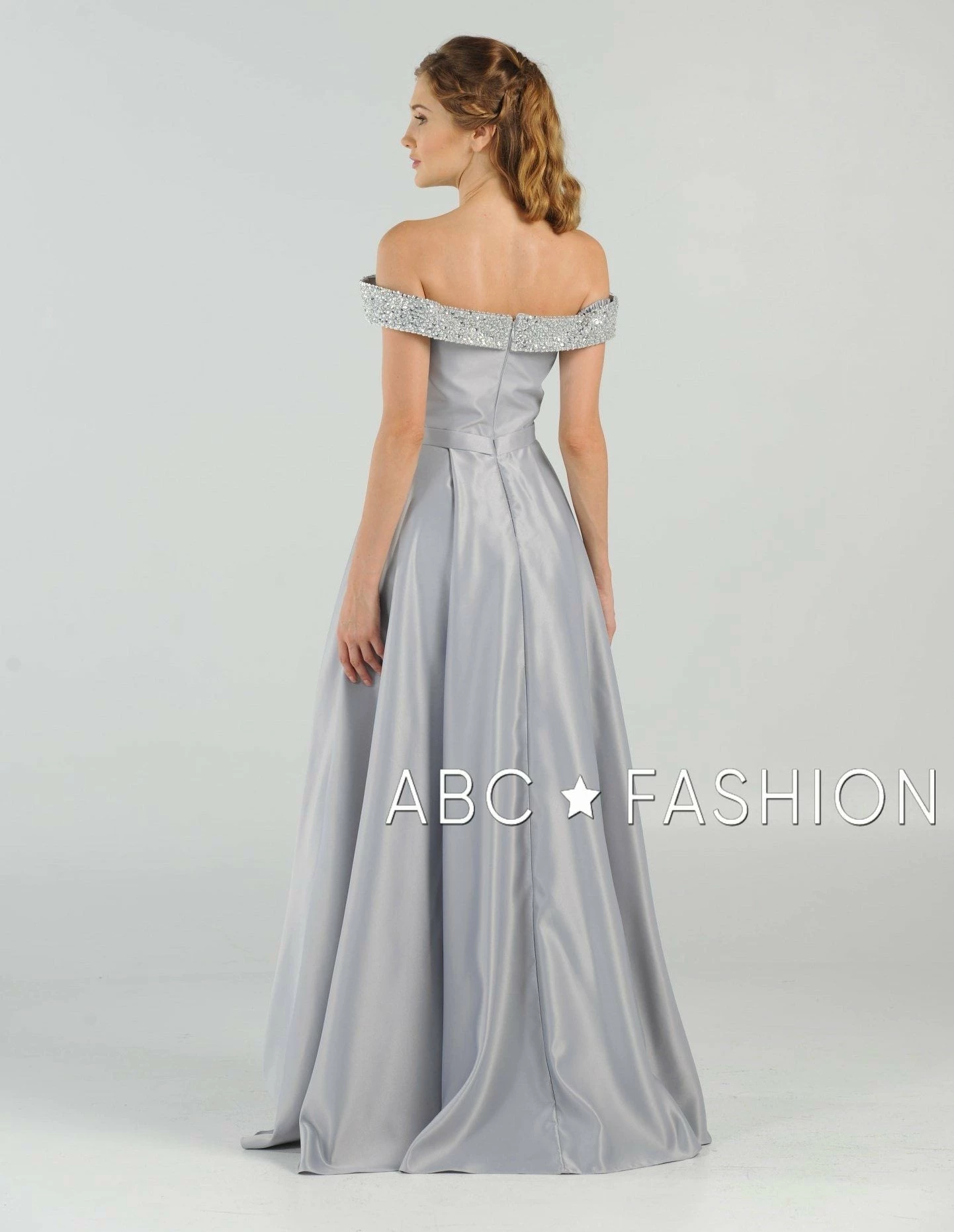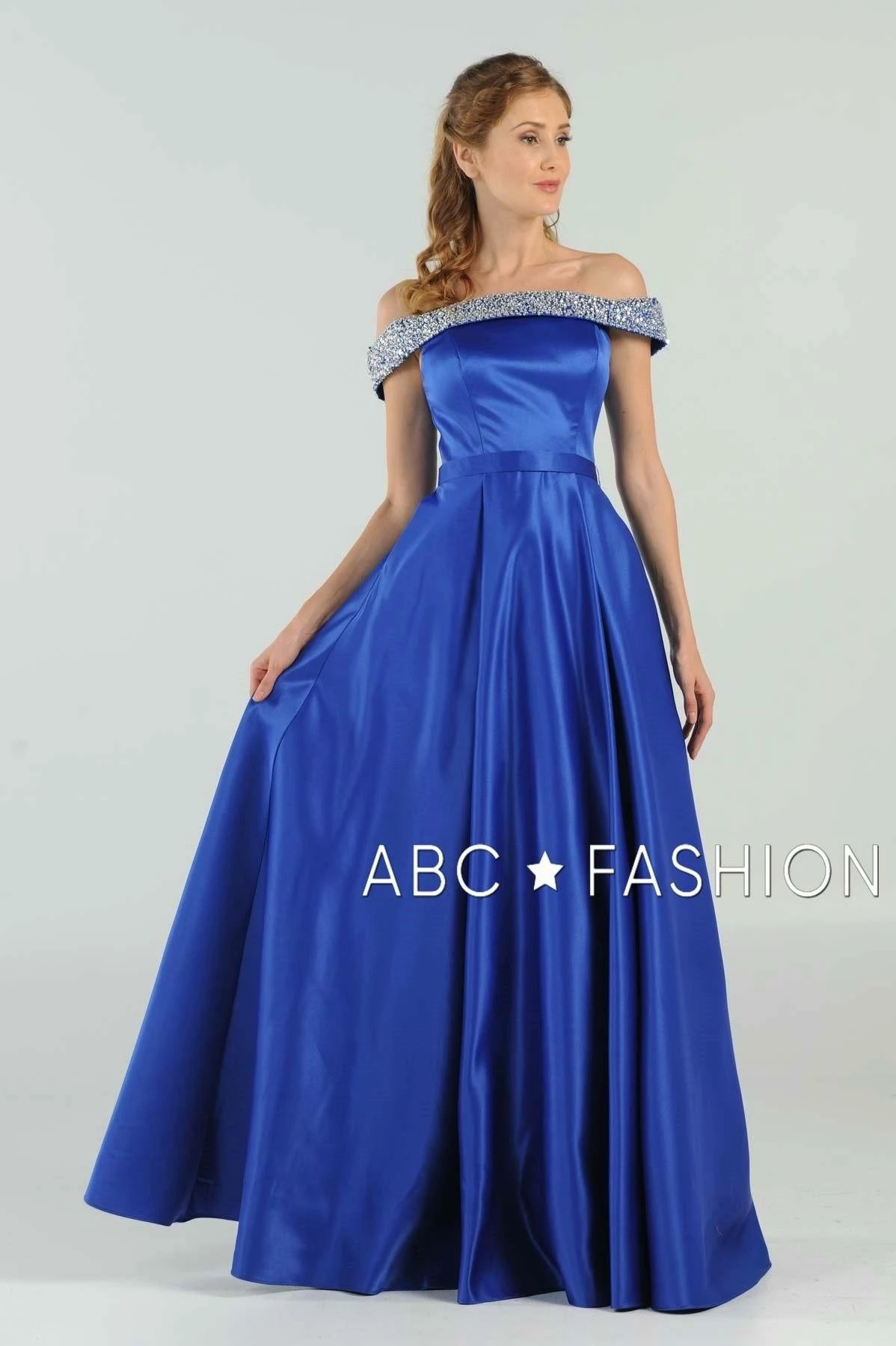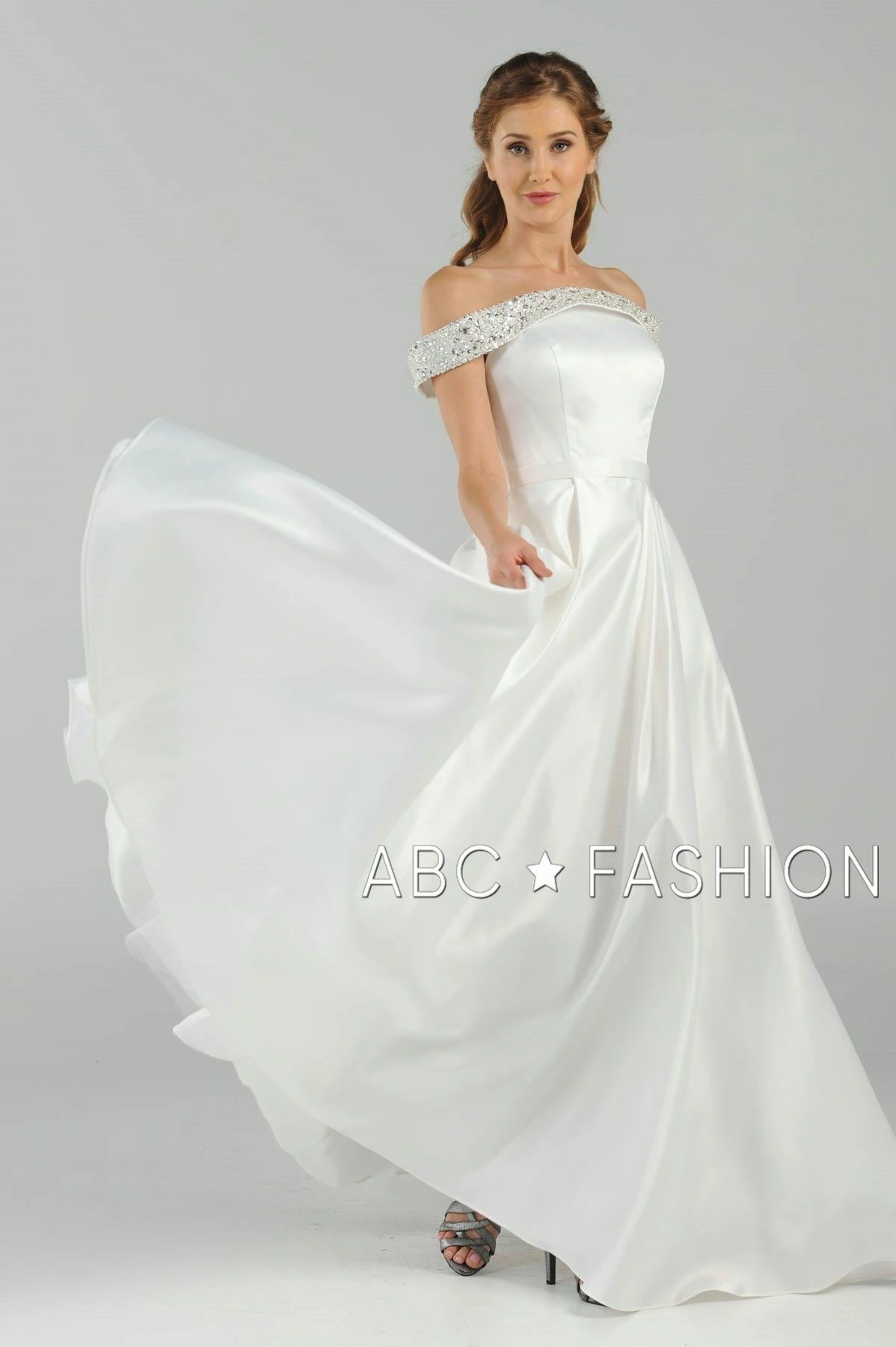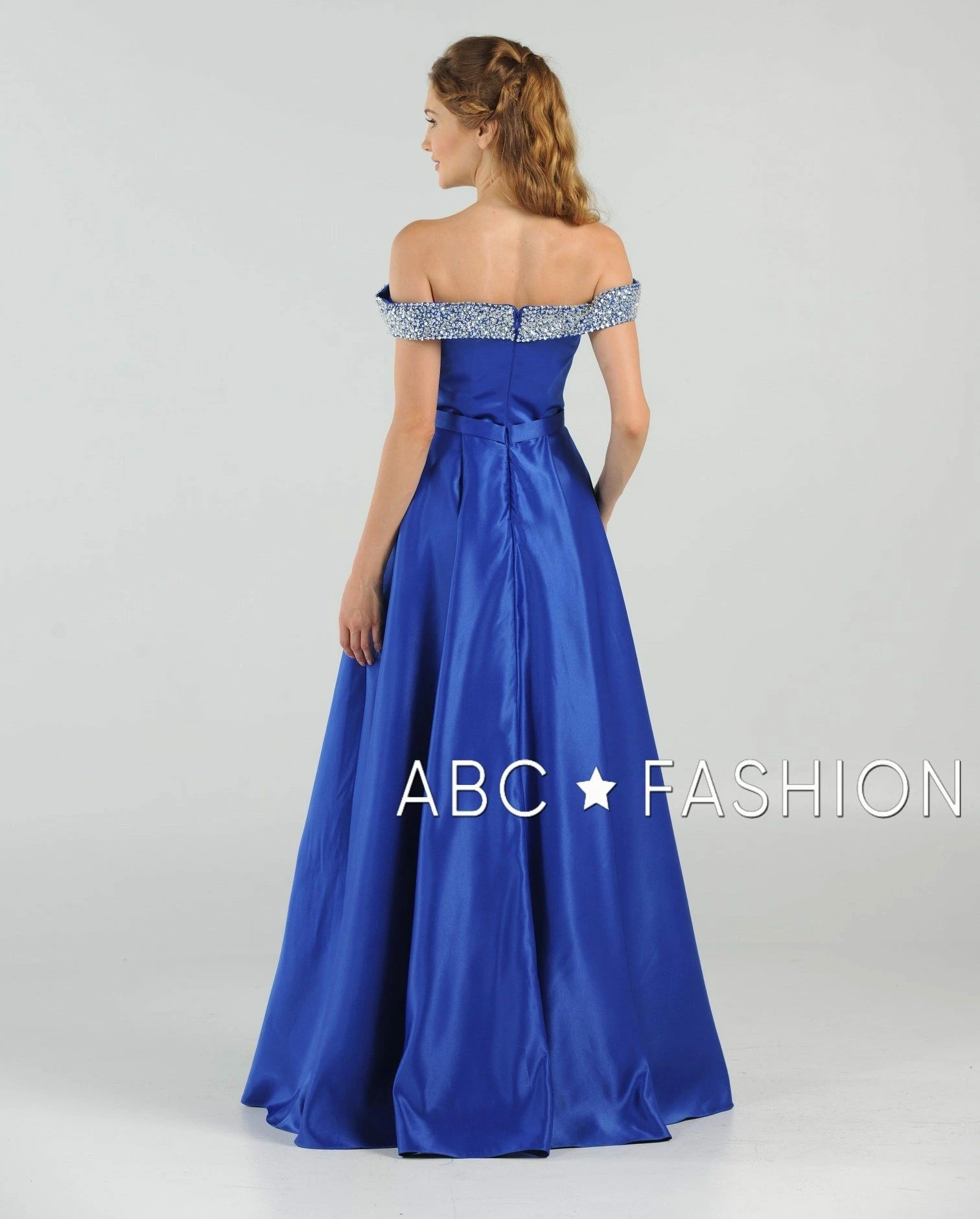 Captivate the room in this beaded off the shoulder ball gown with side pockets by Poly USA 8242. Gorgeous off the shoulder satin dress adorned with dazzling rhinestones and sequins, floor length A-line skirt, side pockets, and a zipper closure. Affordably priced under $250, this dress is perfect for any formal event and will keep you on budget!