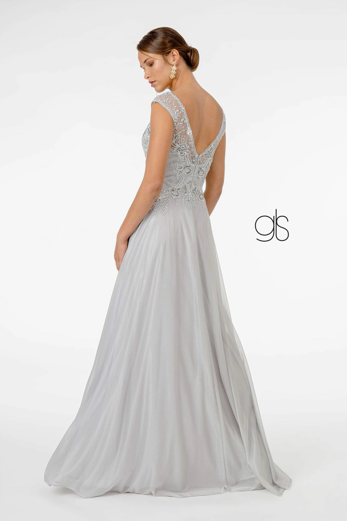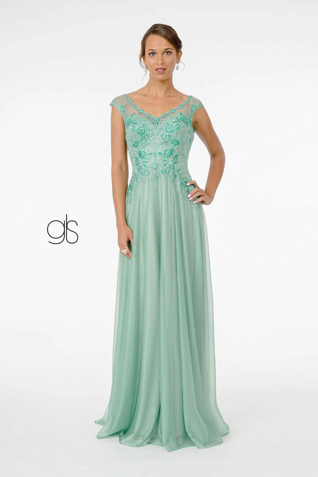 Enjoy your evening in this long cap sleeve dress with embroidered illusion bodice by Elizabeth K GL1826.