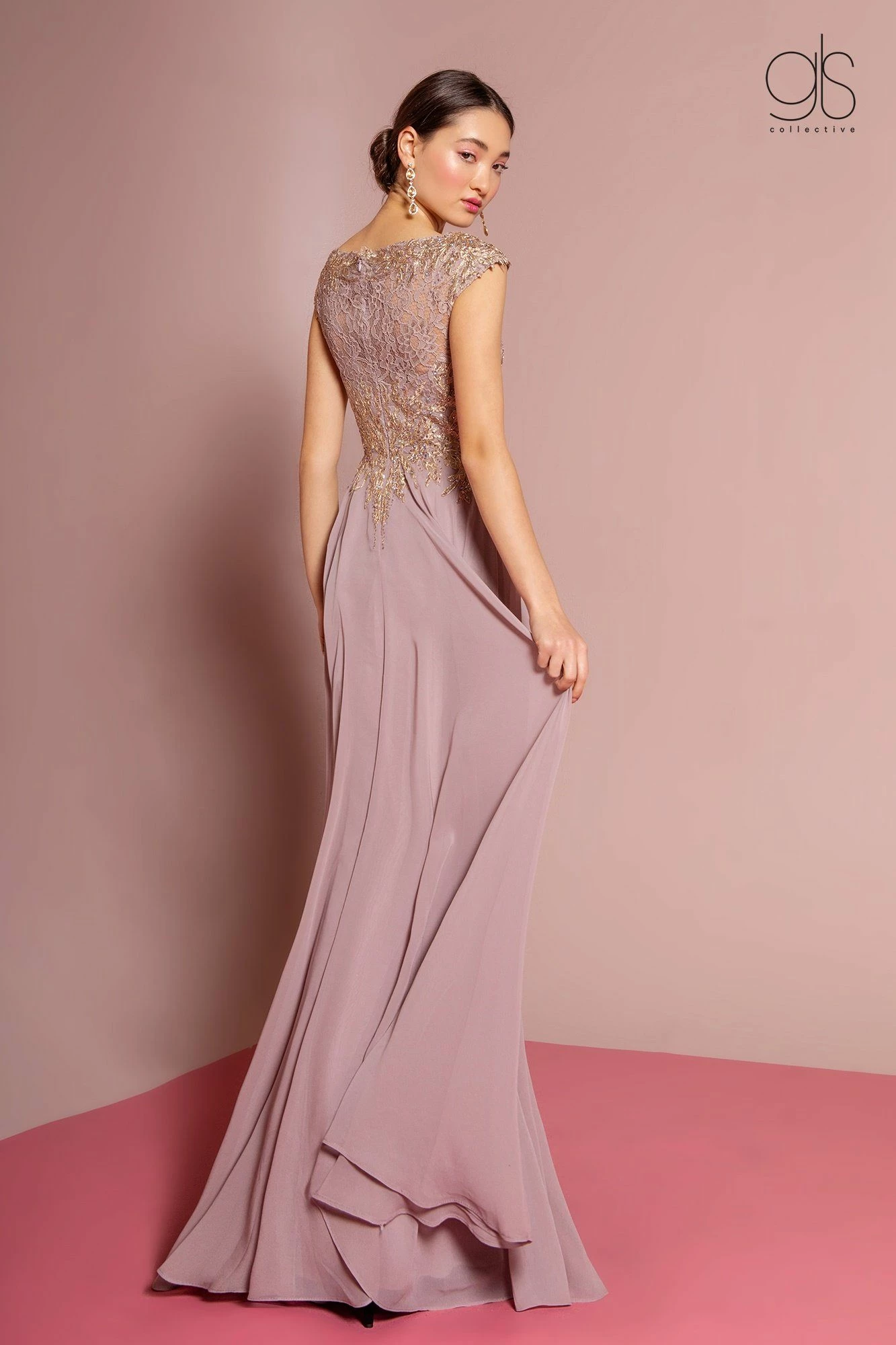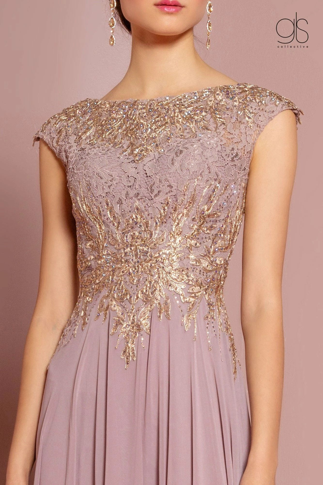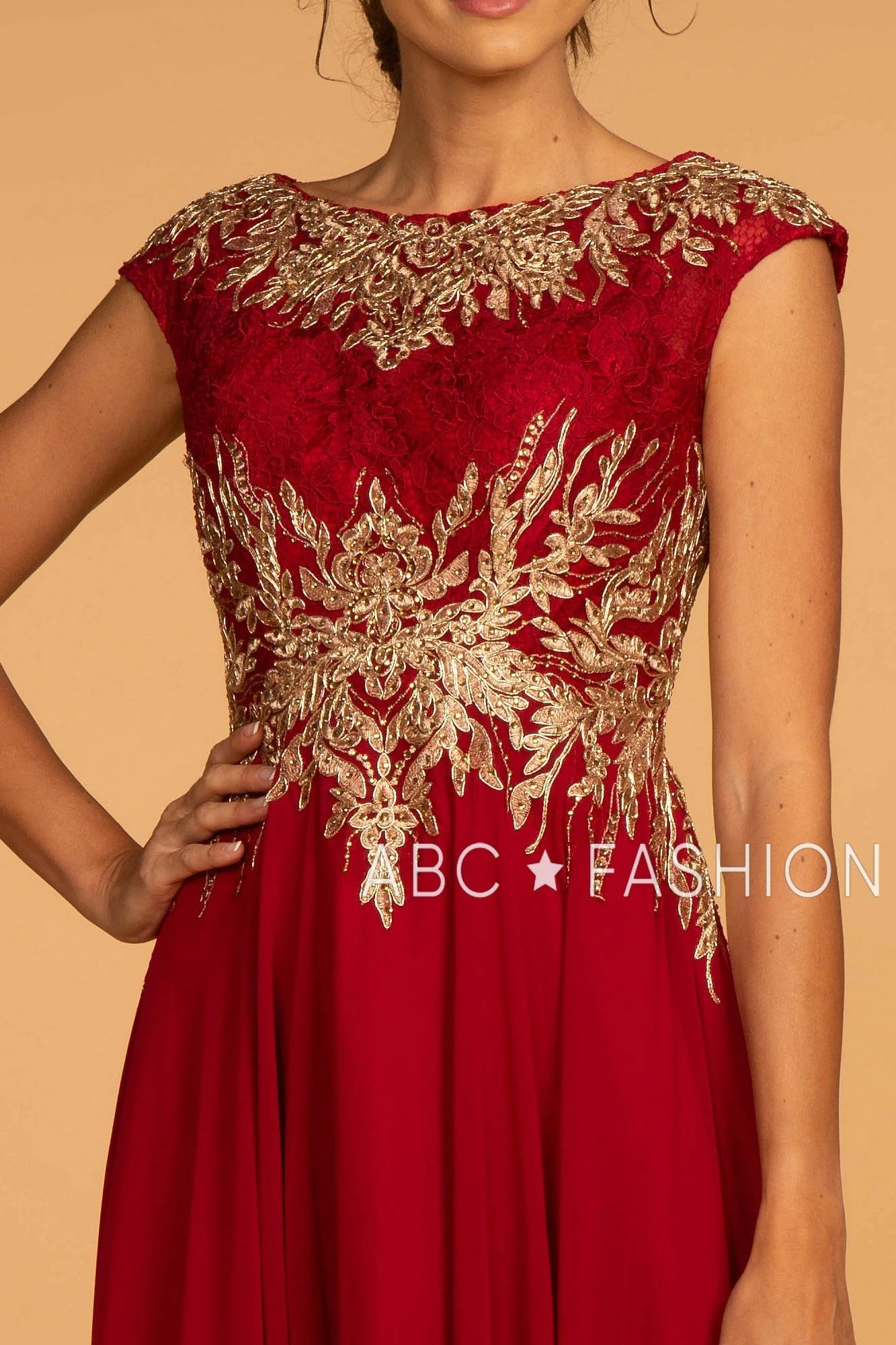 Look modest chic in this cap sleeve embroidered gown with lace bodice by Elizabeth K GL2519. This long evening dress features a lace bodice with cap sleeves, beautiful gold embroidery adorns the boat neckline and cascades to the waistline, a floor length A-line chiffon skirt, and a zipper closure. Affordably priced under $300, this dress is perfect for any formal event and will keep you on budget!