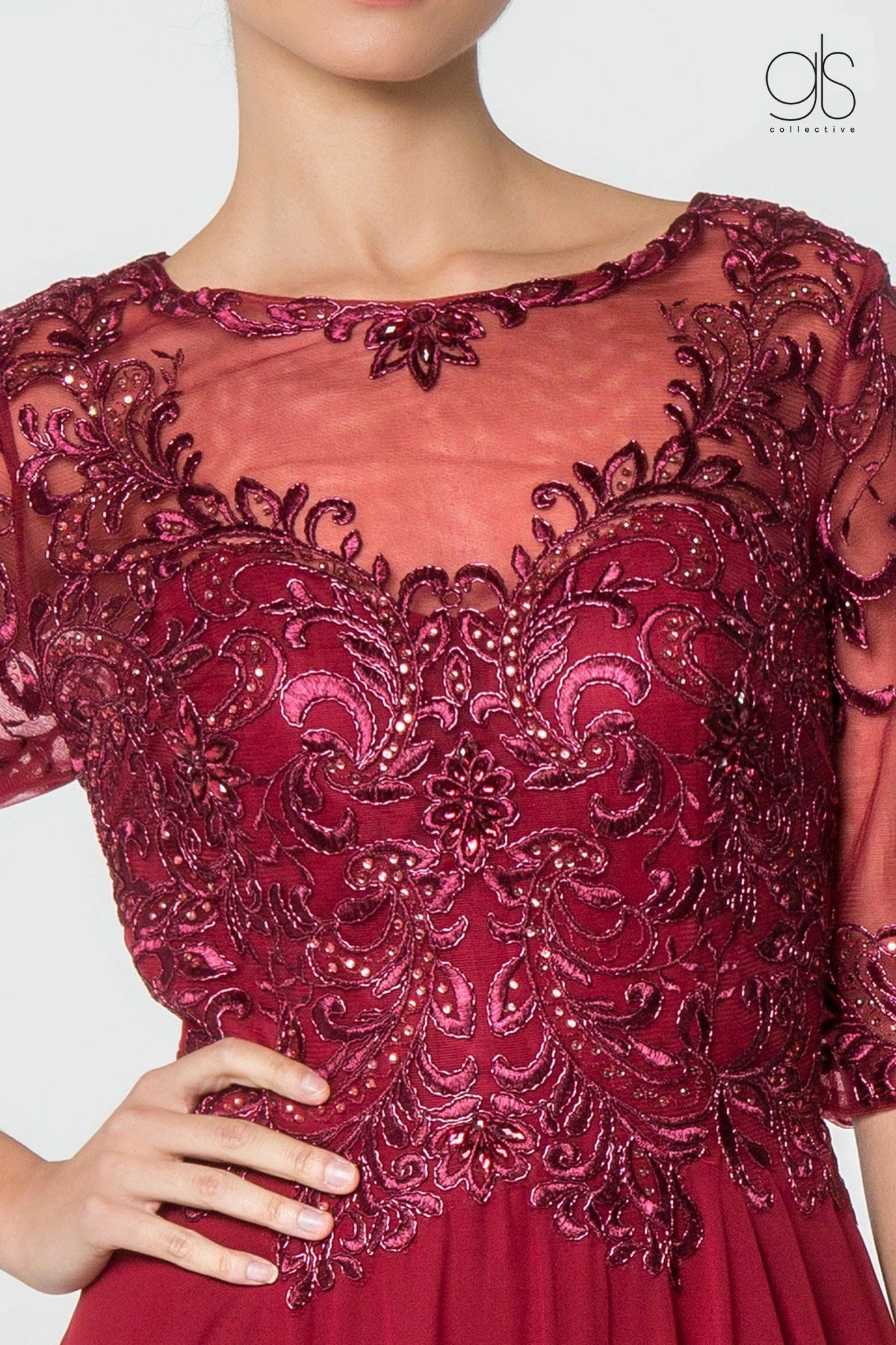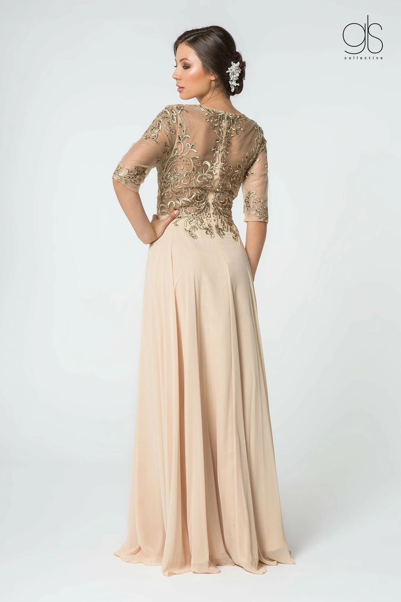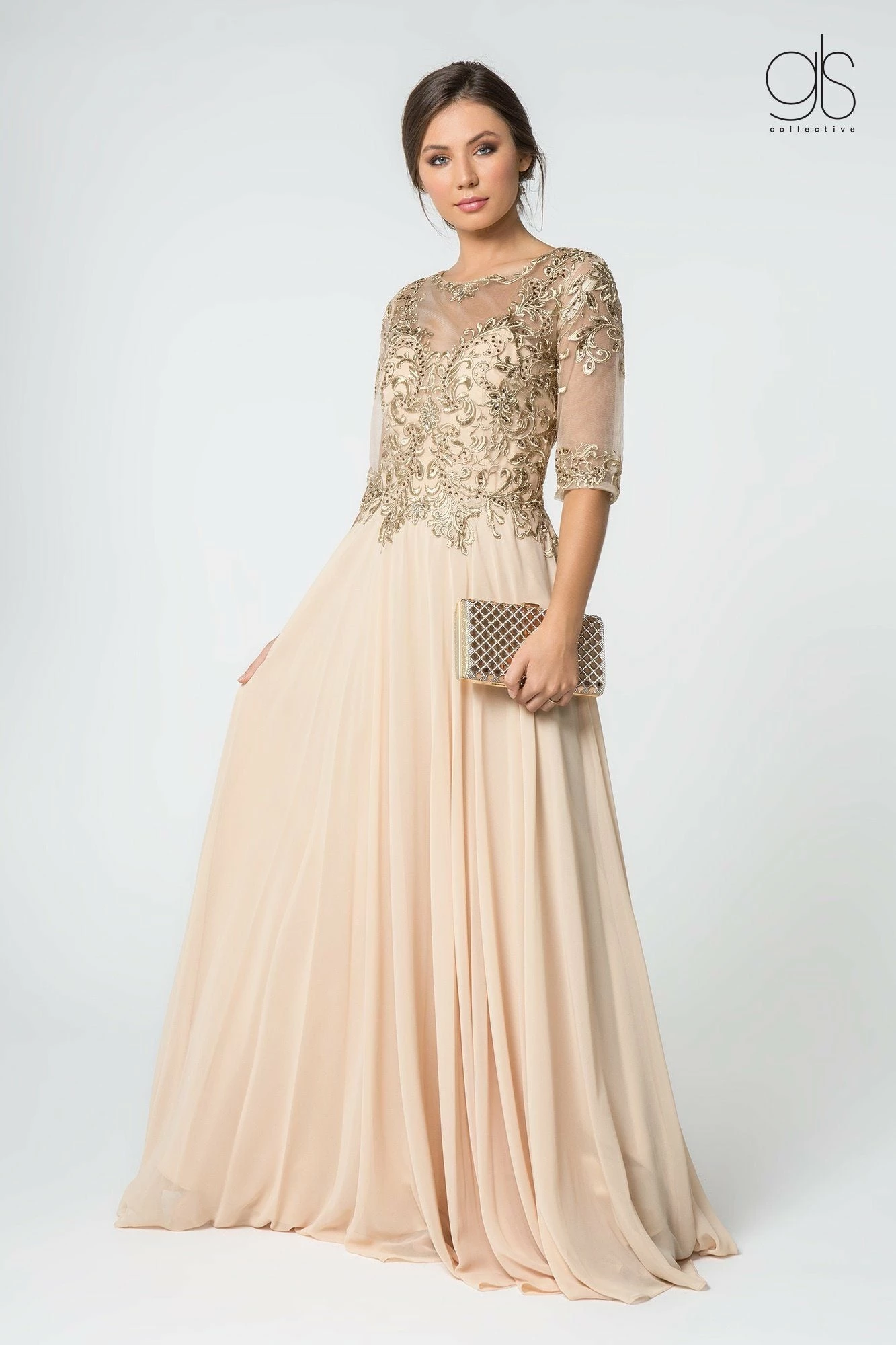 Look modest chic in this embroidered bodice illusion gown with mid sleeves by Elizabeth K GL2812.