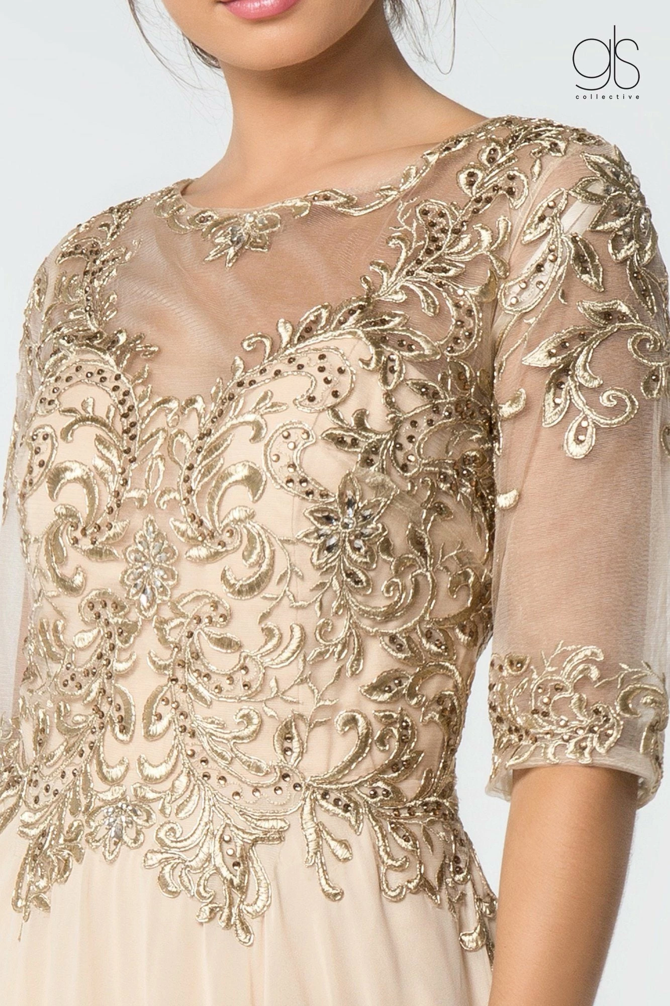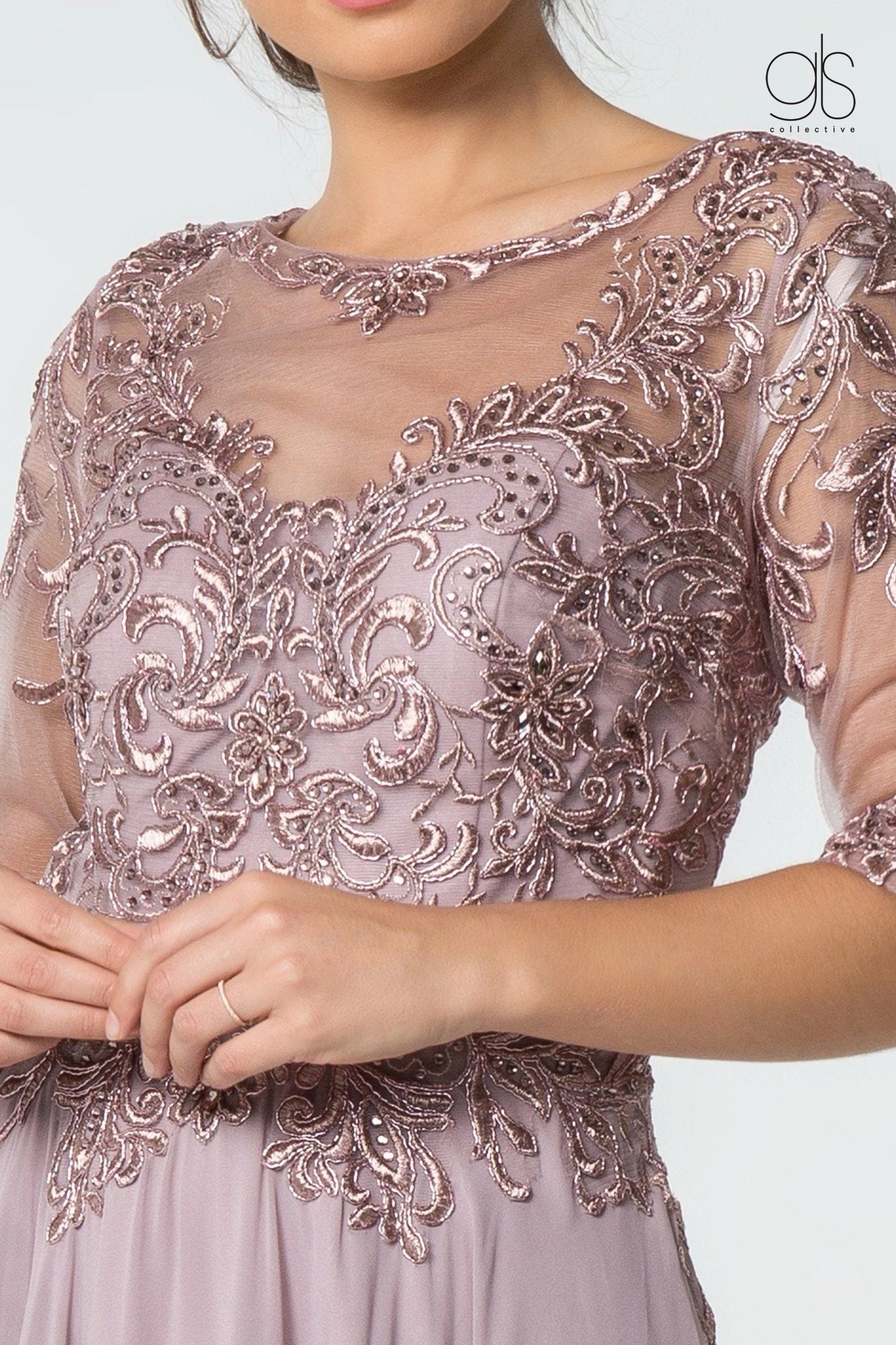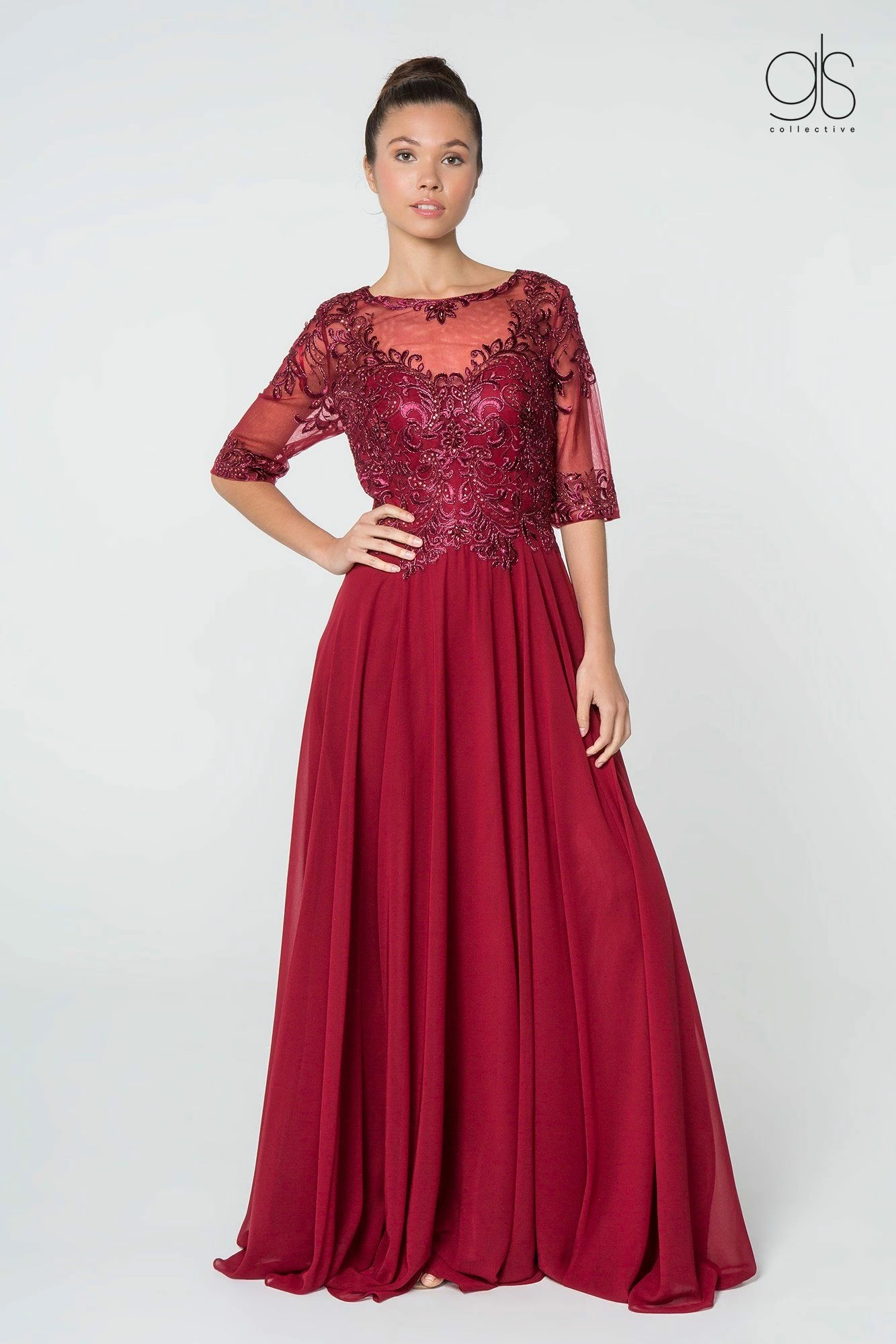 Look modest chic in this embroidered bodice illusion gown with mid sleeves by Elizabeth K GL2812.