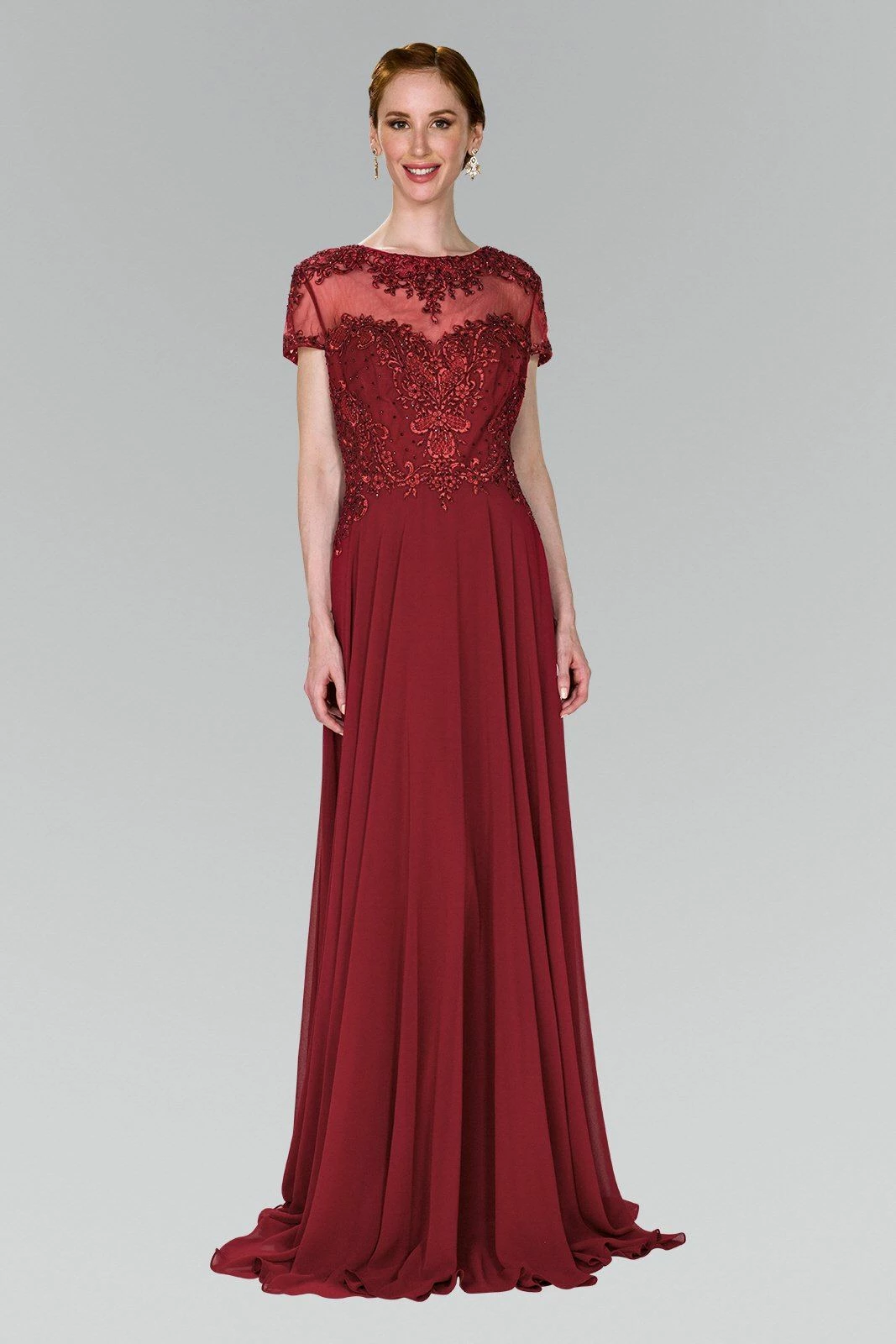 Light up the room in this bead embroidered long chiffon dress with short sleeves by Elizabeth K GL2406. This long evening gown features a bateau neckline, sheer short-sleeved bodice with beautiful beaded embroidery, sheer embellished back, full length skirt that elegantly flows to the floor, and a zipper closure. Perfect as a Mother of the Bride dress or for any formal event!