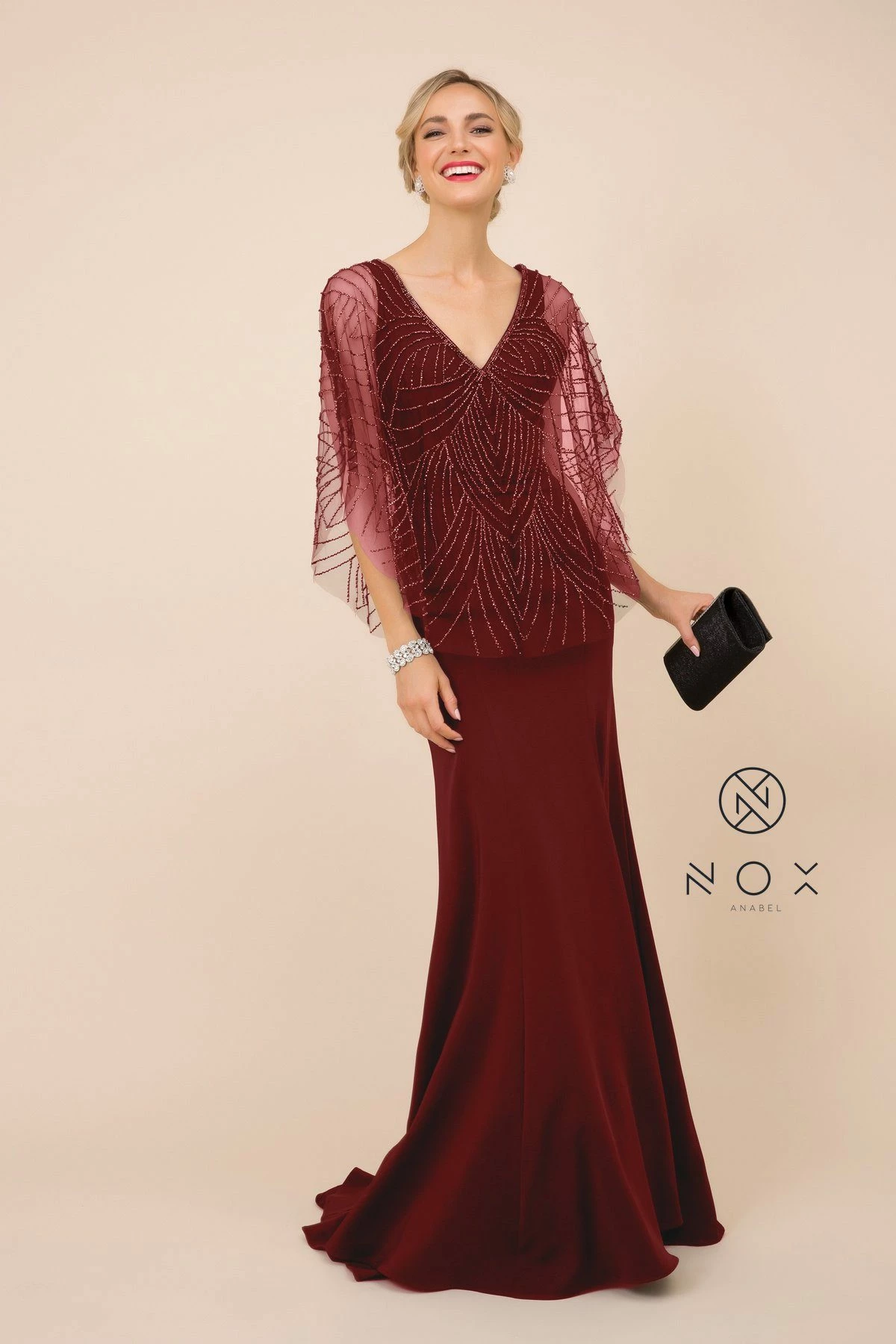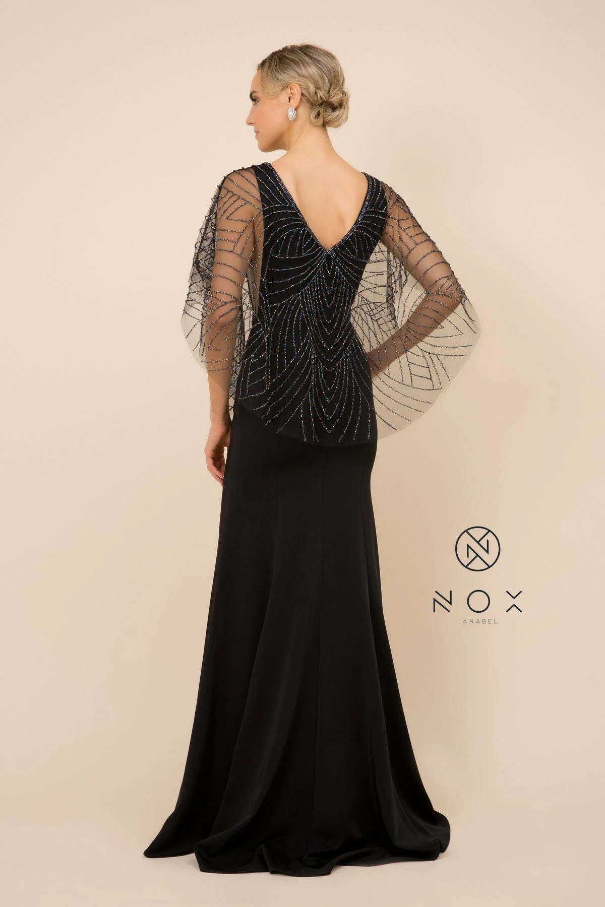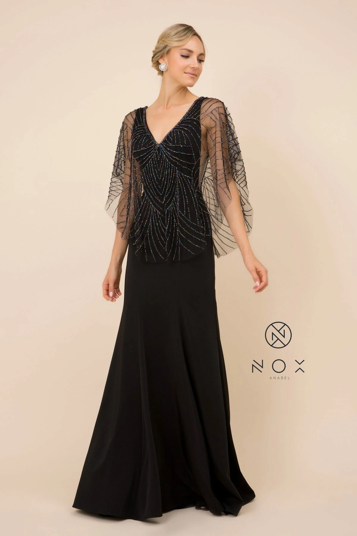 Receive lots of compliments in this long fitted V-neck dress with beaded sheer cape by Nox Anabel Y531.