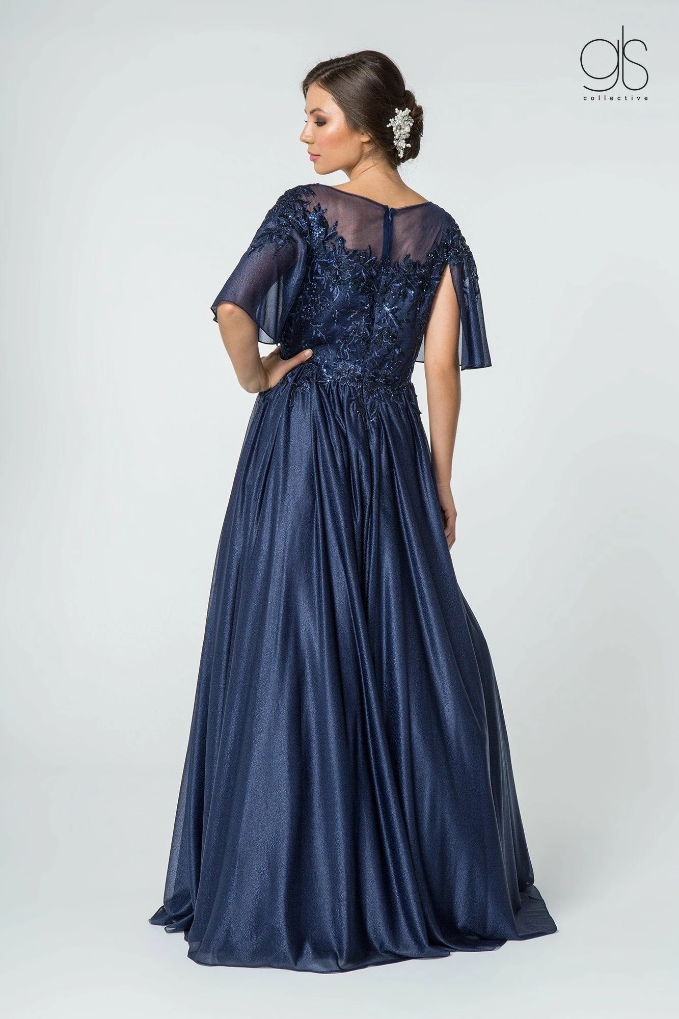 - Flutter-Sleeve Lace Applique Embellished V-Neck Long Dress