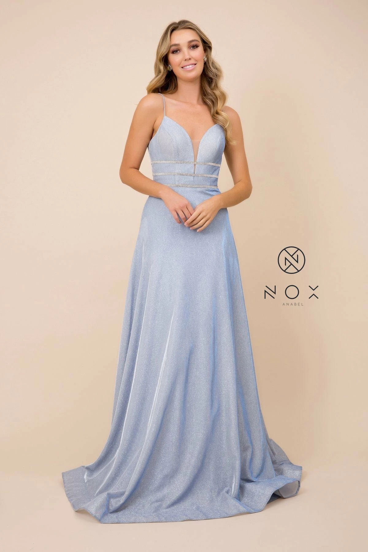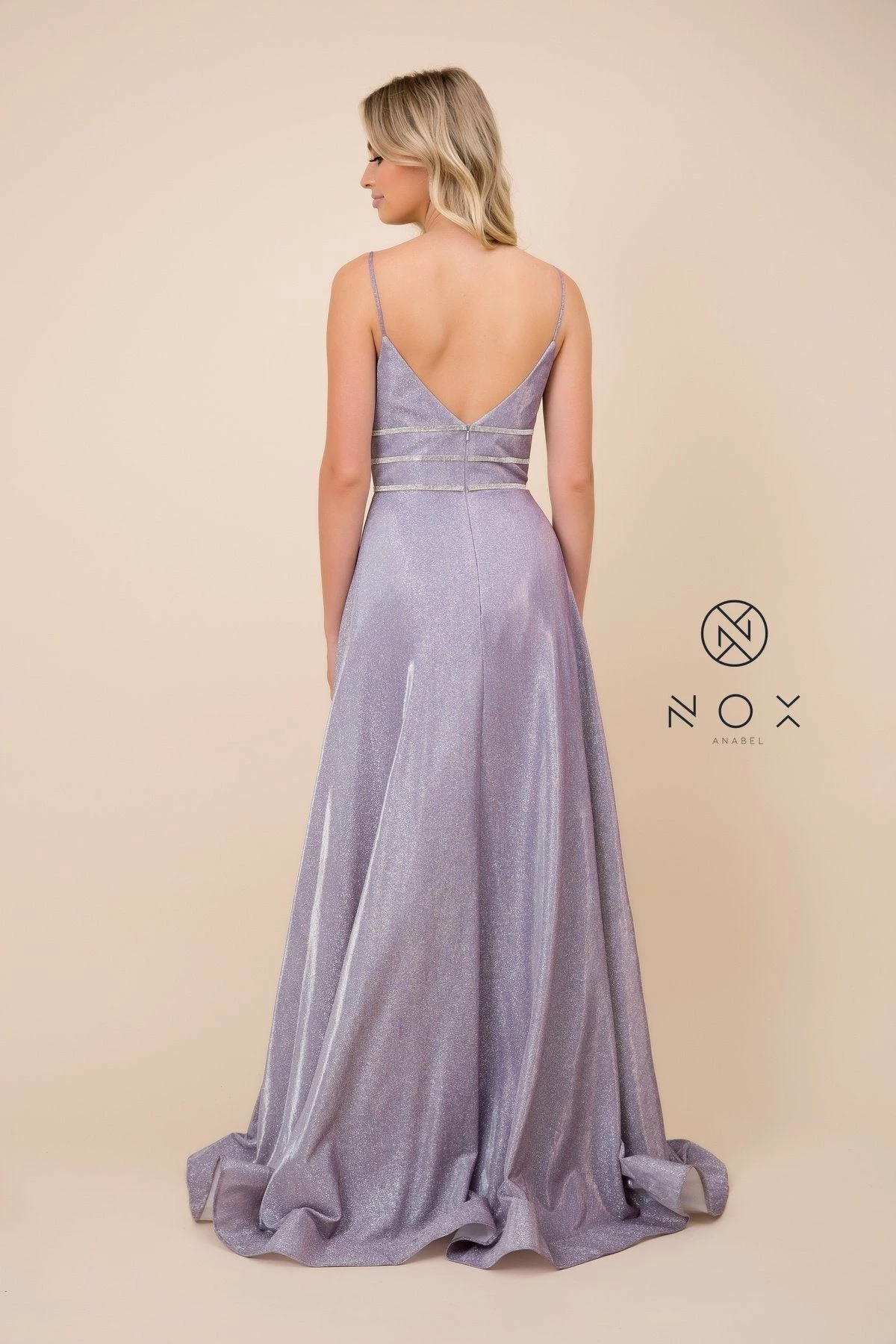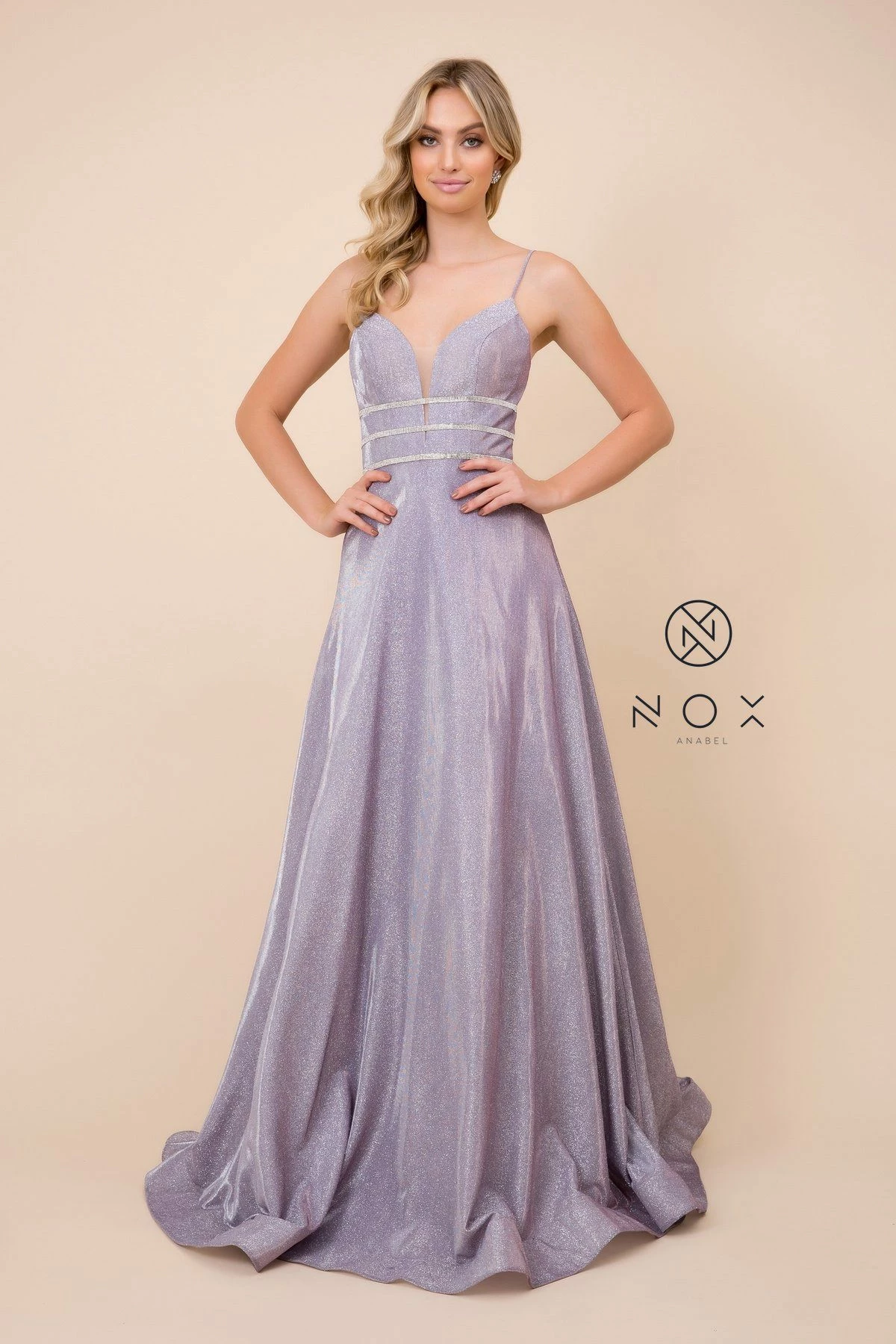 Receive lots of compliments in this long A-line metallic glitter dress with sheer V-neckline by Nox Anabel T312.
