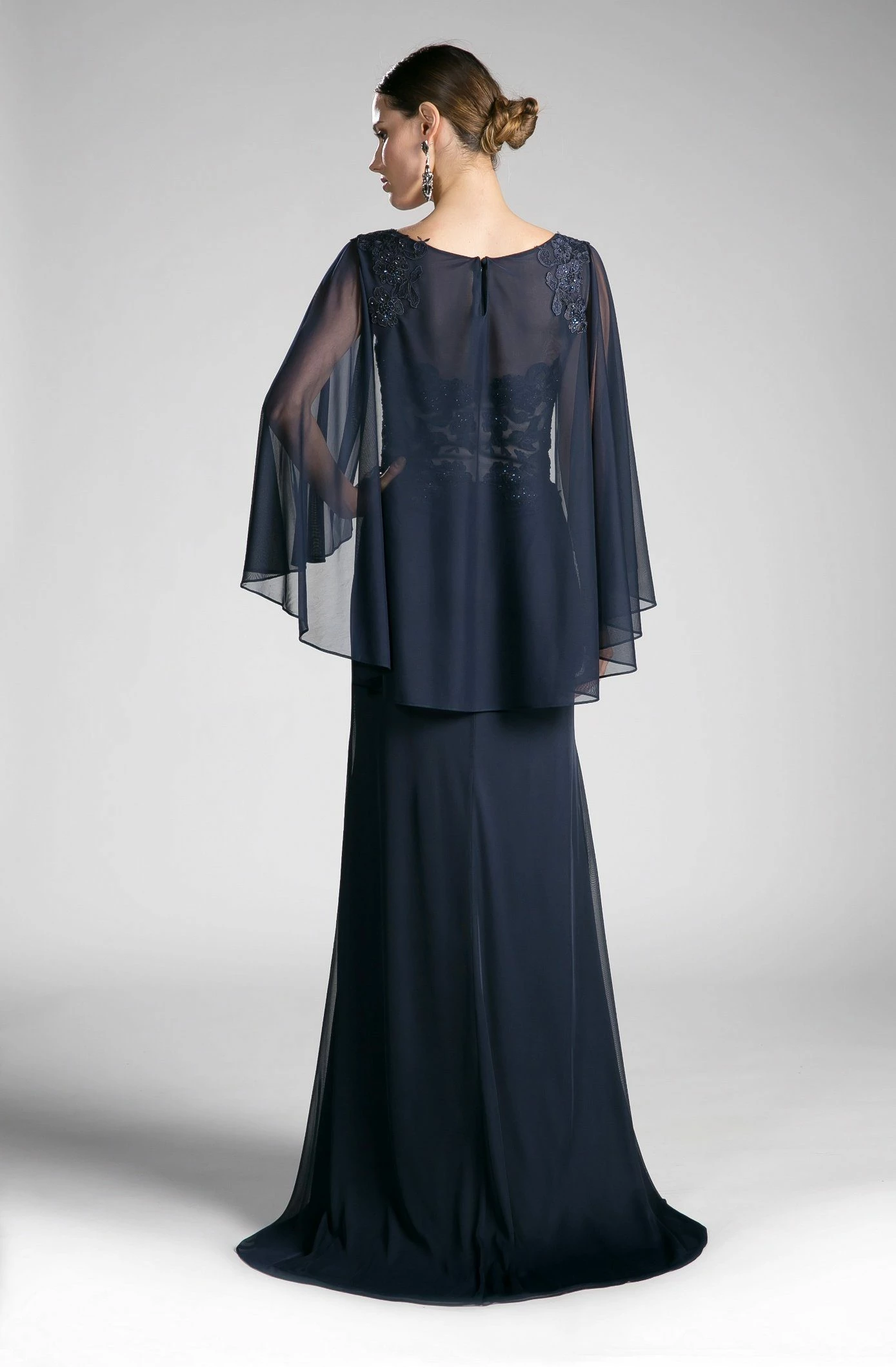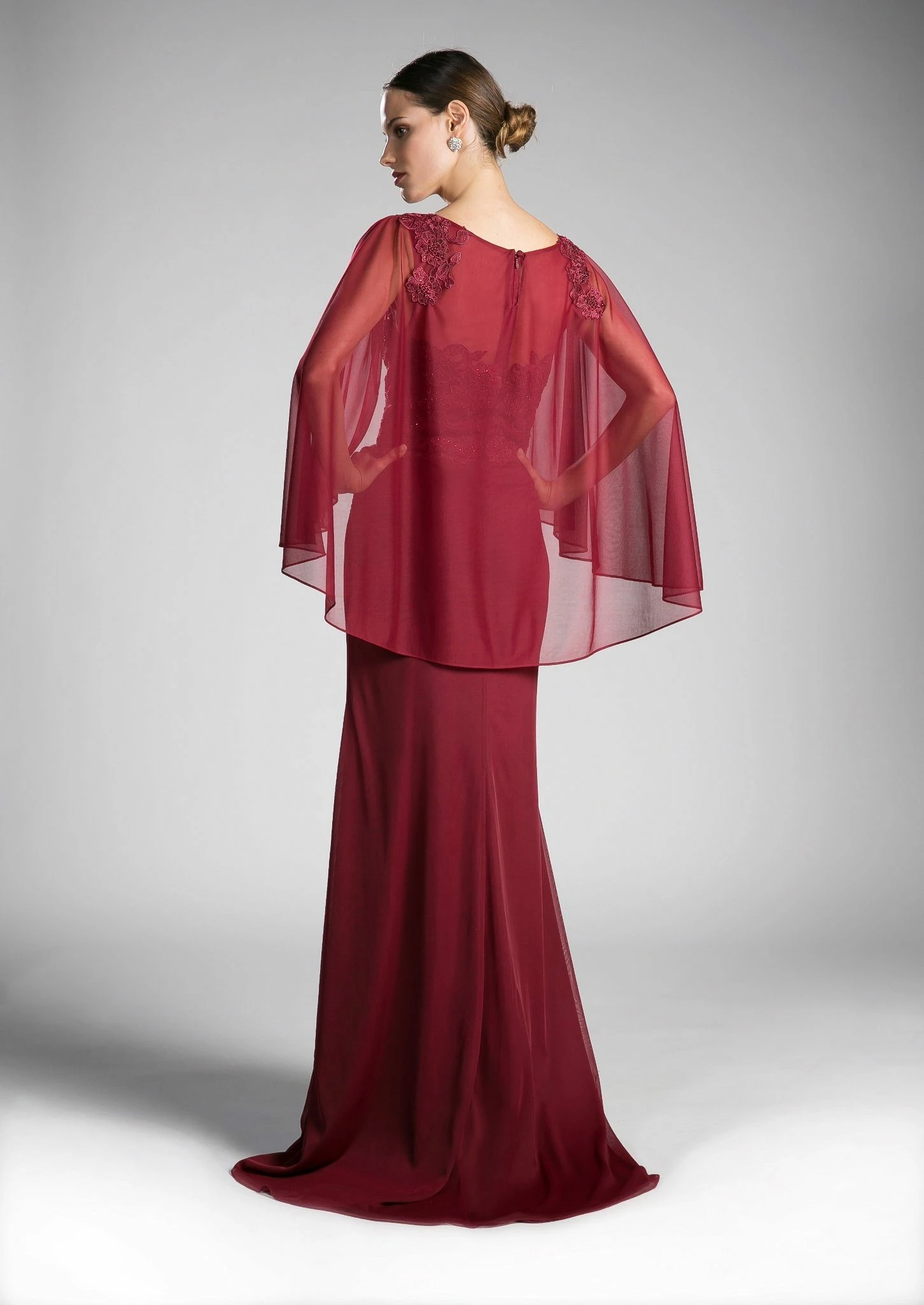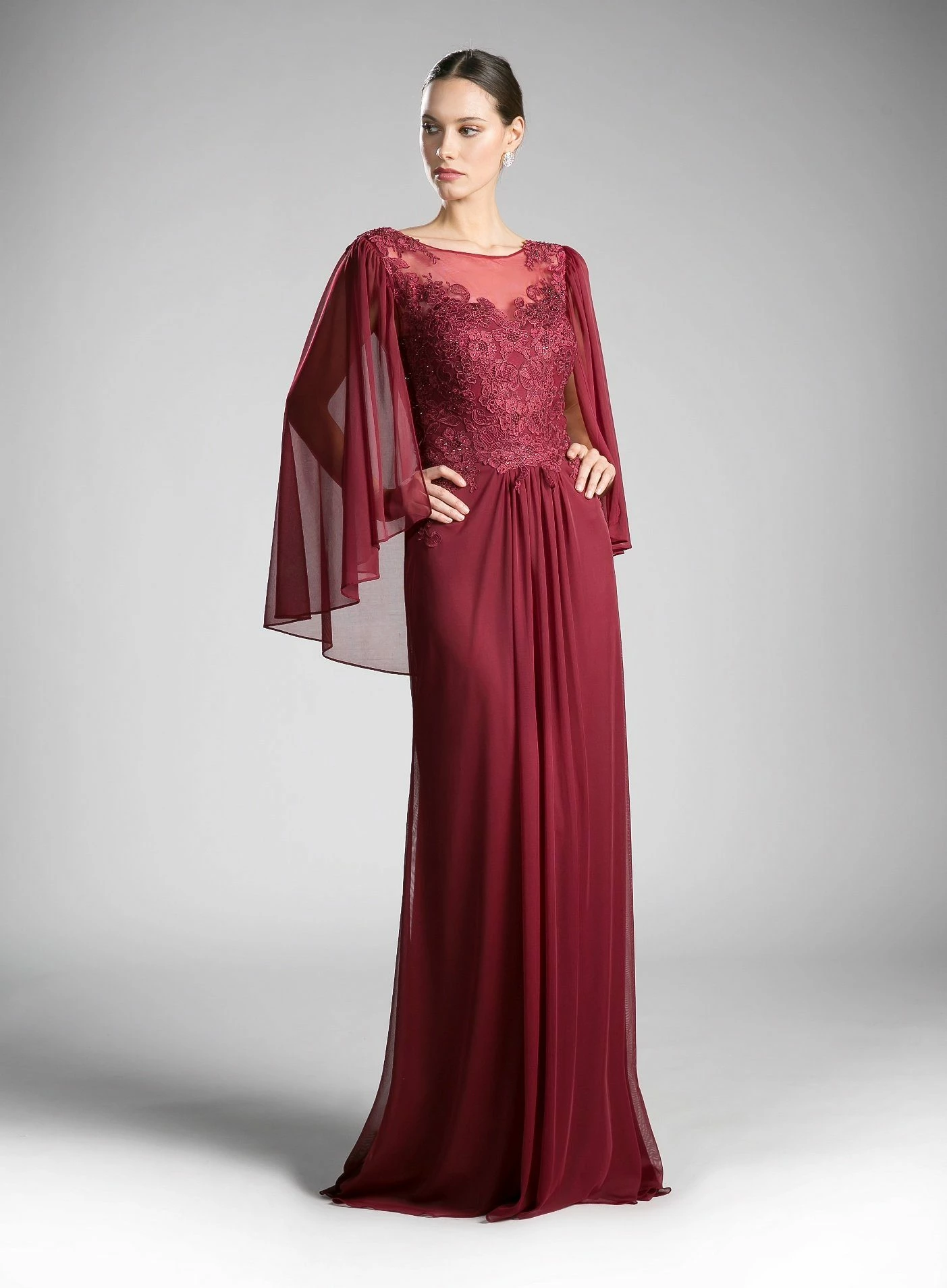 Turn heads in this long cape dress with lace appliqued bodice by Cinderella Divine OC0001. This evening gown features a beautiful illusion sweetheart neckline adorned with beaded lace appliques, a dreamy sheer cape, enclosed beaded back, a floor length A-line skirt with small train, and a zipper closure.