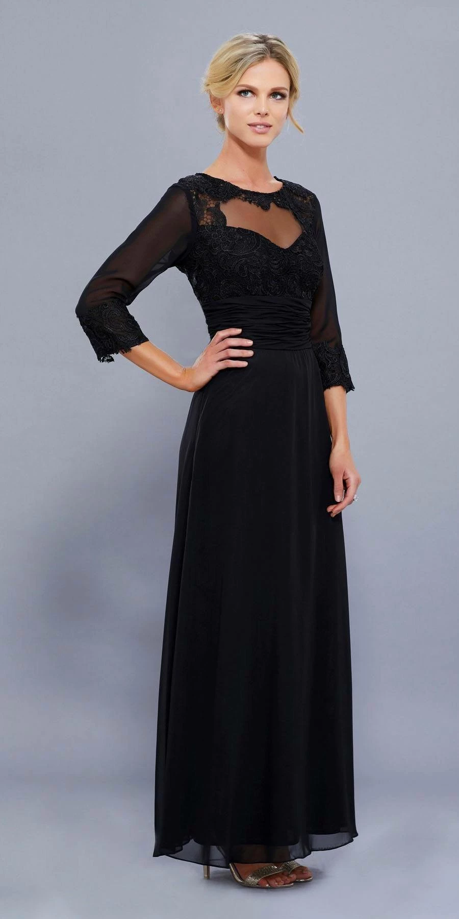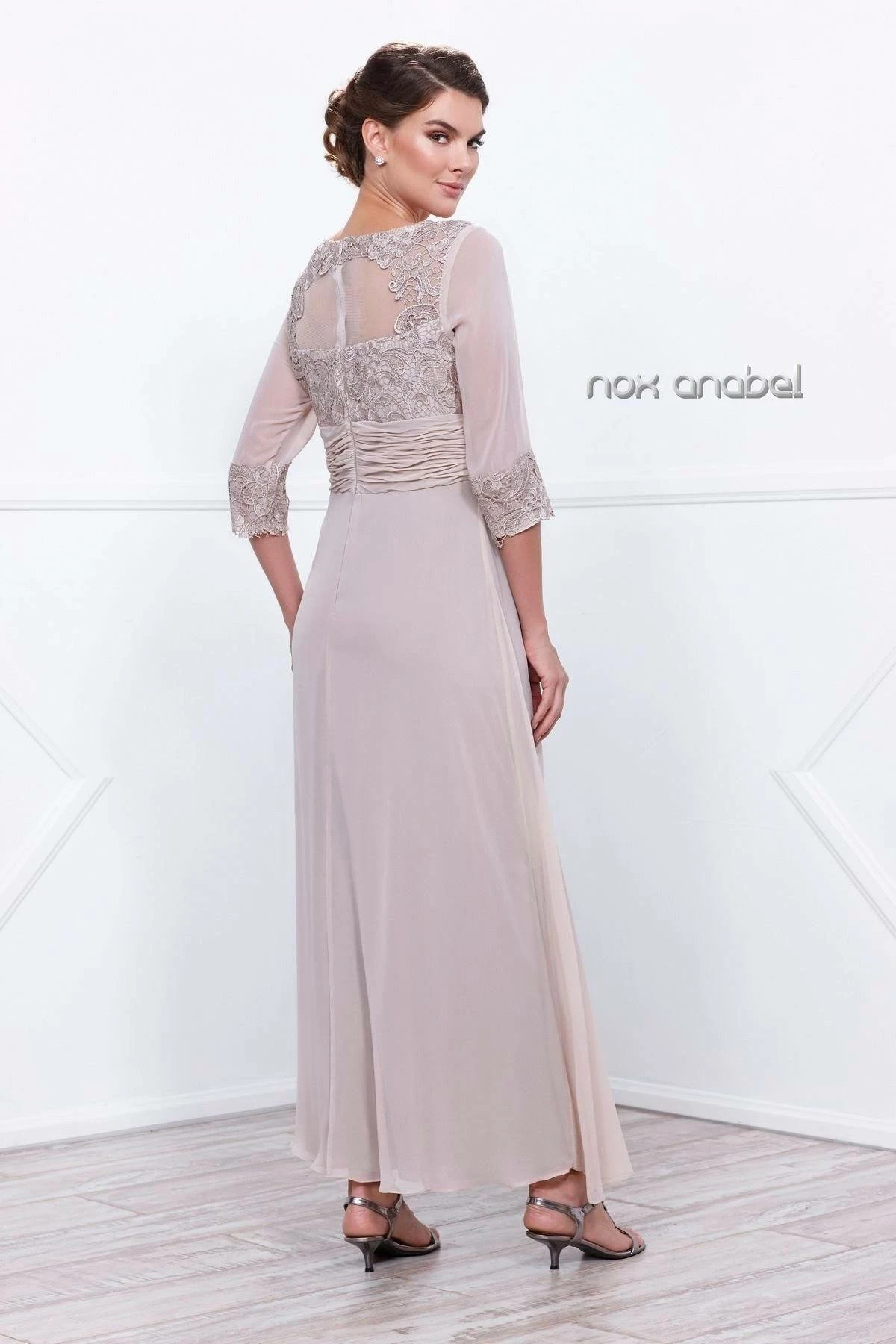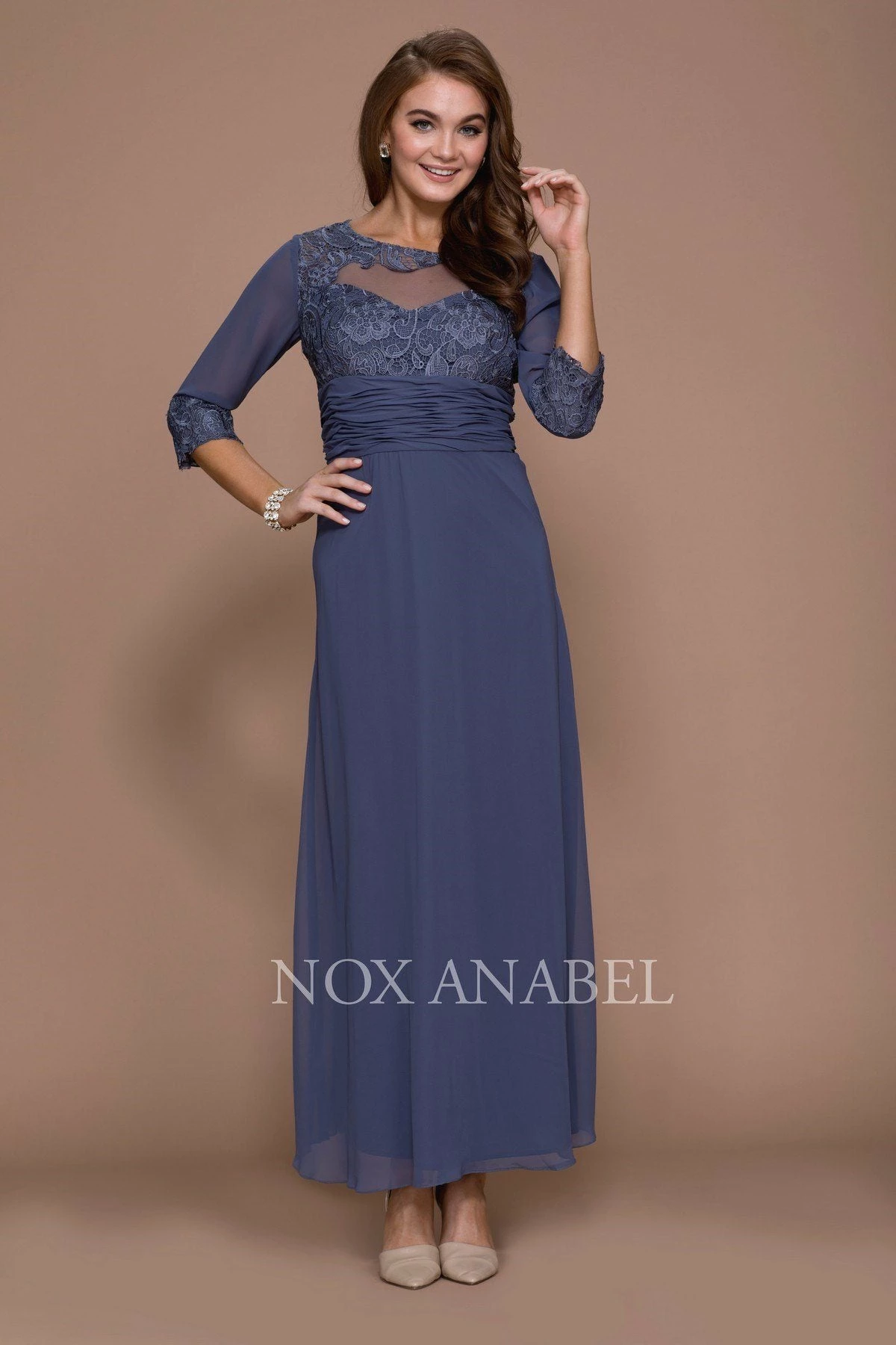 Light up the room in this long lace bodice illusion dress with three-quarter sleeves by Nox Anabel 5101. This long evening gown features a high-neck sleeved bodice with beautiful lace embroidery, sheer illusion neckline, ruched waistband, sheer embellish back, full length skirt that elegantly flows, and a zipper closure. Perfect as a Mother of the Bride dress or for any formal event!