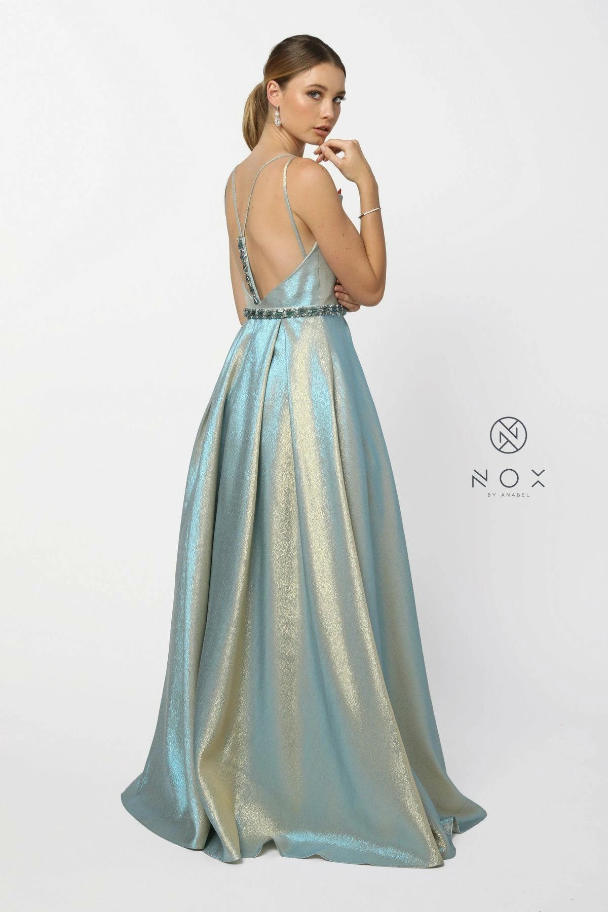 Look magical in this long iridescent metallic glitter dress with illusion plunging V-neckline by Nox Anabel M271.