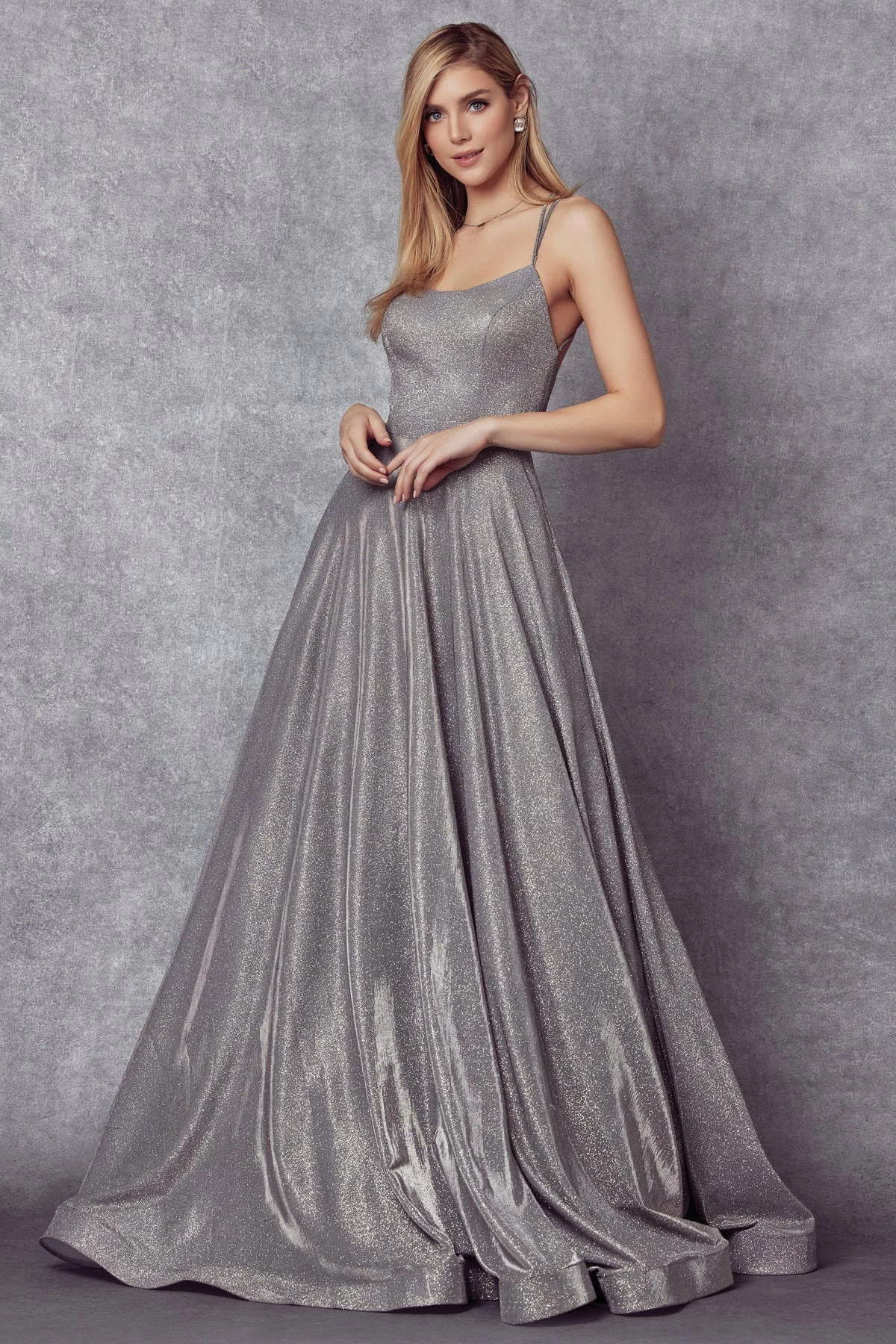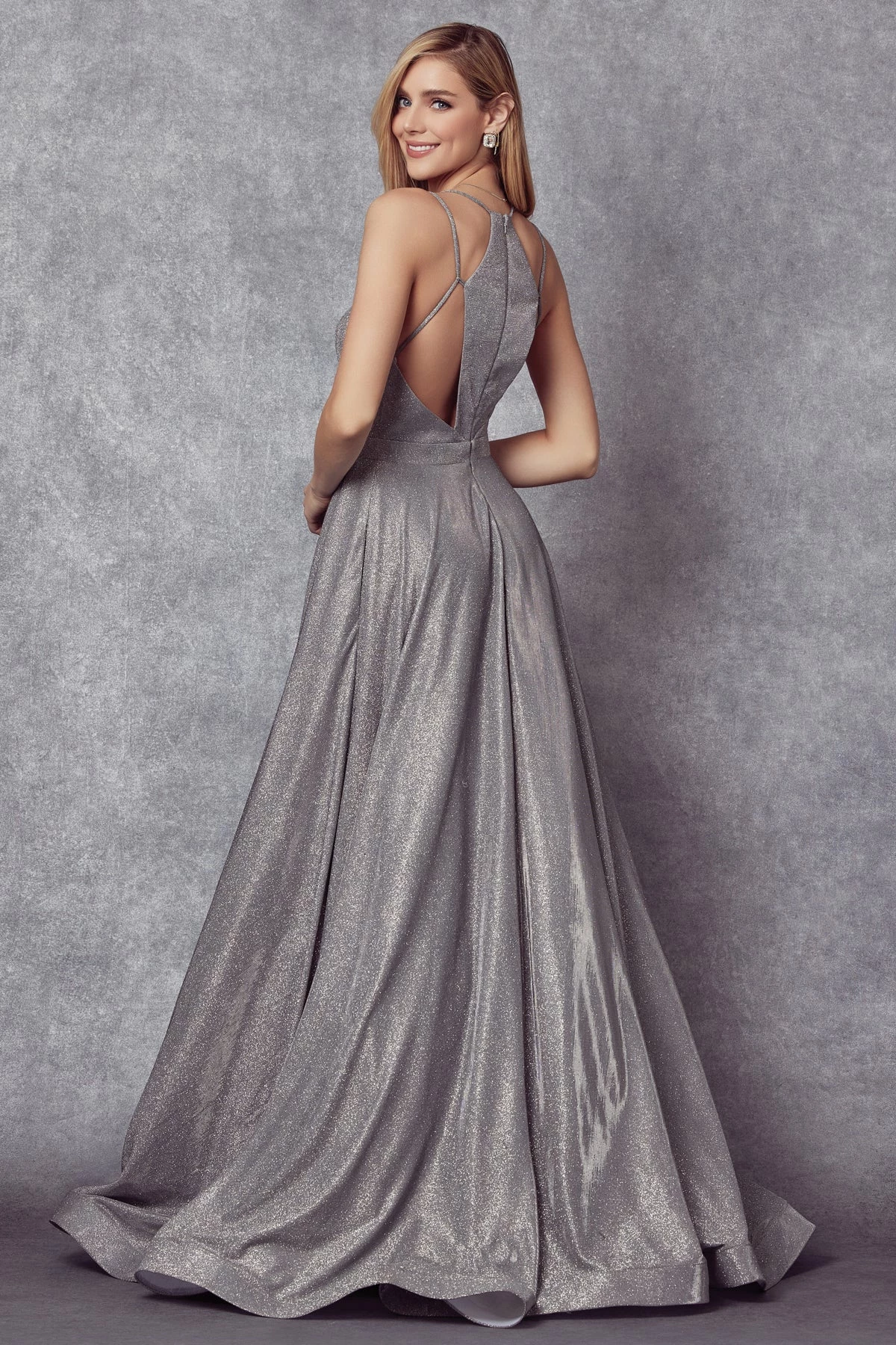 Shimmer and shine in this long metallic glitter sleeveless A-line style dress with sweep train by Juliet 203. This full body metallic glitter tulle with scoop neckline has side pockets and beautiful sweep train that will surely turn heads.