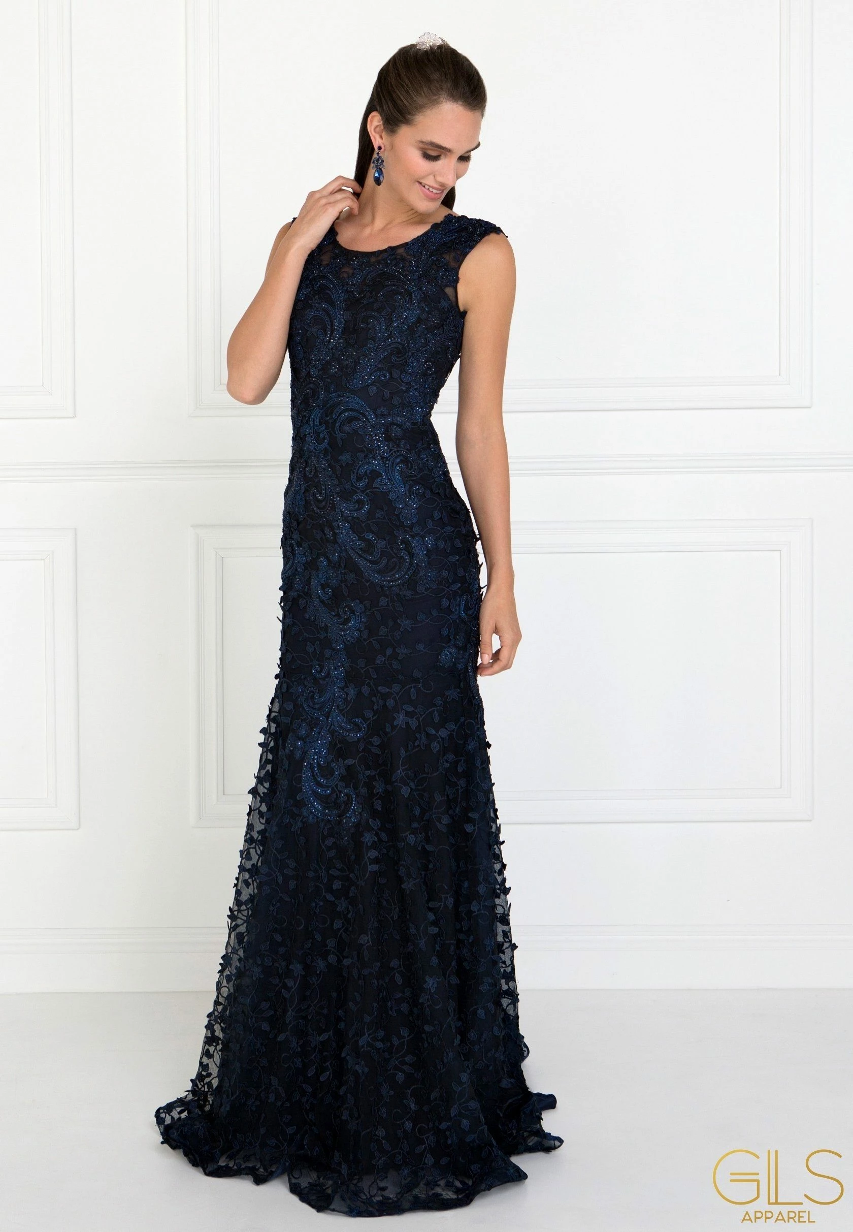 Look and feel beautiful in this long sleeveless navy blue dress with floral appliques by Elizabeth K GL1529. Sleeveless tulle full length dress with a scoop neckline with a mermaid silhouette. Has a drop V-neck open back with zipper close and bold full pedal embroidery work through out. Perfect for any formal event!