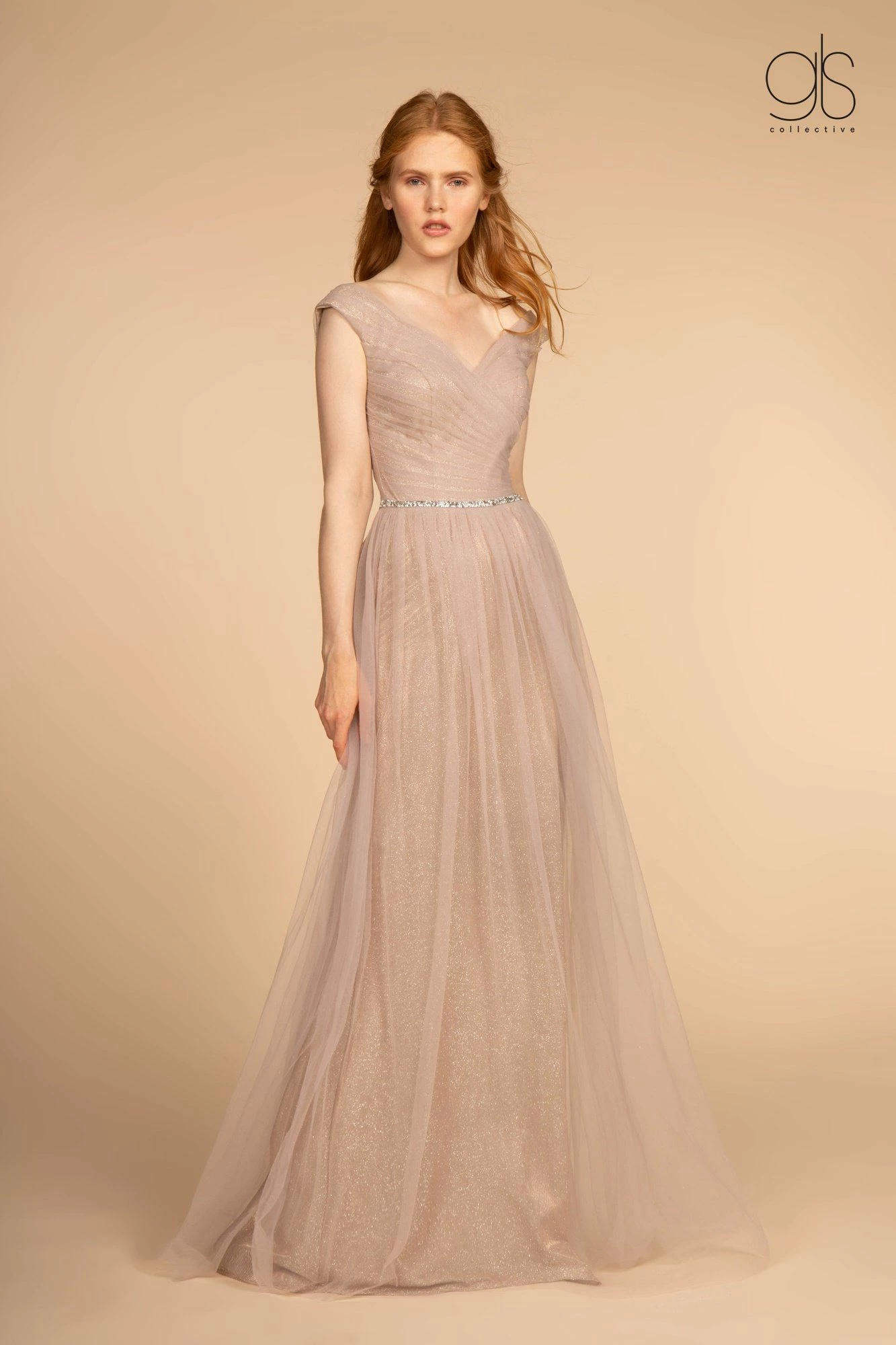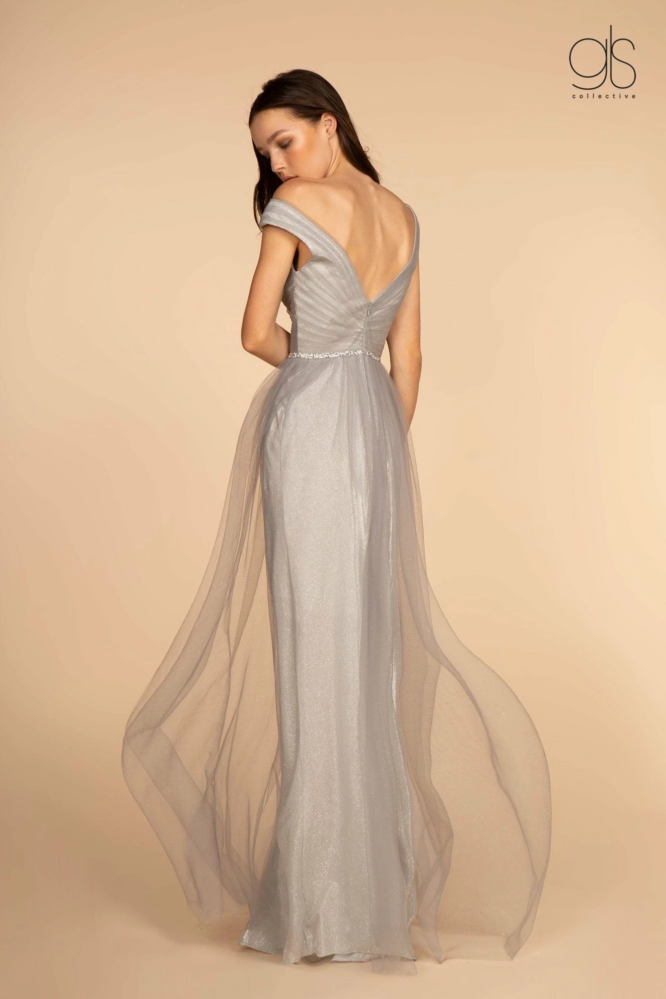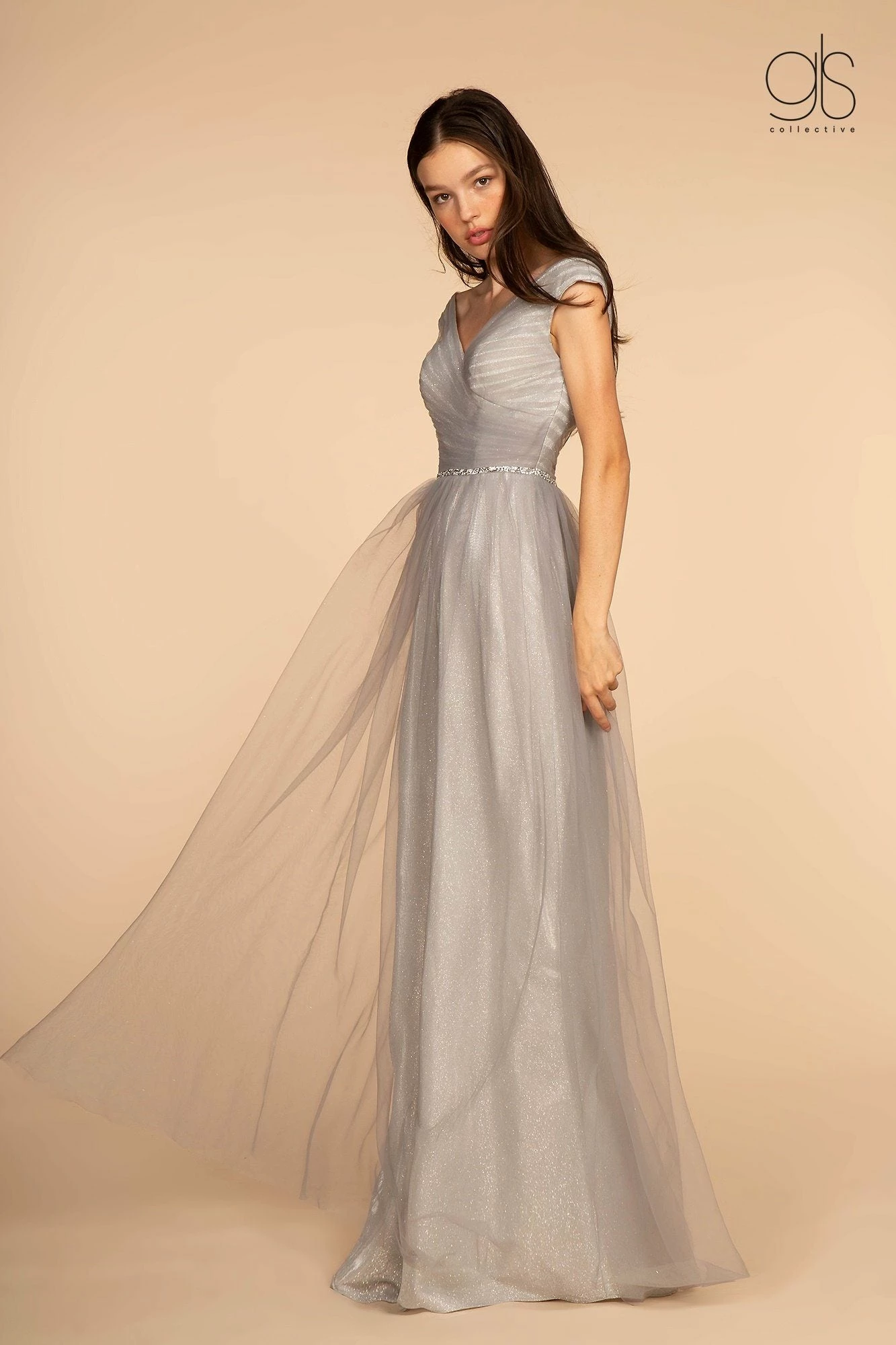 - Mesh Ruched Jewel V-Neck Long Dress