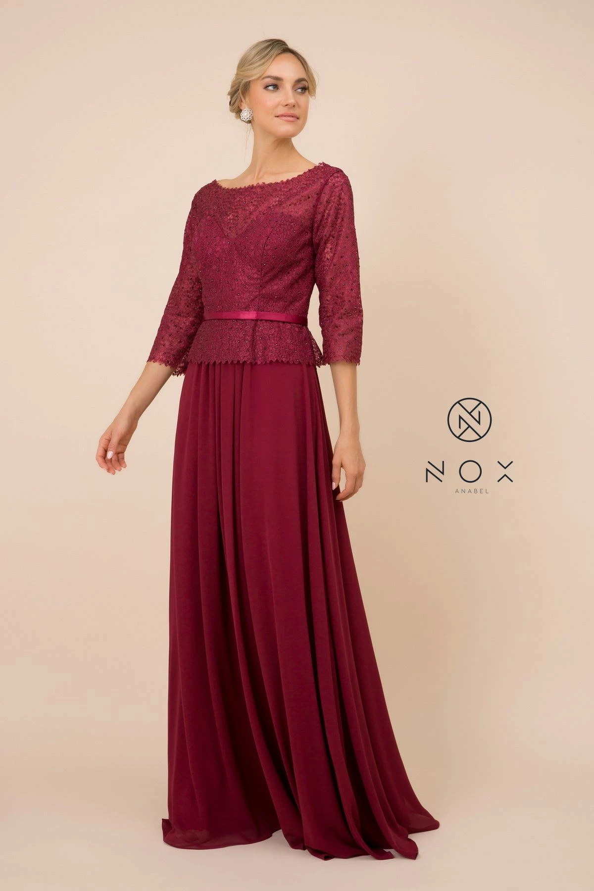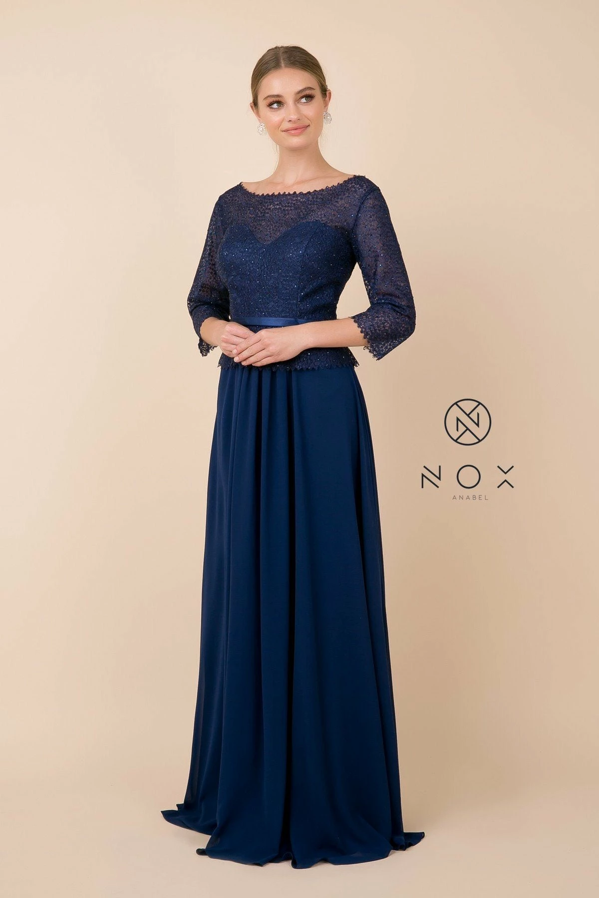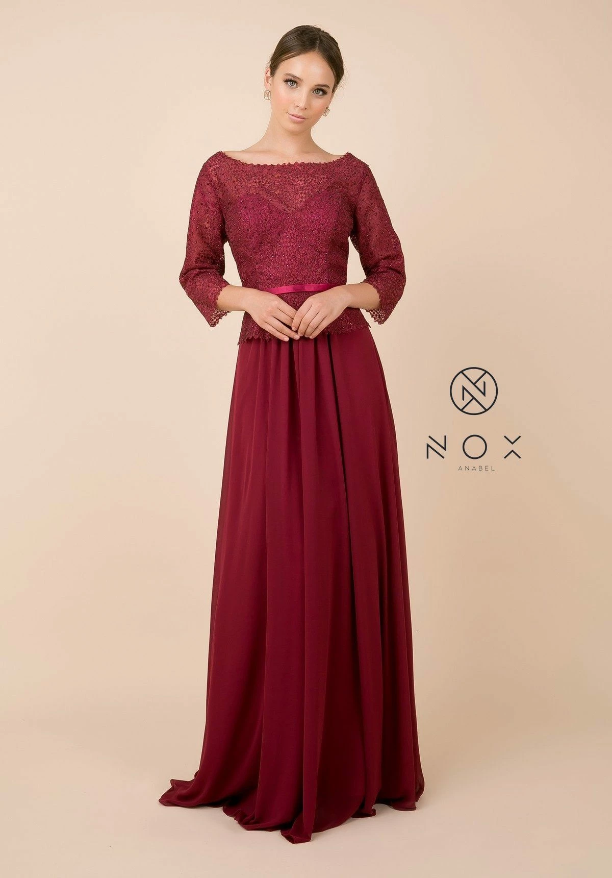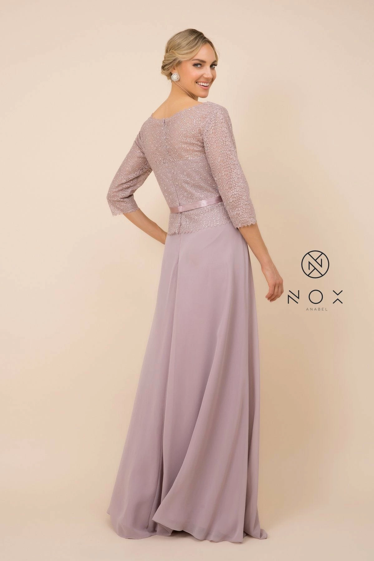 Look picture-perfect in this long lace bodice dress with sheer three-quarter length sleeves by Nox Anabel M520.