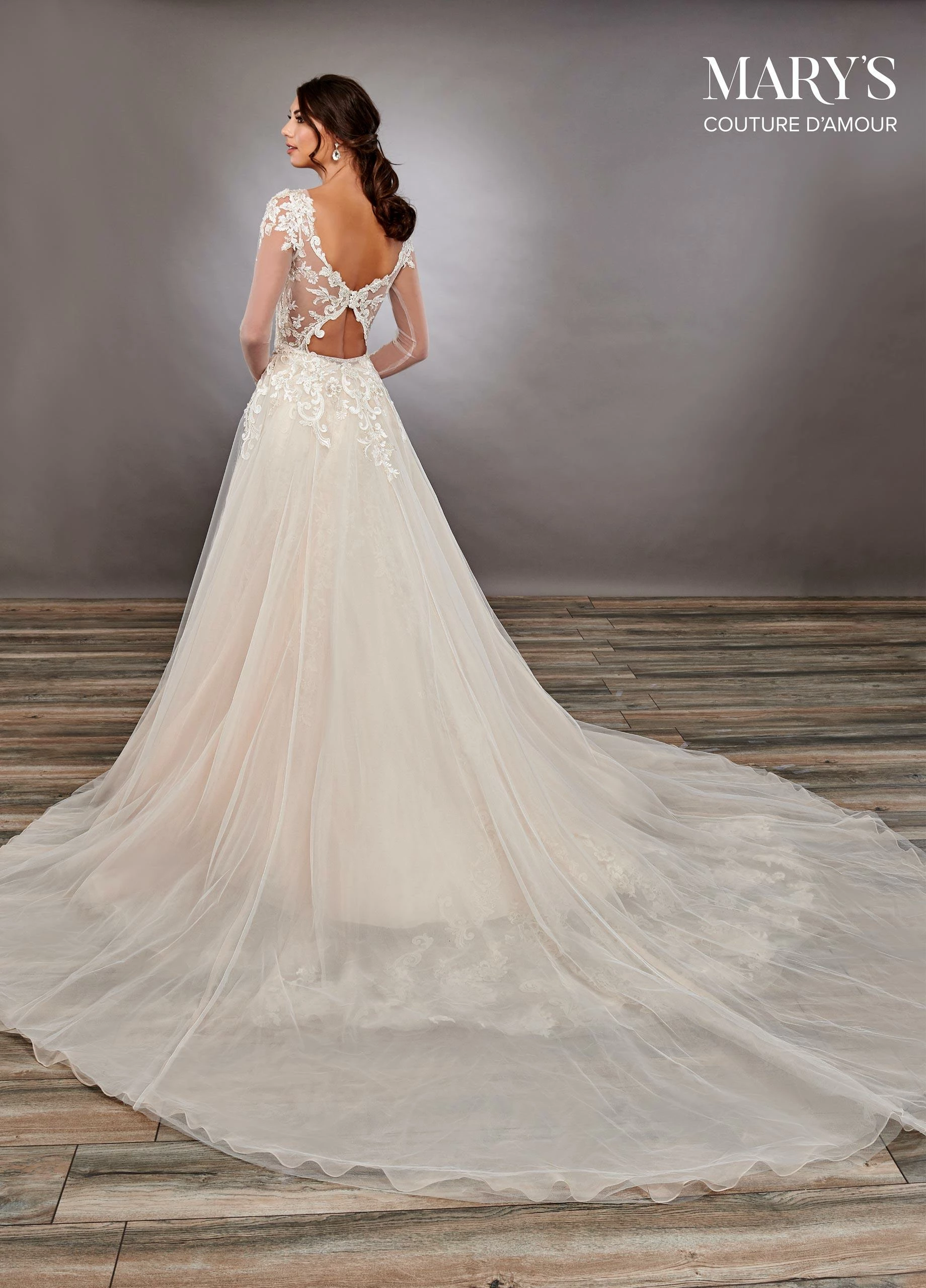Make lasting memories in this sheer long sleeve wedding dress with mermaid skirt by Mary’s Bridal Couture D’amour Collection MB4081. Timeless fit and flare lace applique wedding/bridal dress with sheer full length sleeves, a plunging front neckline and romantic back keyhole. The gown features a detachable semi cathedral tulle overlay train with a crystal beaded waistband with button closure. The matching overskirt is included.