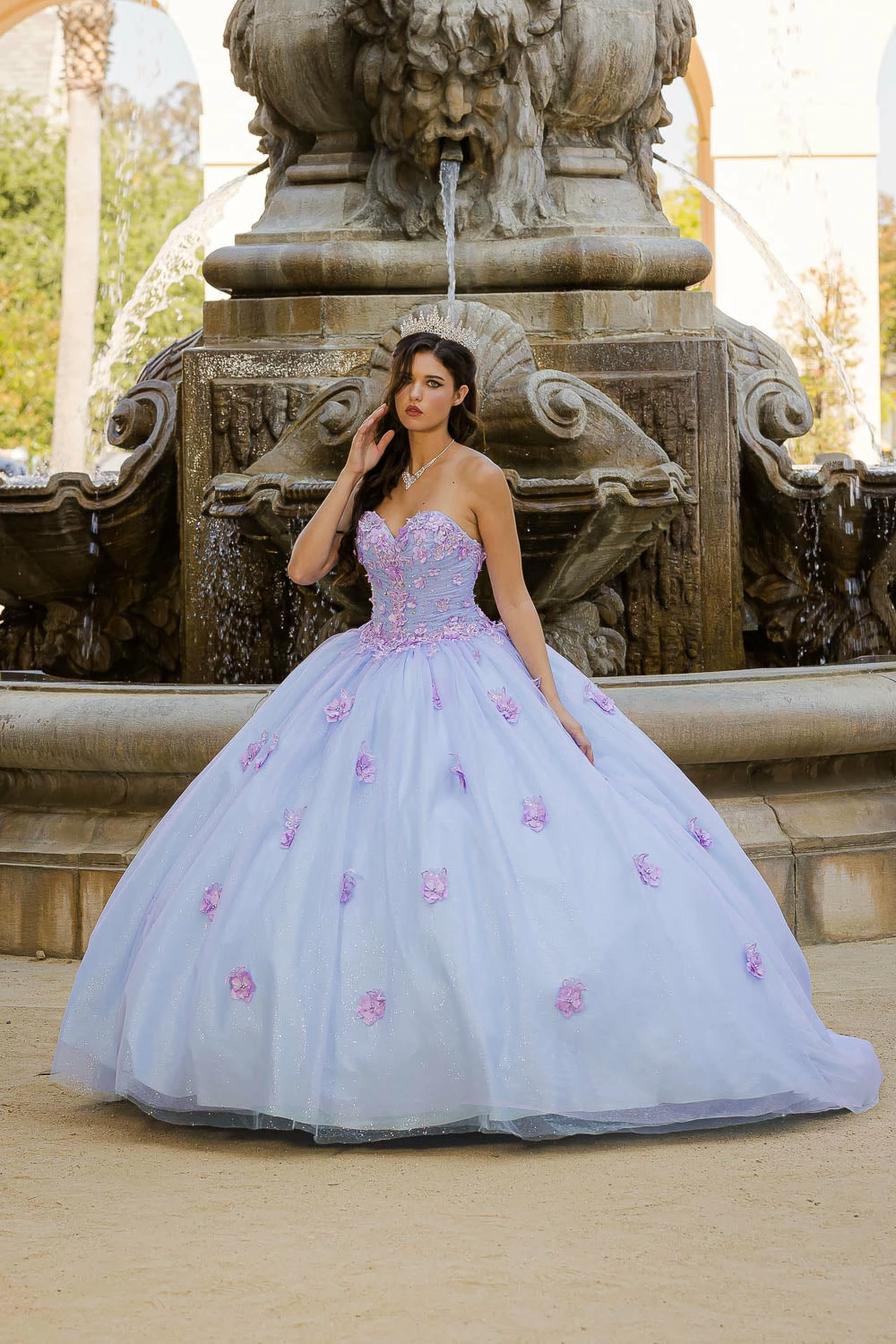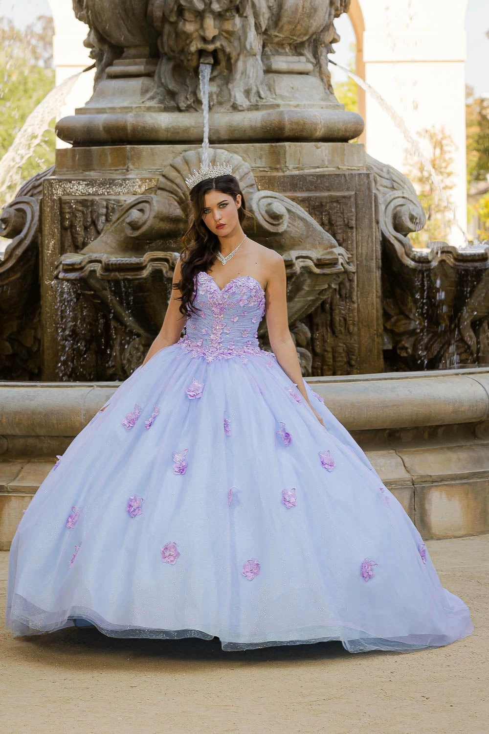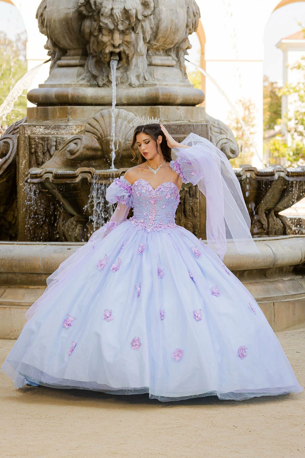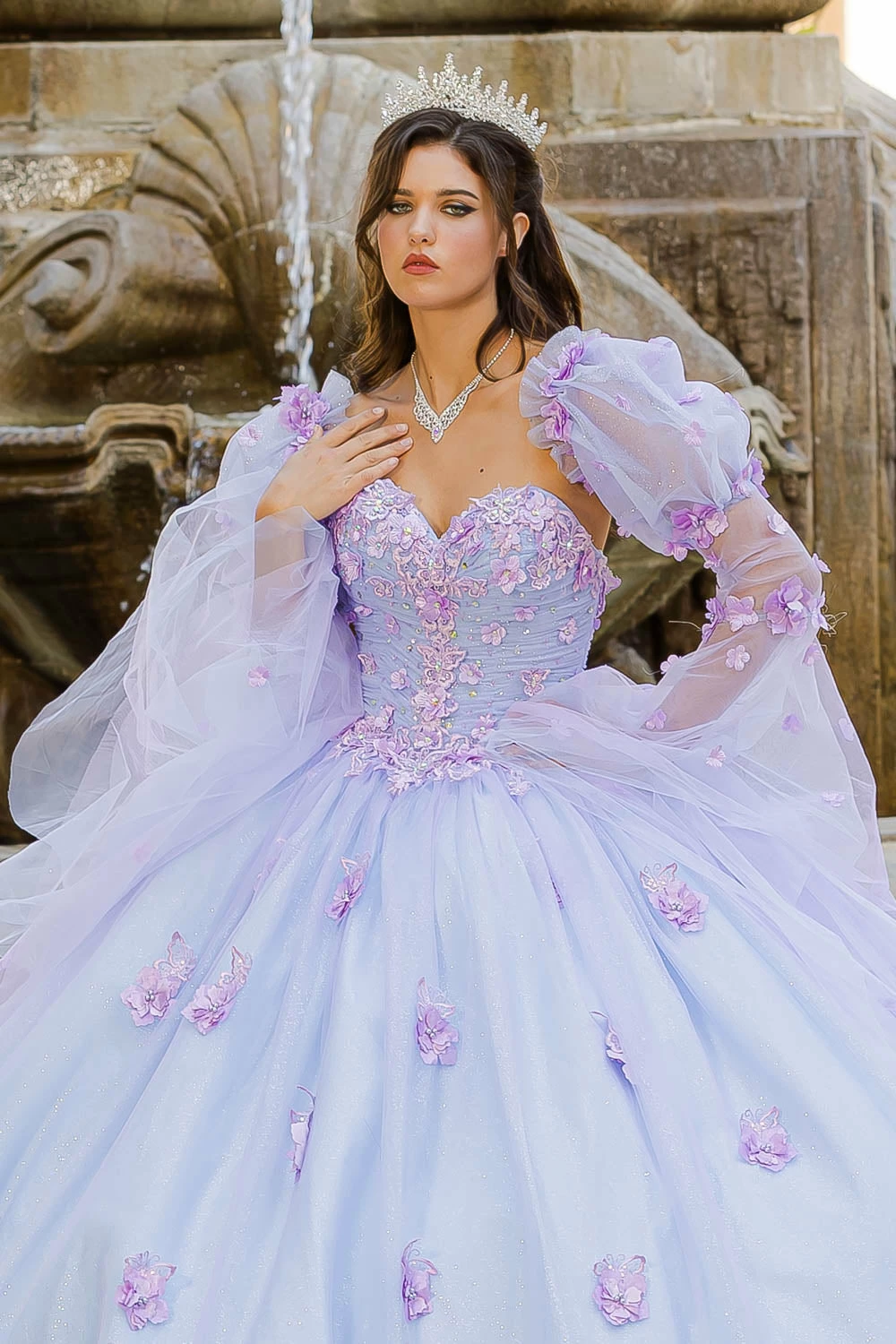 All eyes will be on you in this 3D floral and butterfly long puff sleeve strapless two-tone dress with A-line skirt by Petite Adele PQ1035. This beautiful ballgown features glitter tulle, gemstones on the bodice, a sweetheart neckline, and detachable long sleeves. The back of the dress is finished with a lower back hidden zipper and a criss-cross lace-up design. The long puff sleeves are removable – giving you a versatile second look!