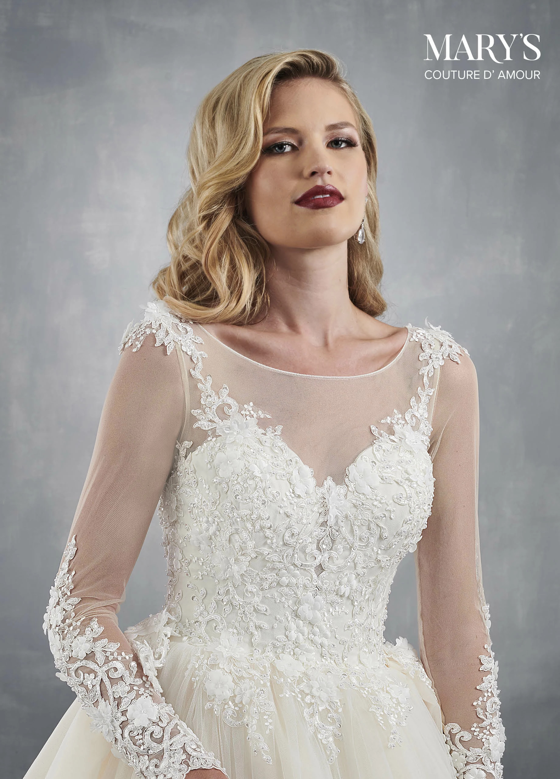 Look unforgettable in this long sleeve wedding dress with A-line skirt by Mary’s Bridal Couture D’amour Collection MB4044. Elaborate tulle wedding/bridal dress with a sweetheart neckline, sheer tulle yoke, full length sleeves, and covered button closure. The bodice and skirt have been accented with crystal beaded lace applique, 3-D flowers, and a matching lace border at the hem. The gown finishes with a sheer semi-cathedral length train.