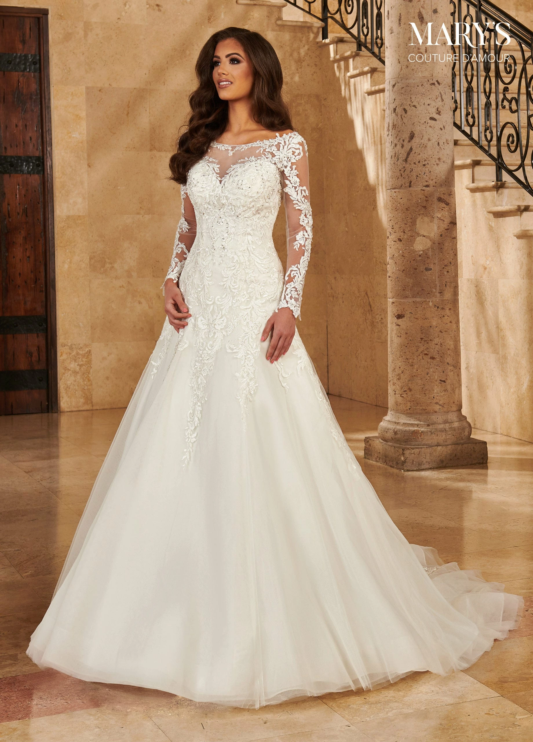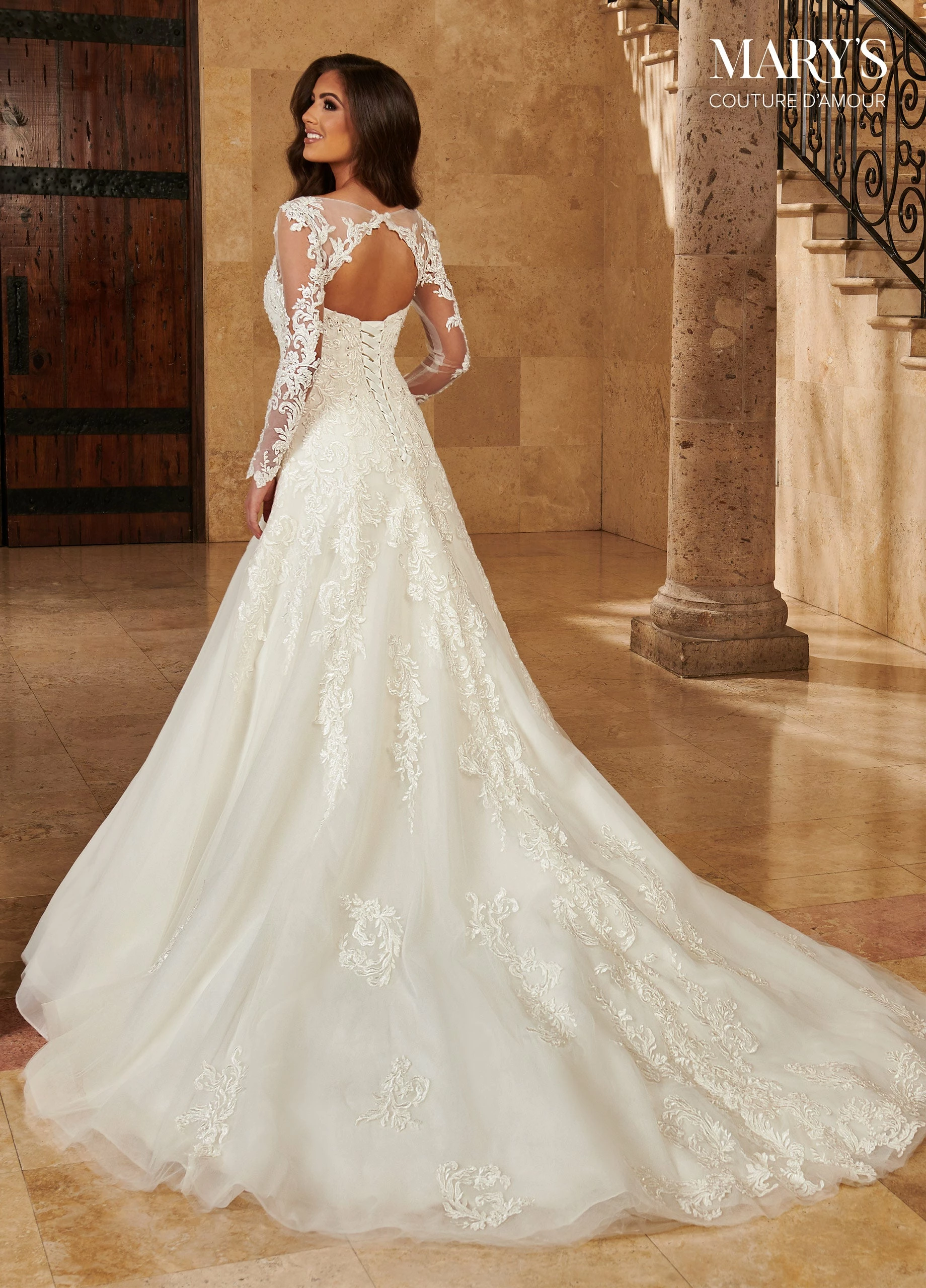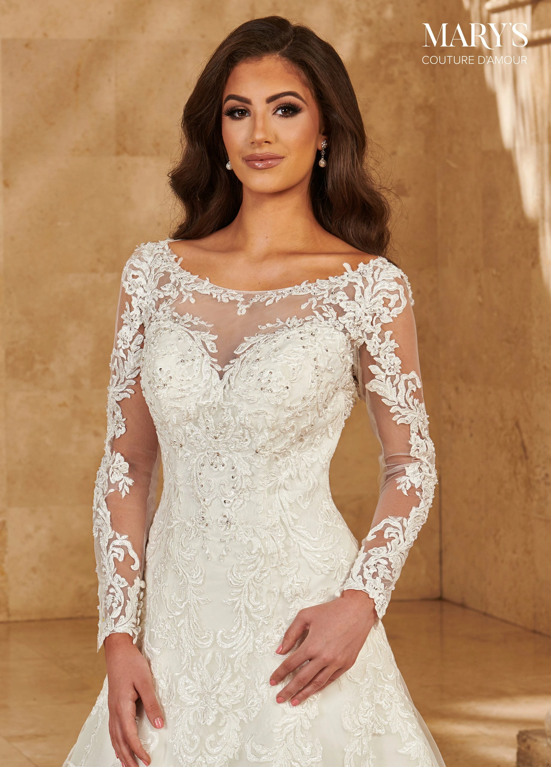 Look unforgettable in this long sleeve wedding dress with A-line skirt by Mary’s Bridal Couture D’amour Collection MB4125. Elaborate tulle wedding/bridal dress with a sweetheart neckline, key hole on the back, full length sleeves, and adjustable lace-up back. The bodice and skirt have been accented with crystal beaded lace applique, and a matching lace border at the hem. The gown finishes with a chapel train train.