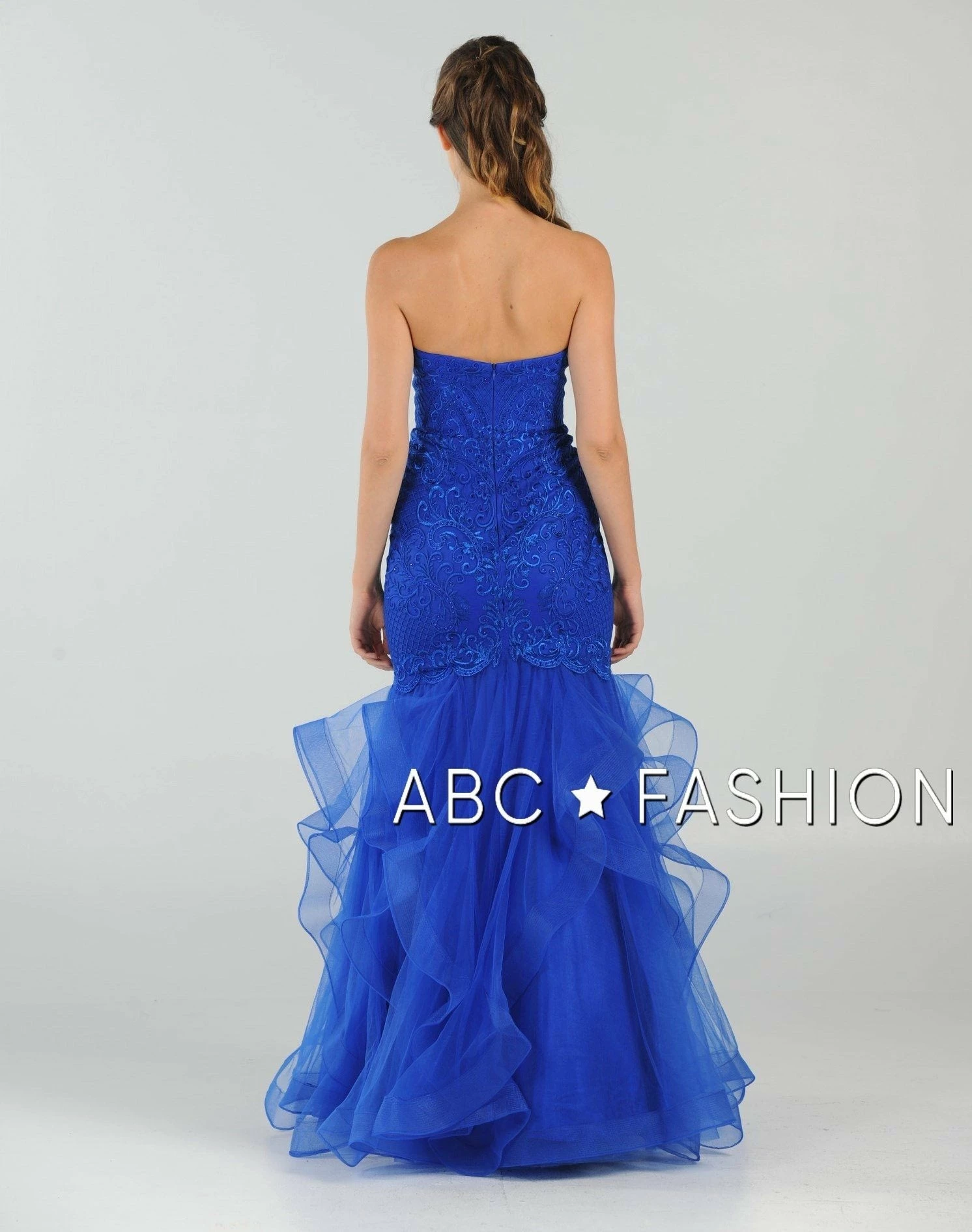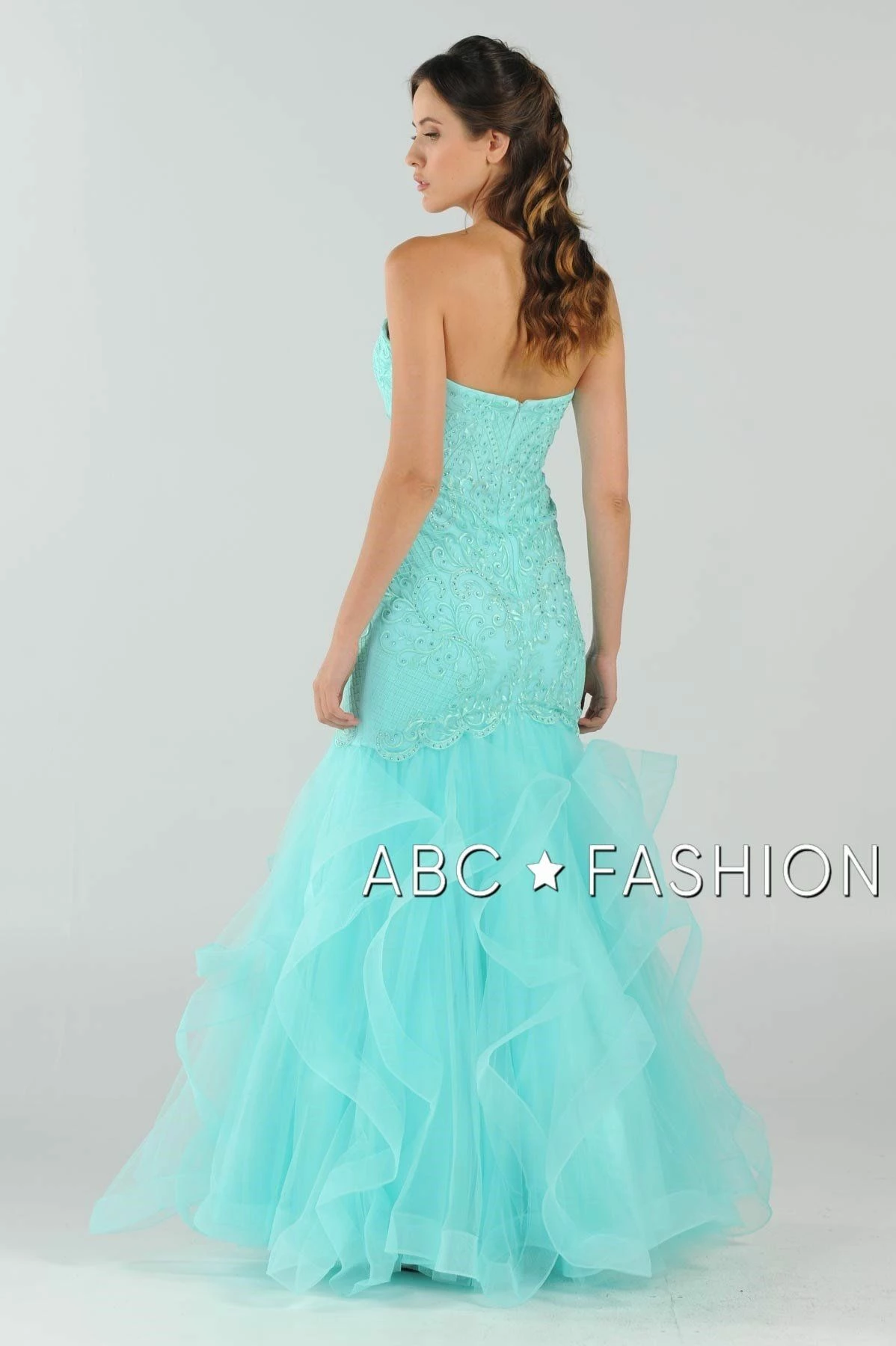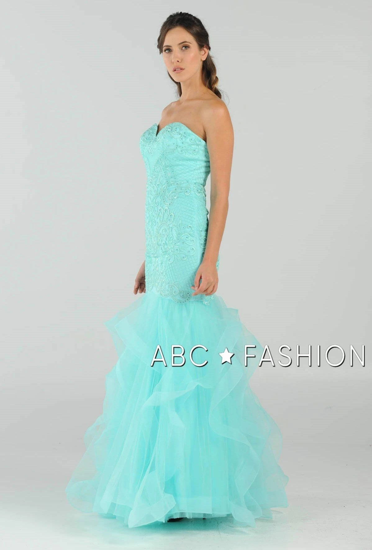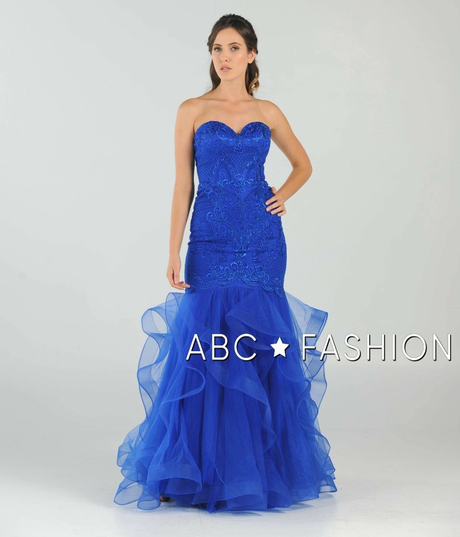 Look picture-perfect in this strapless sweetheart mermaid gown with tiered skirt by Poly USA 8198. Stunning mermaid mesh dress features a strapless sweetheart bodice embellished with embroidery and rhinestones, floor length tiered skirt with horsehair hemline ruffles, and a zipper closure. Affordably priced under $270, this dress is perfect for any formal event and will keep you on budget!