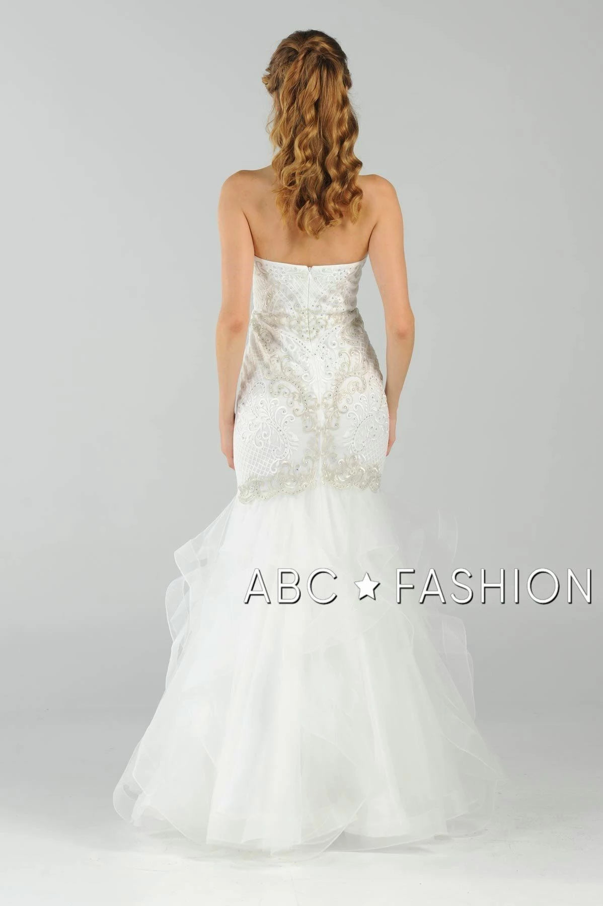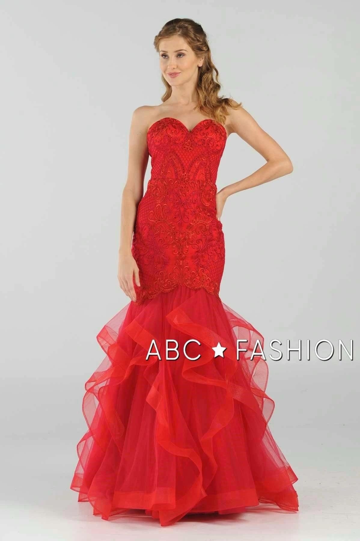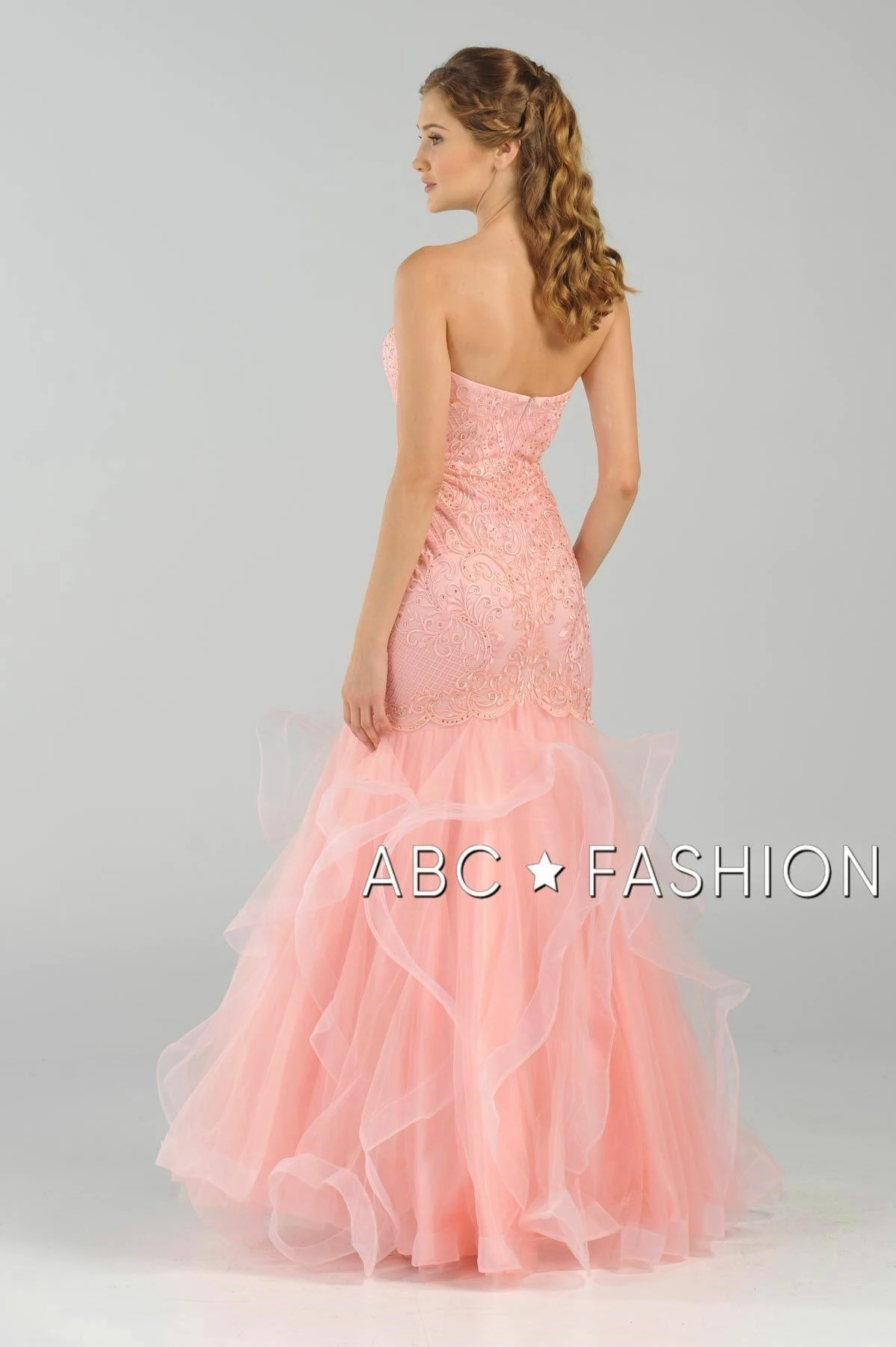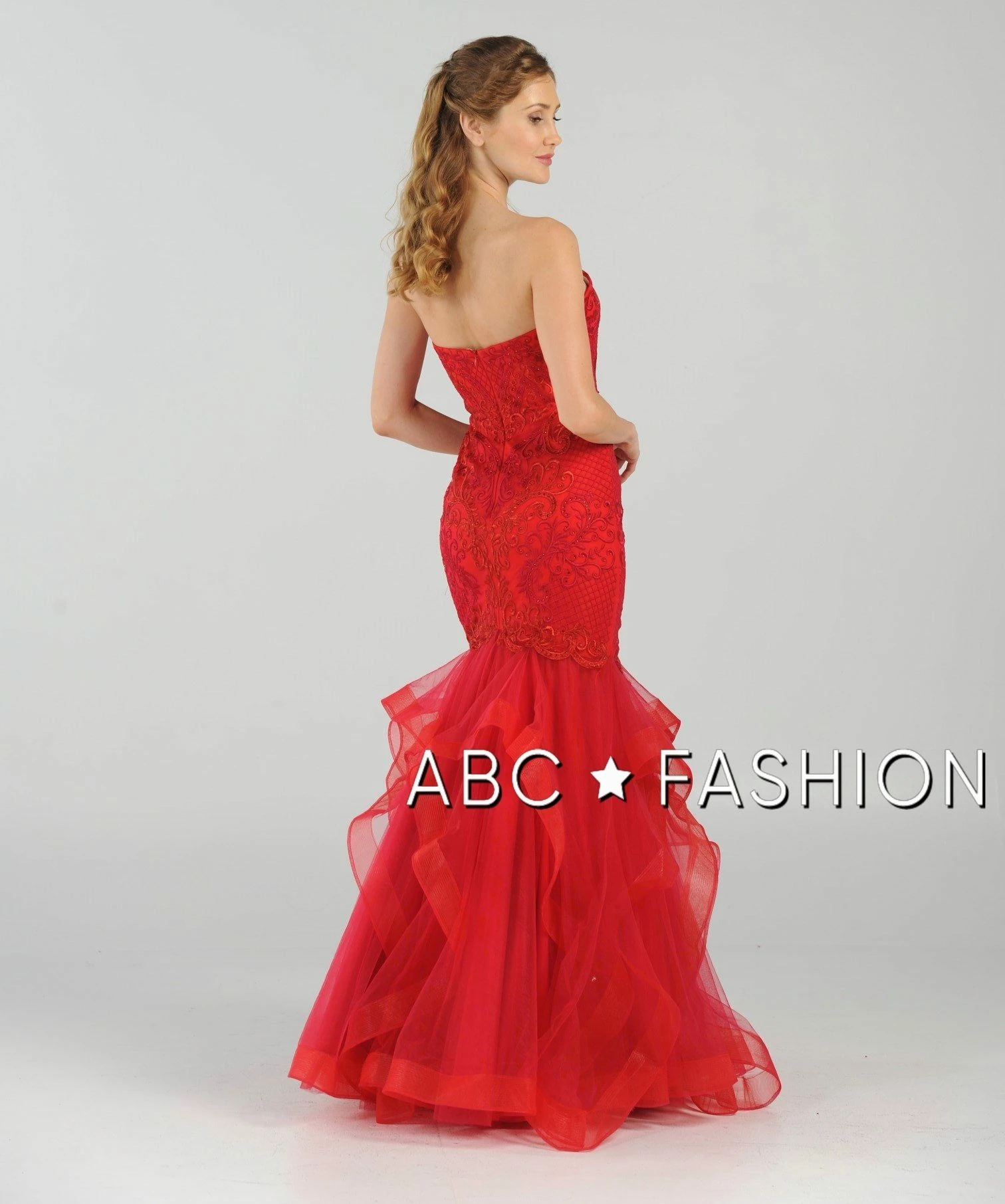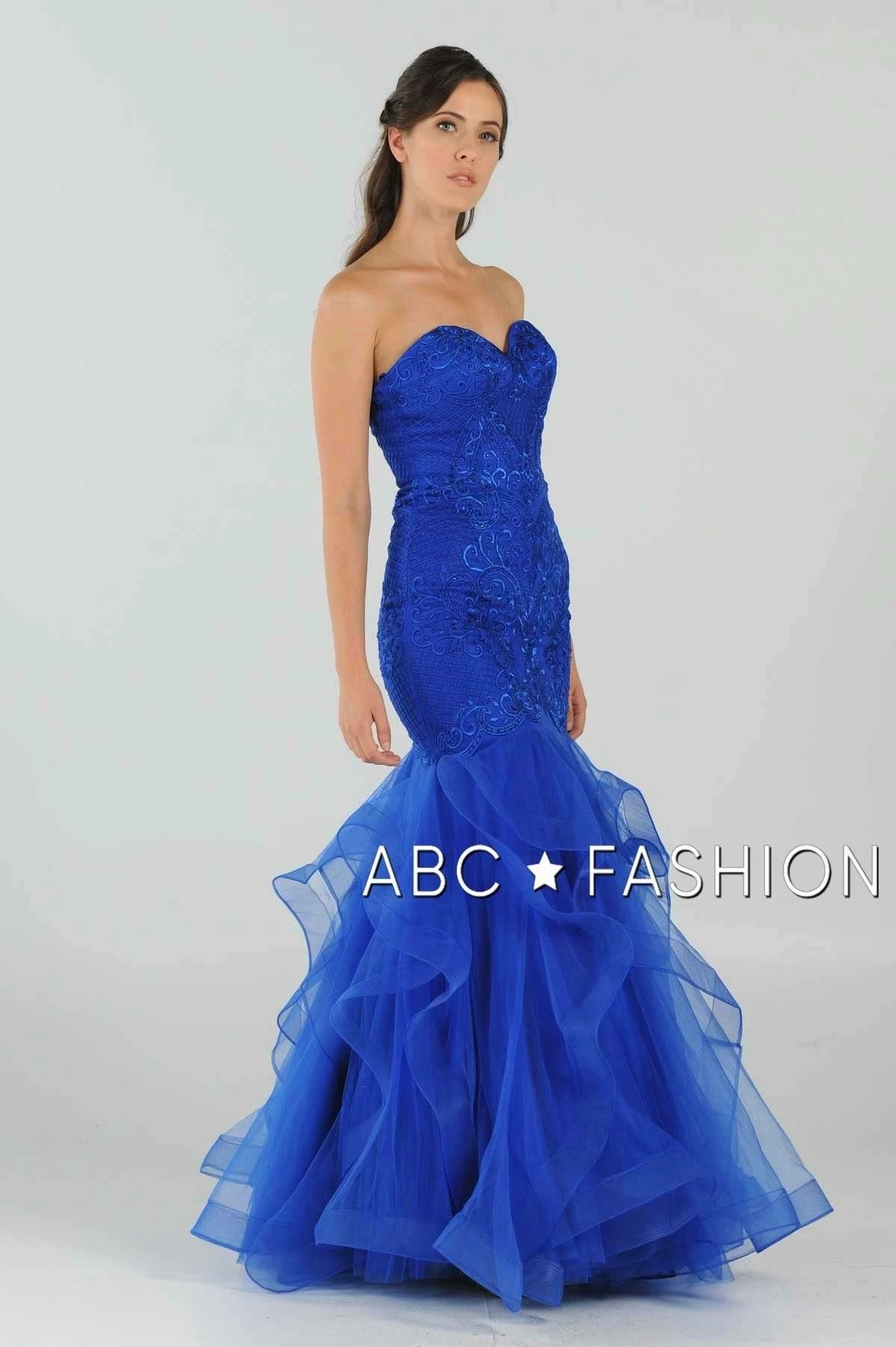 Look picture-perfect in this strapless sweetheart mermaid gown with tiered skirt by Poly USA 8198. Stunning mermaid mesh dress features a strapless sweetheart bodice embellished with embroidery and rhinestones, floor length tiered skirt with horsehair hemline ruffles, and a zipper closure. Affordably priced under $270, this dress is perfect for any formal event and will keep you on budget!