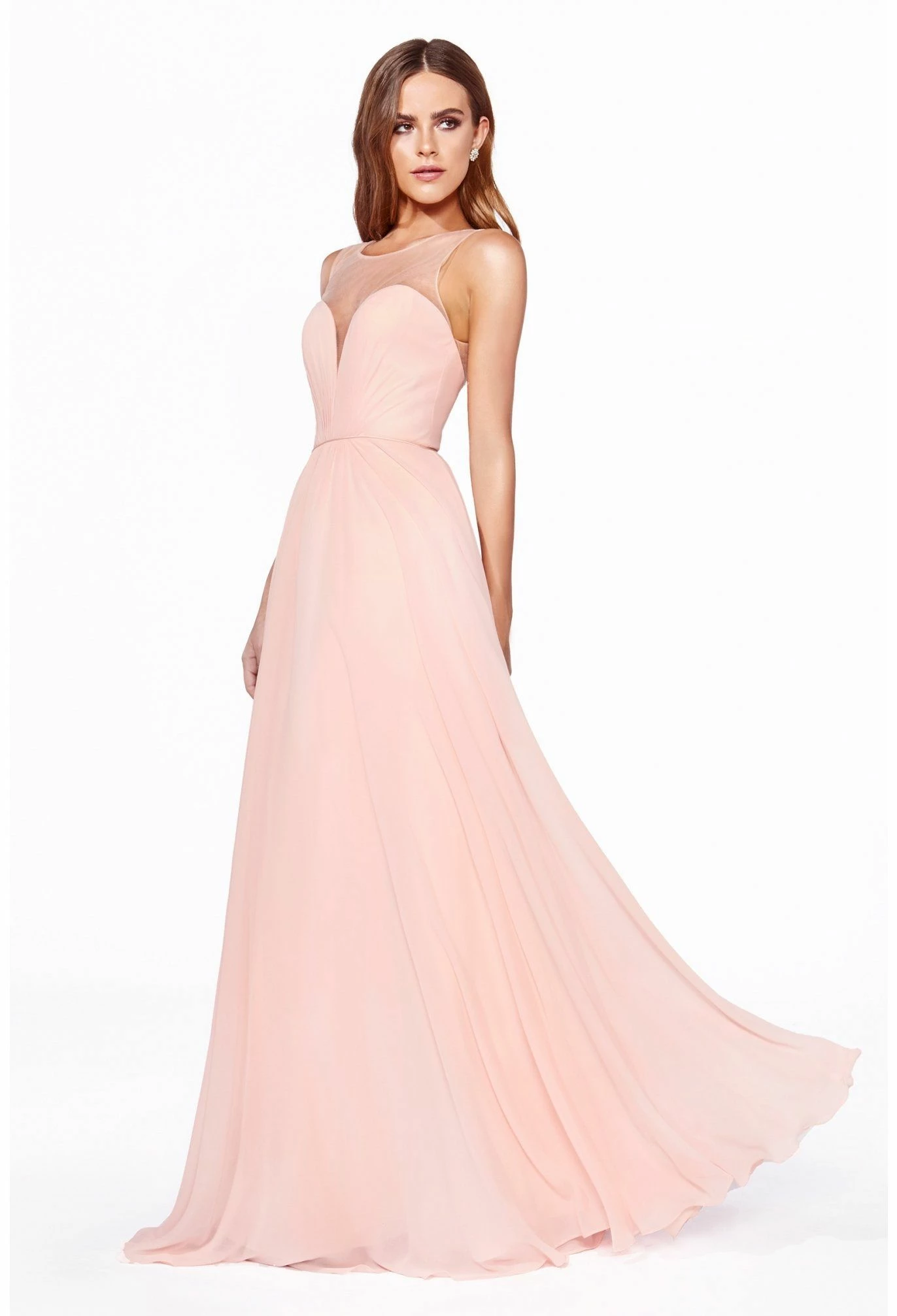 - Sleeveless A-line chiffon gown with illusion neckline and open back