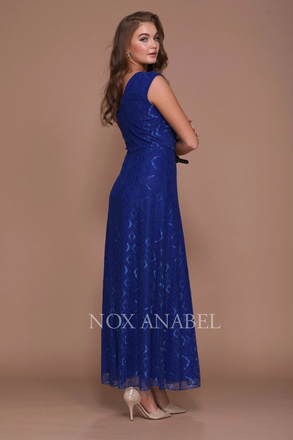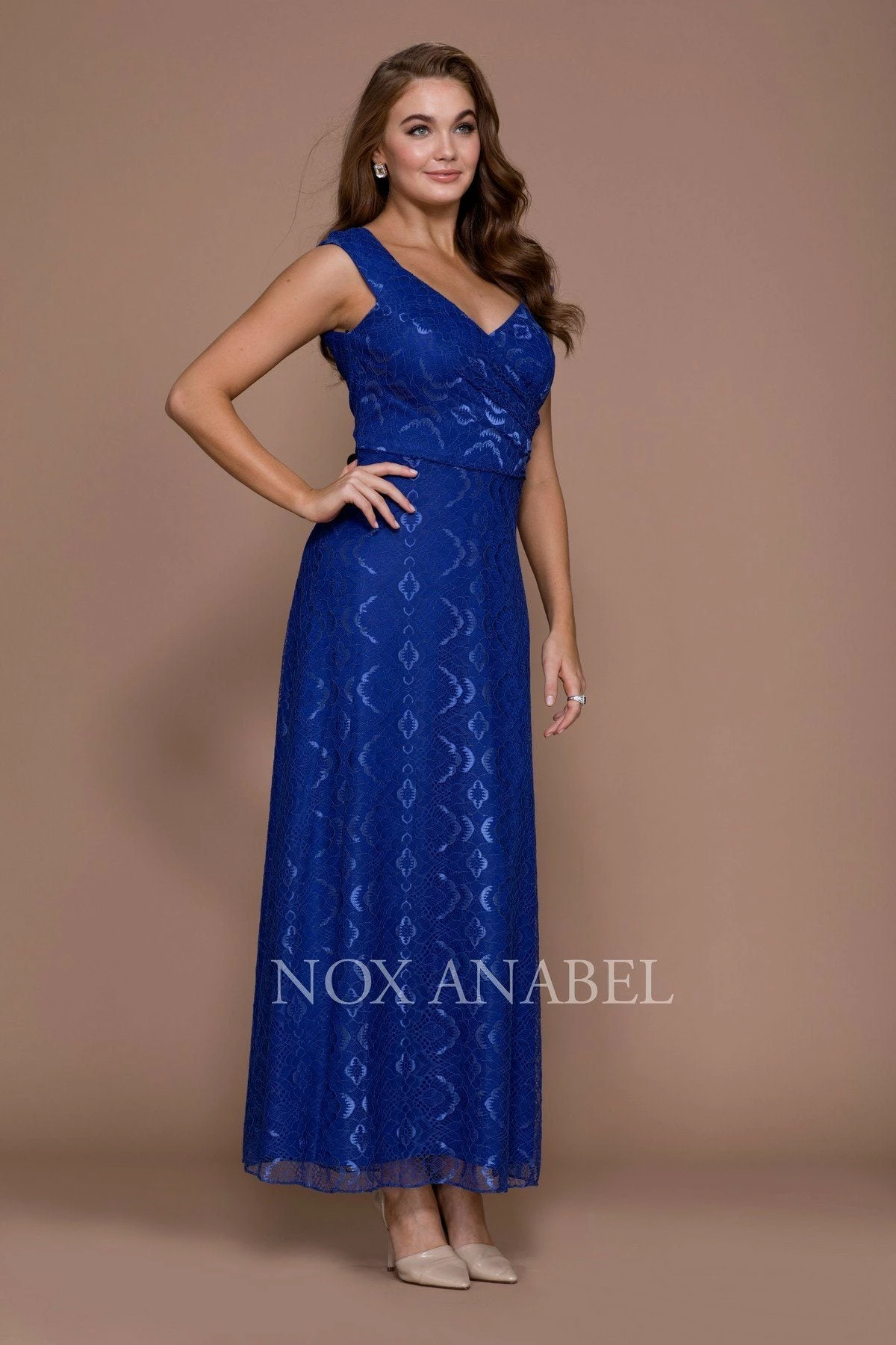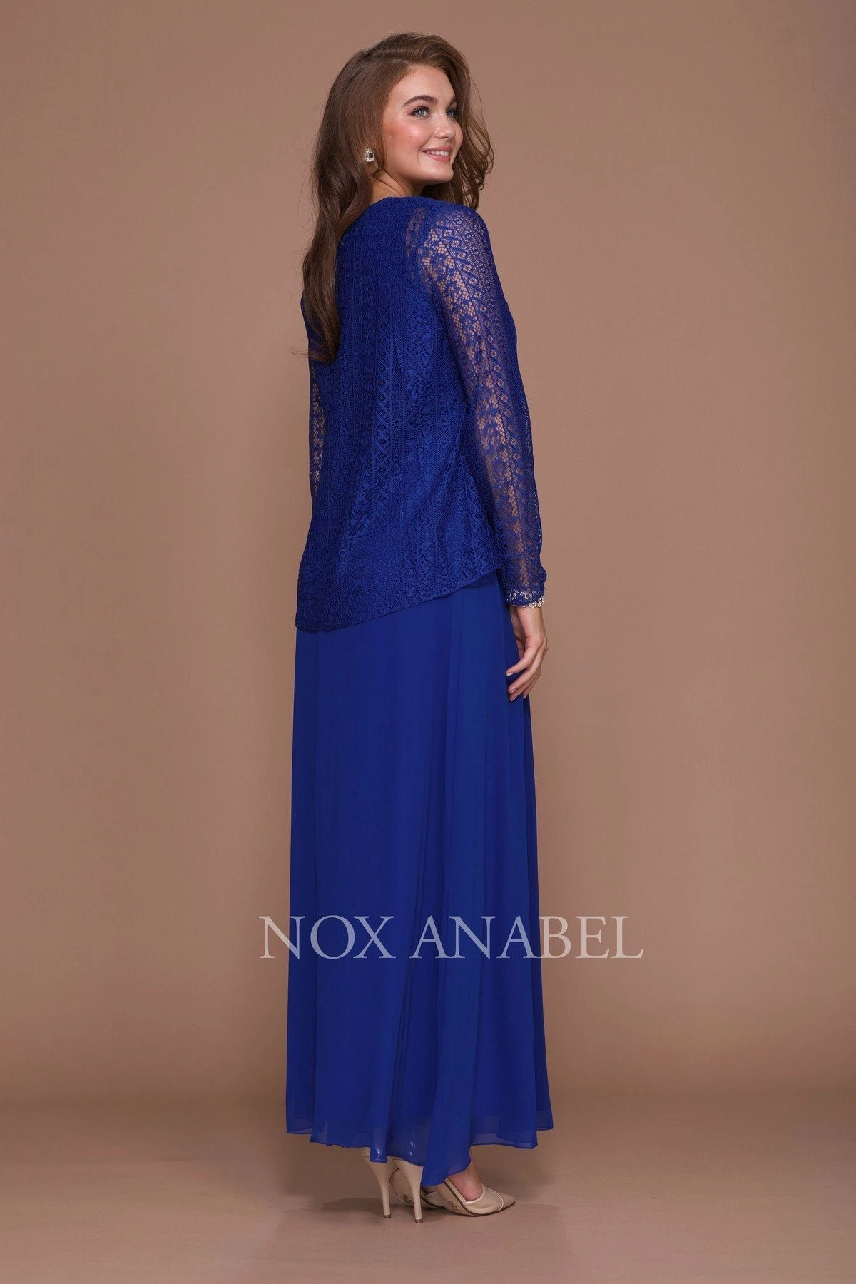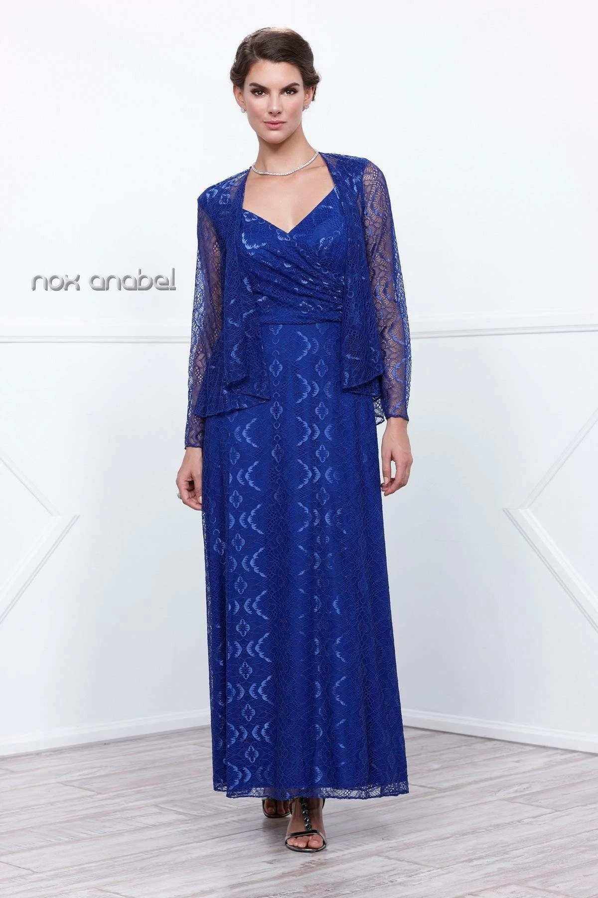 Fall in love with this long sleeveless lace dress with long-sleeved jacket by Nox Anabel Style Number 5140. This long evening gown features a V-neck sleeveless bodice with beautiful lace all over, V-shaped back, full length skirt, matching lace jacket, and a zipper closure. Perfect as a Mother of the Bride dress or for any formal event!
