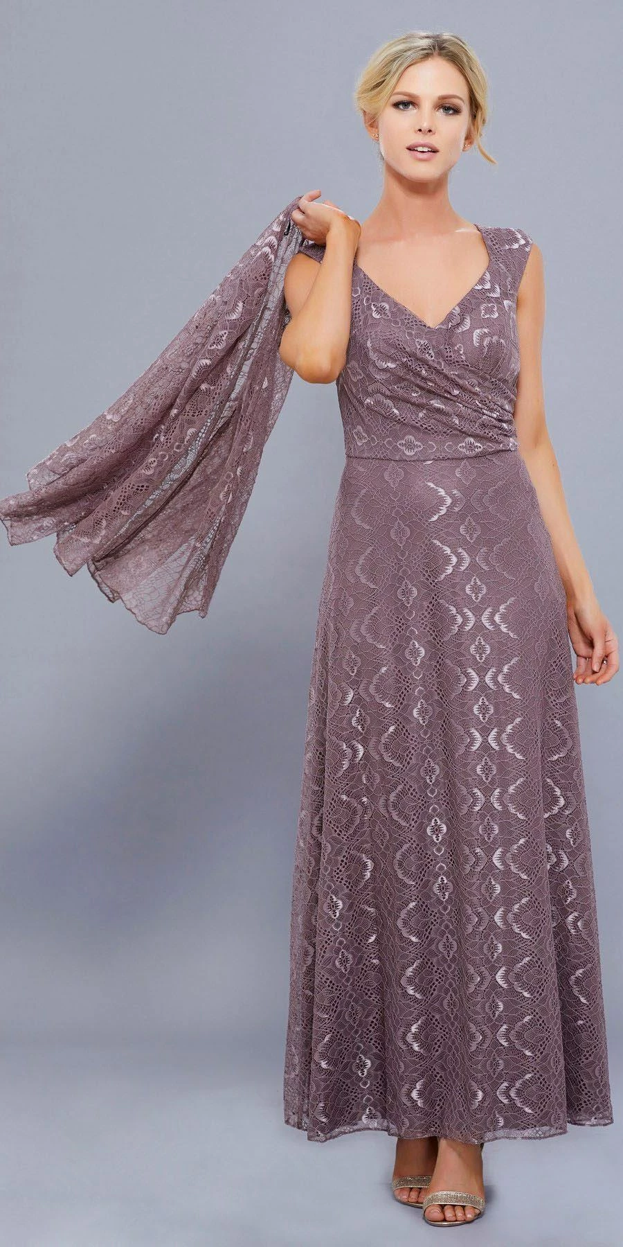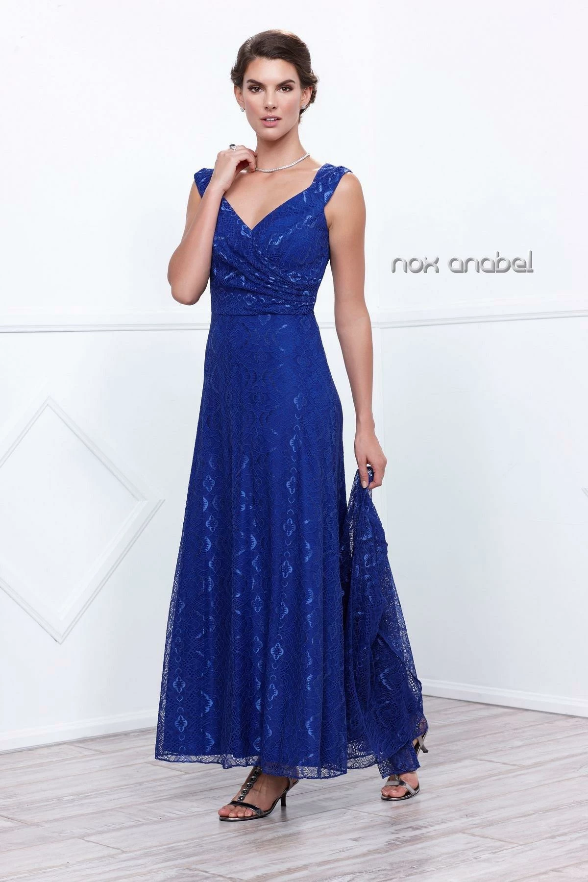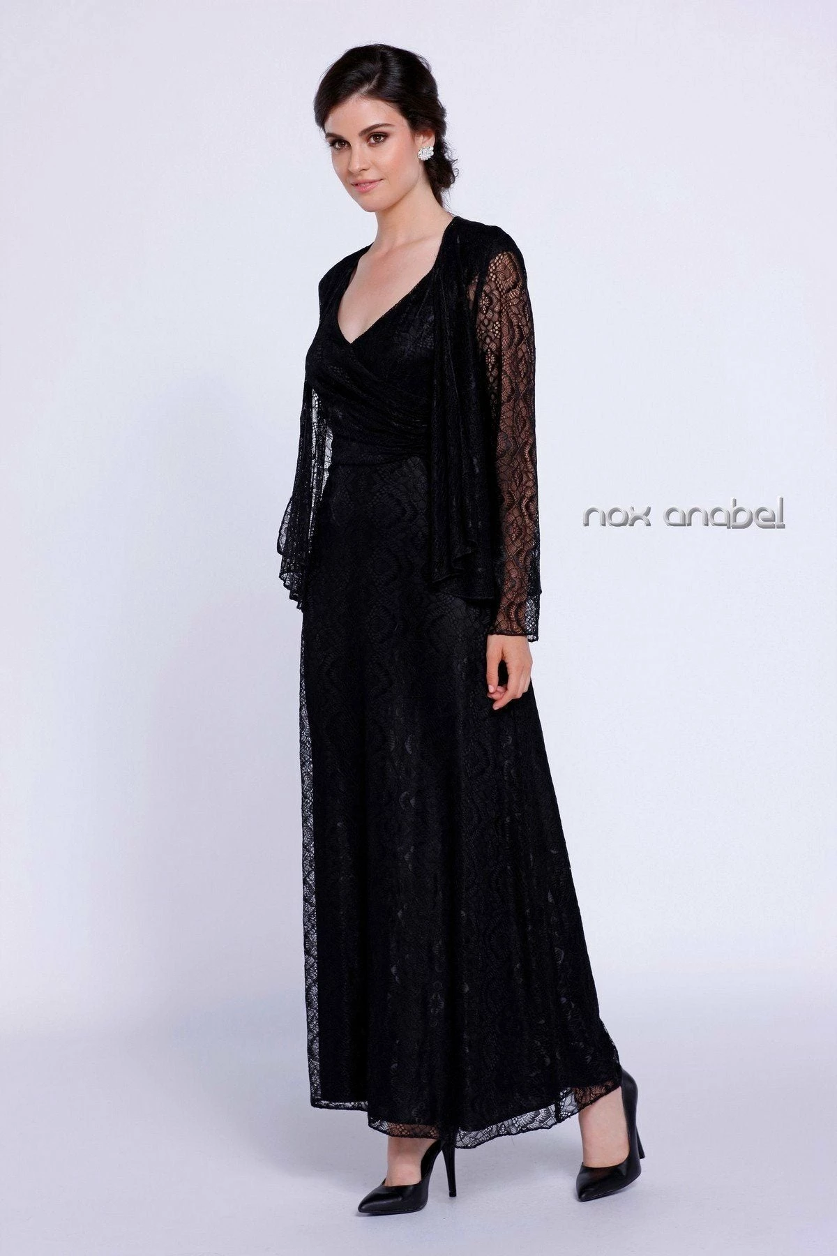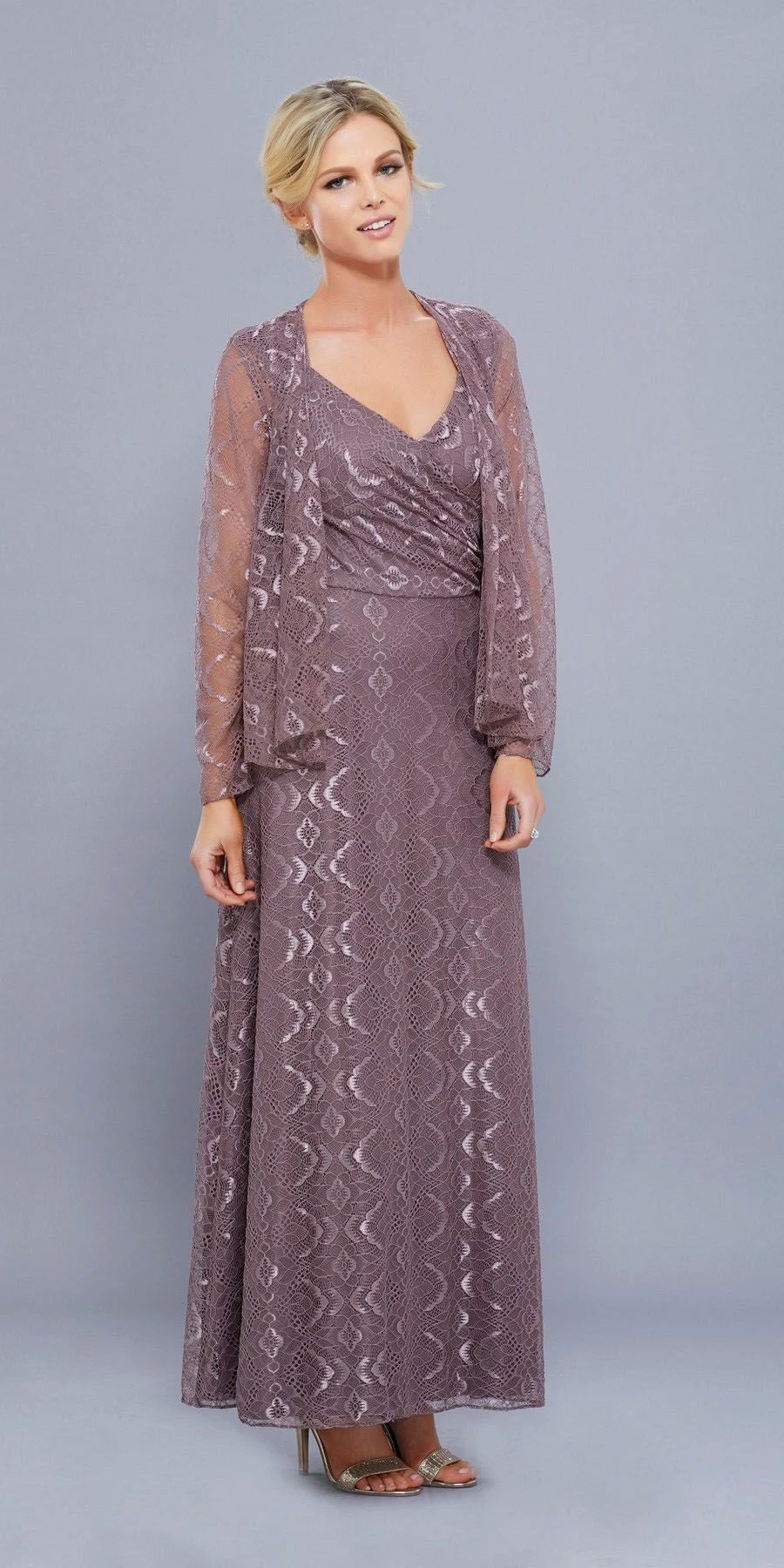 Fall in love with this long sleeveless lace dress with long-sleeved jacket by Nox Anabel Style Number 5140. This long evening gown features a V-neck sleeveless bodice with beautiful lace all over, V-shaped back, full length skirt, matching lace jacket, and a zipper closure. Perfect as a Mother of the Bride dress or for any formal event!