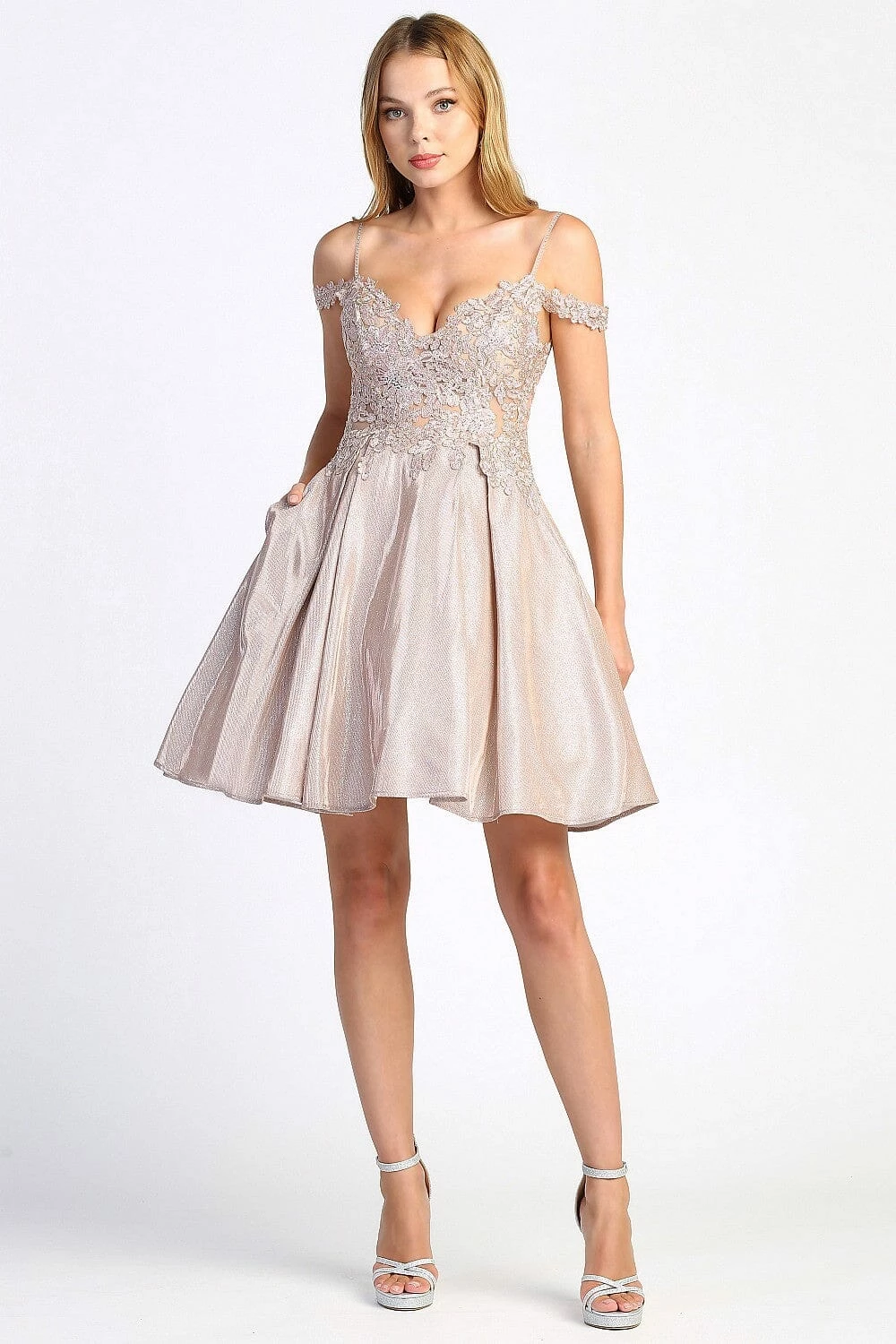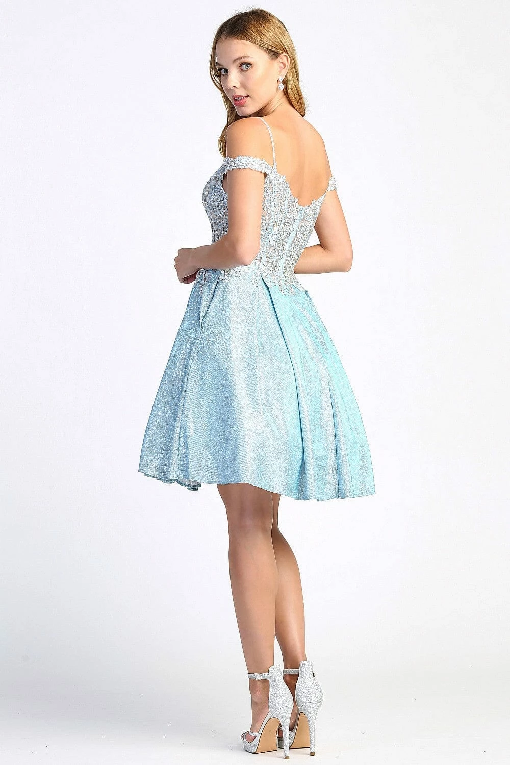 Look super cute in this embroidered applique short cold shoulder dress with A-line metallic glitter skirt by Adora Design 1010.