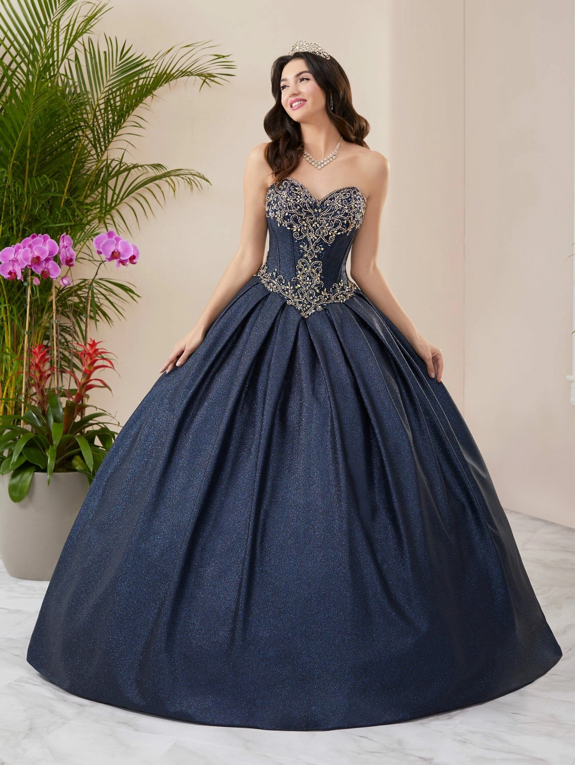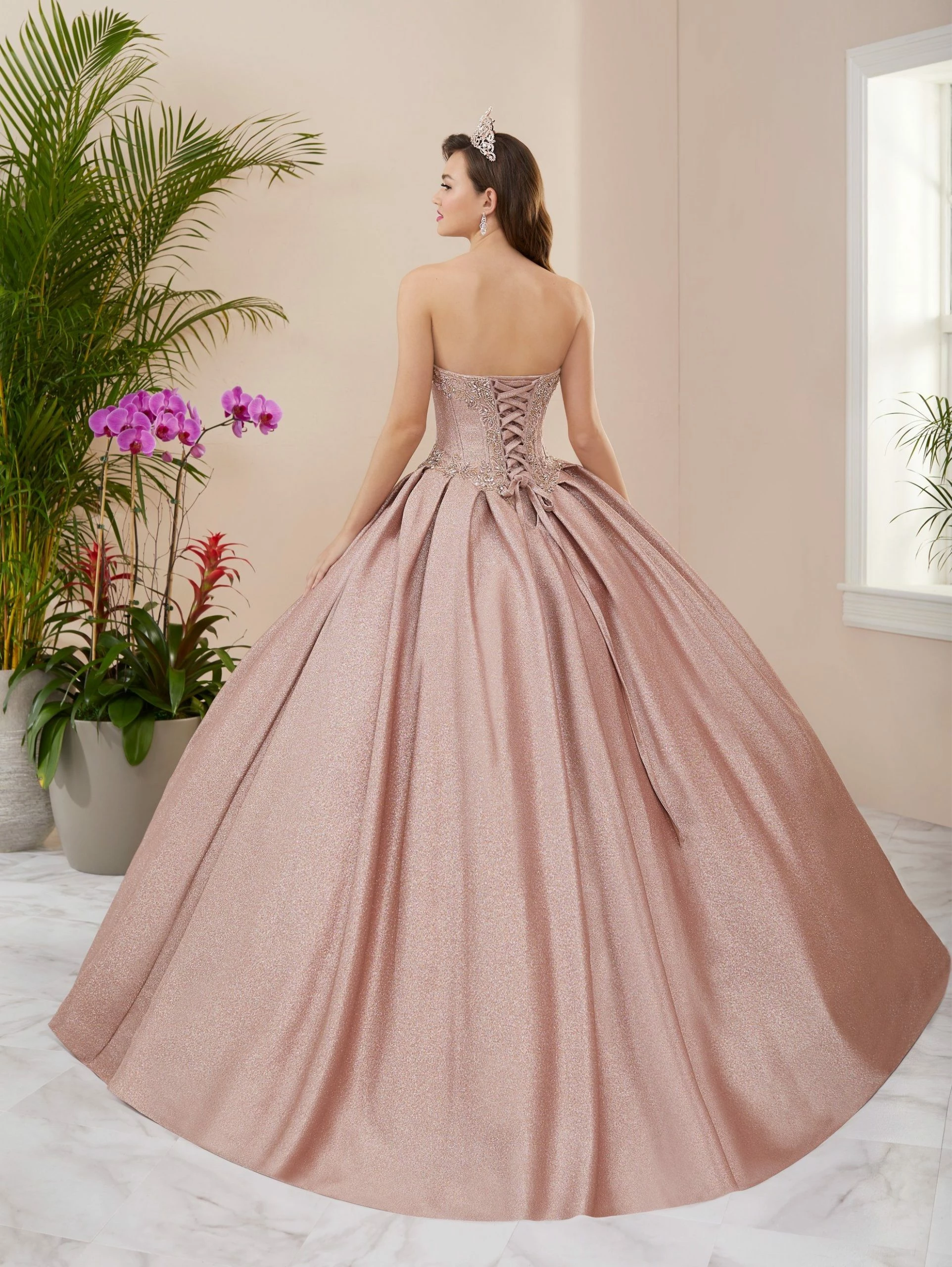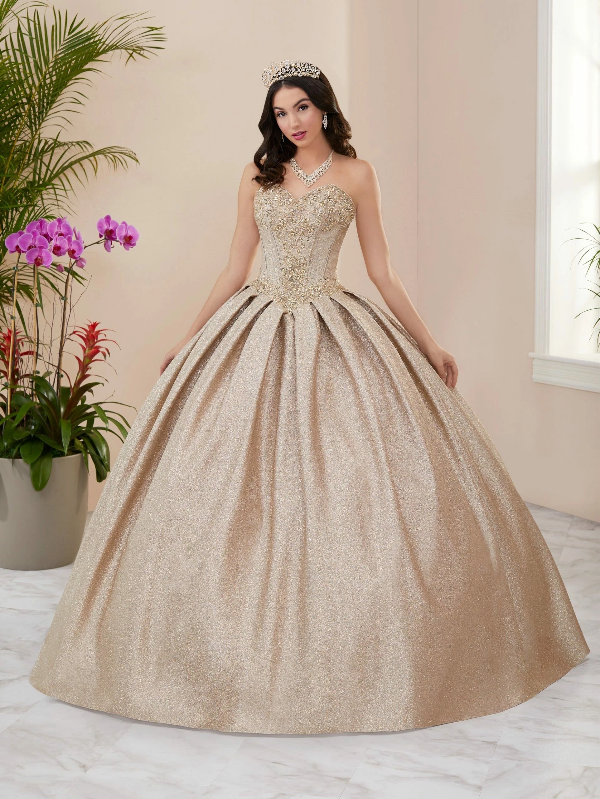 Light up the room in this strapless metallic glitter ball gown with A-line skirt by House of Wu Fiesta Gowns Collection 56404. Made out of sparkle satin, this beautiful long dress features a strapless sweetheart neckline adorned with sparkly beads, box pleated ball gown skirt, sweep train, open back, and lace-up corset back.