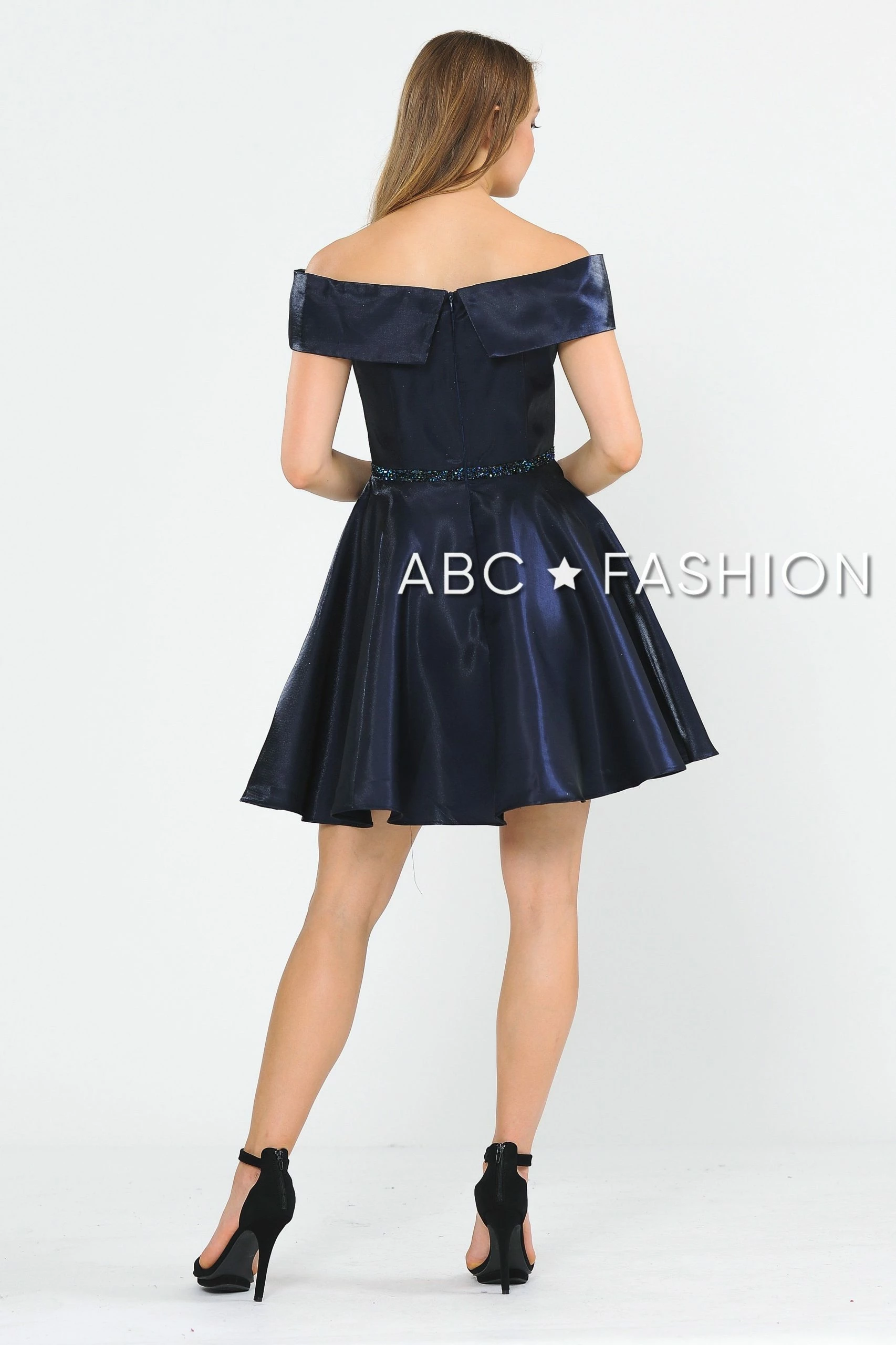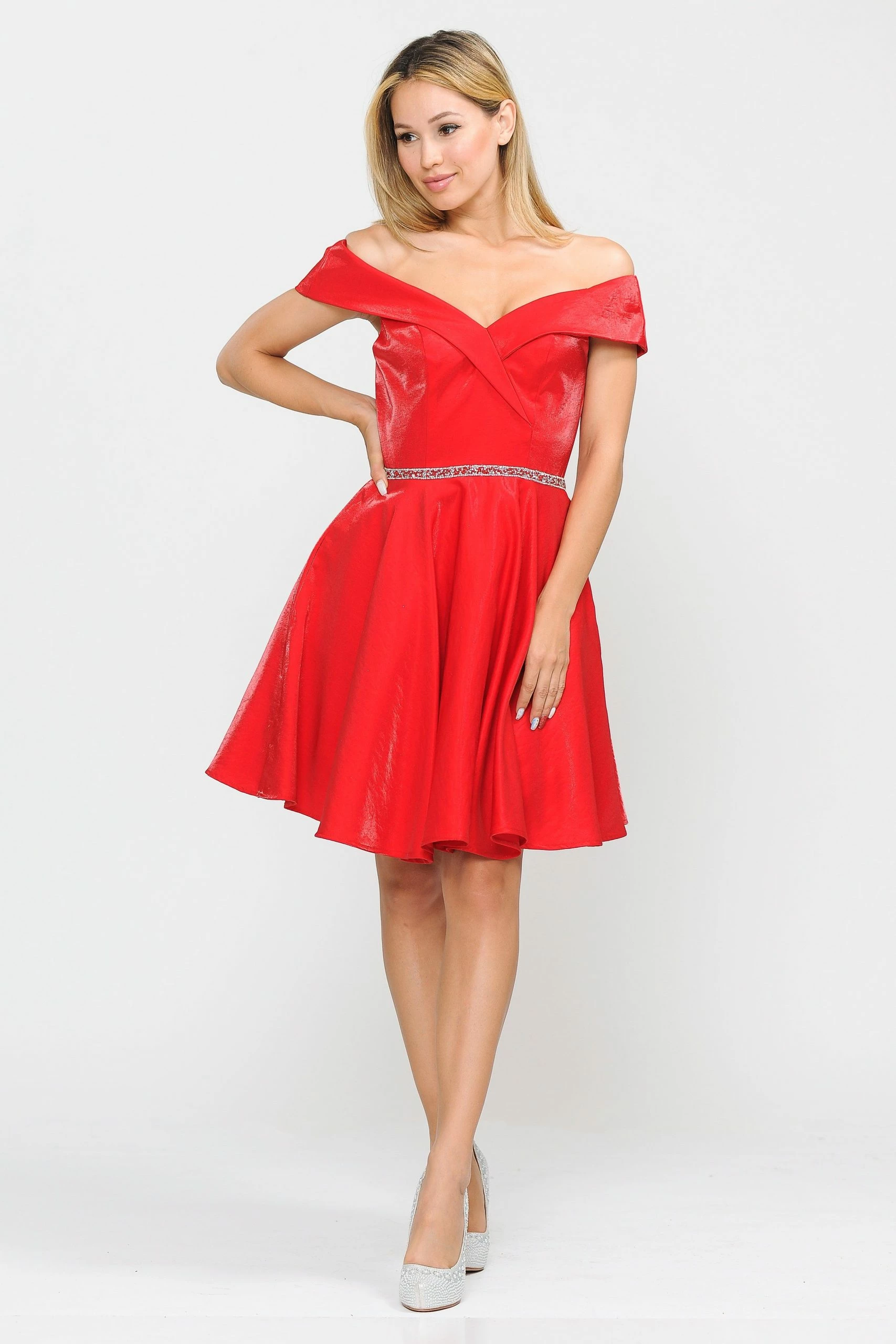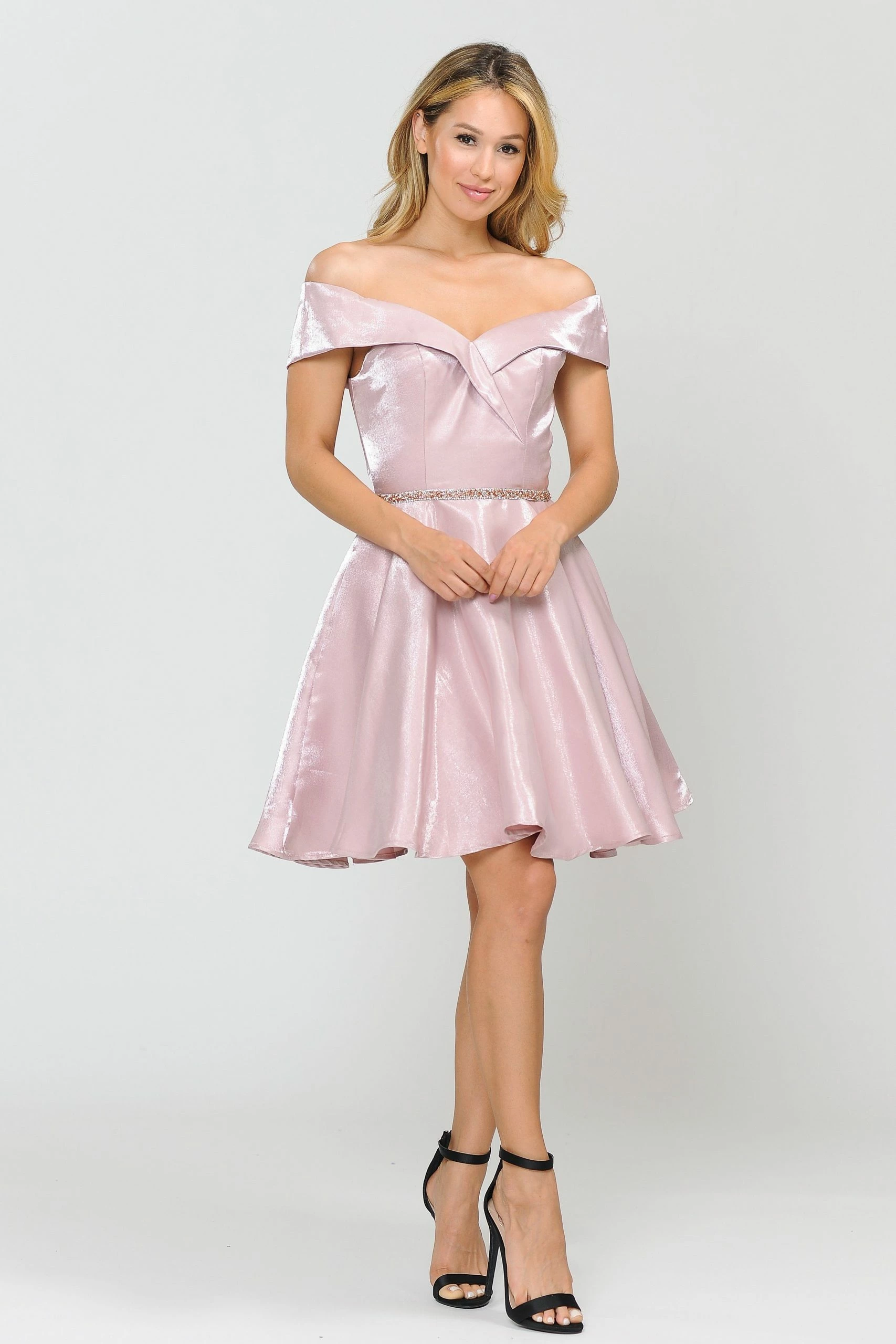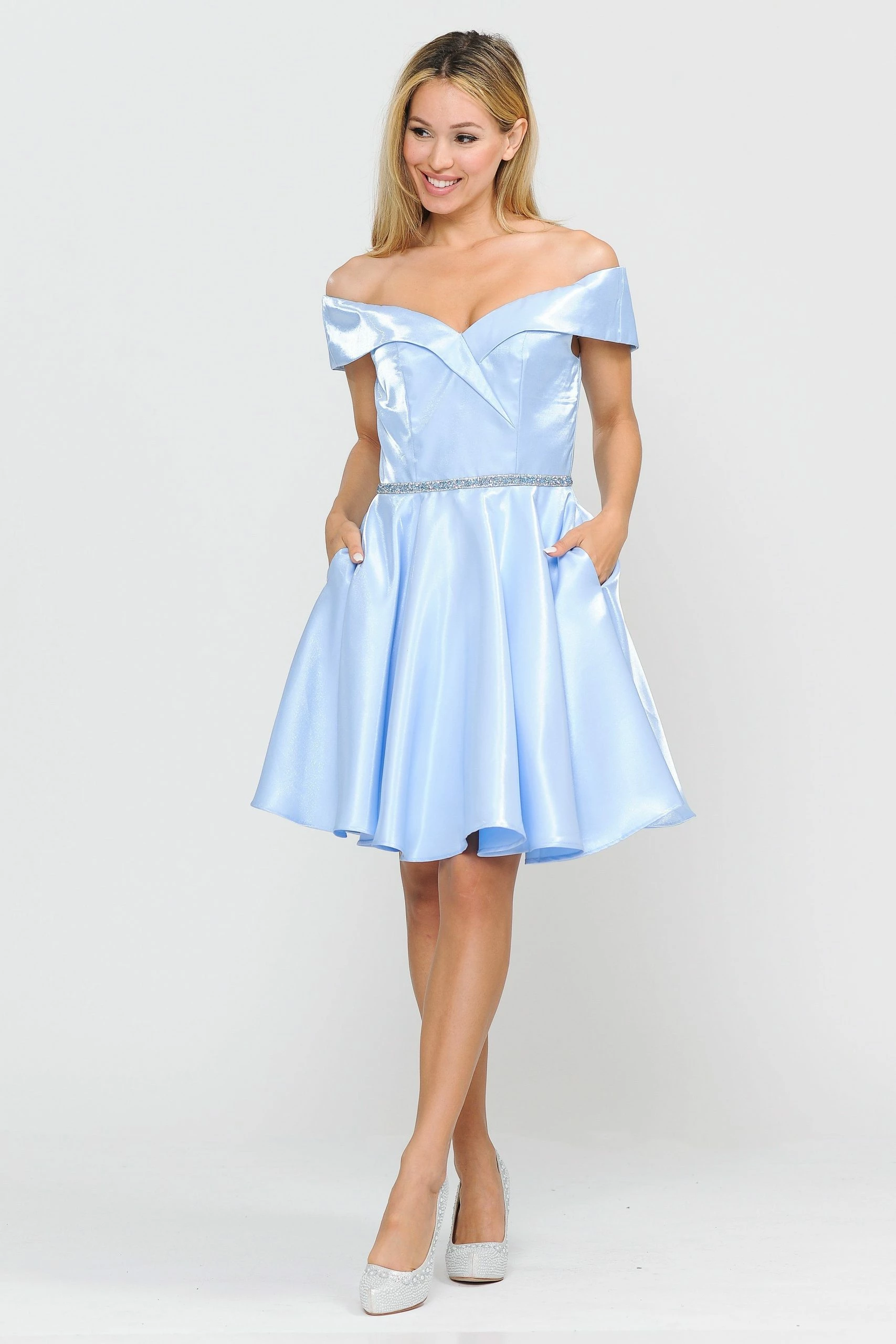 Look picture-perfect in this metallic off the shoulder cocktail dress with beaded waistband by Poly USA 8238. This beautiful short off shoulder dress features a sweetheart neckline, side pockets, waistband adorned with sparkly beads, short A-line pleated skirt, and a zipper closure. Affordably priced at $139, this short party dress is perfect for any formal event and will keep you on budget!