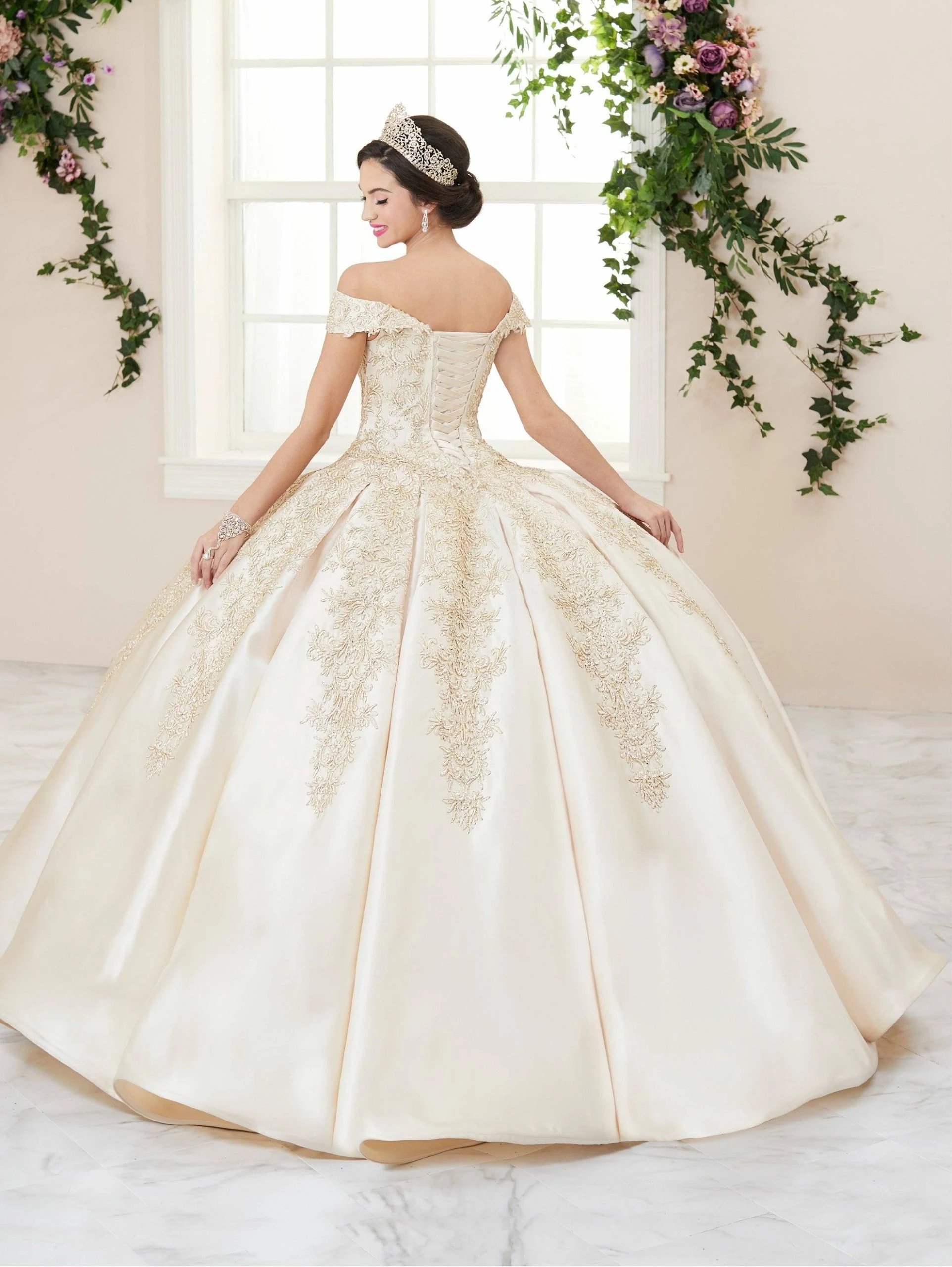 Look unforgettable in this lace applique long off the shoulder dress with A-line skirt by House of Wu Quinceanera Collection 26963. Made out of mikado, this beautiful off shoulder ball gown features a sweetheart bodice adorned with lovely lace appliques, open back, and a floor length box pleated mikado skirt embellished with cascading lace motifs. This look is finished with a lace-up corset up.