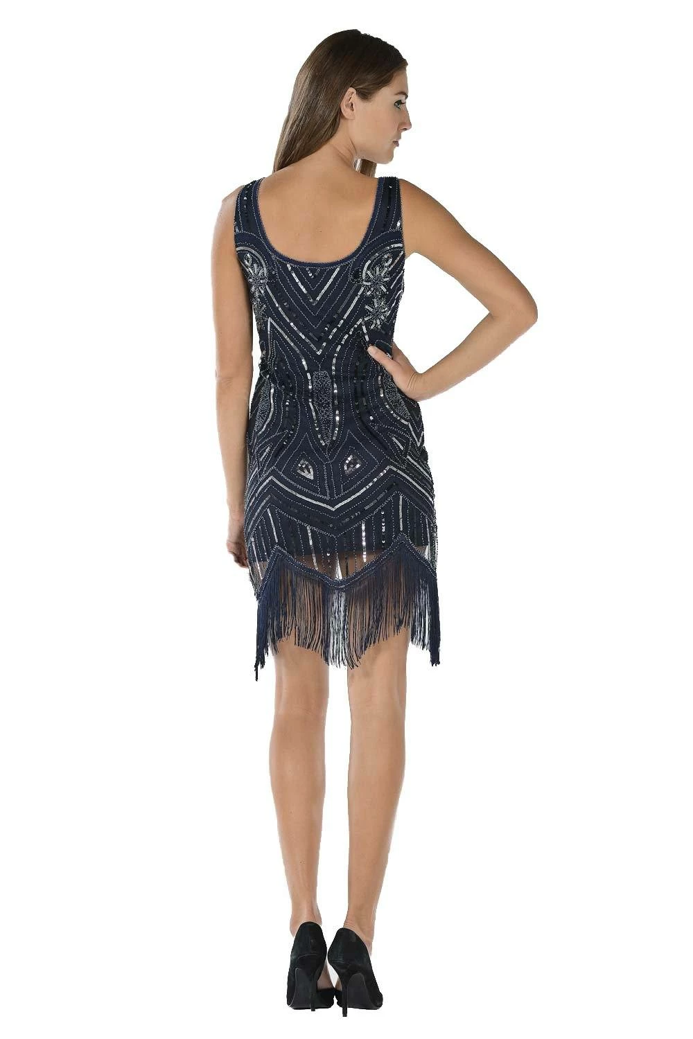 Perfect a Great Gatsby themed party, rock this short navy blue sequined fringe dress by Poly USA 7848. This cocktail dress features a sleeveless round neck bodice that is adorned with dazzling sequins and beads. An embellished back, a short above the knee fringe skirt, and a zipper closure complete this beautiful look. Affordably priced under $100, this fitted dress is perfect for any formal event and will keep you on budget!