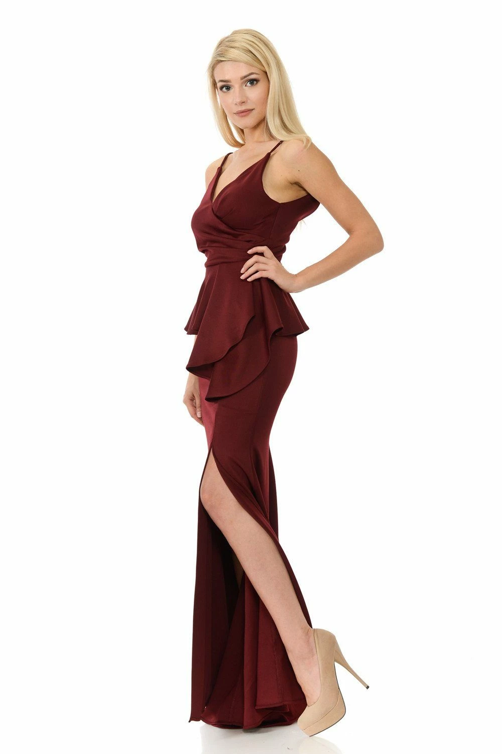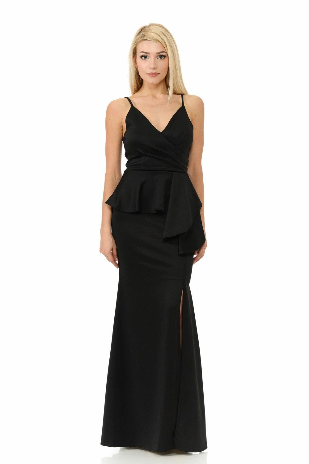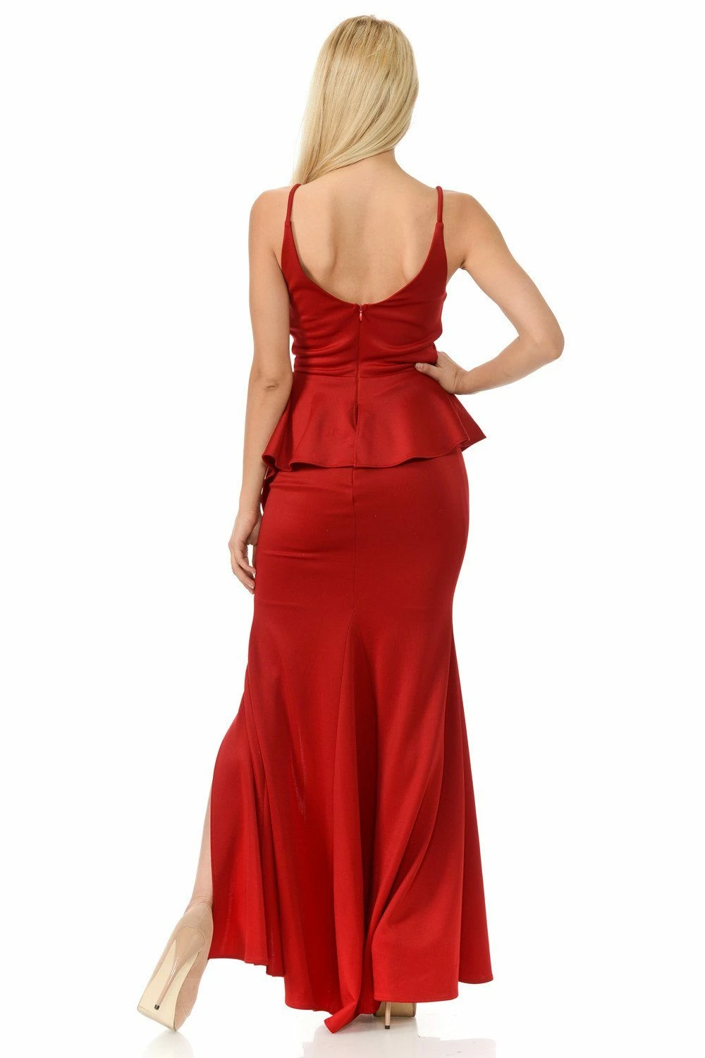 With so many stunning features, you’ll fall in love with this long sleeveless pleated V-neck peplum dress by Lenovia. This long evening gown features a sleeveless V-neck pleated bodice, lovely ruffled peplum, a full length skirt with side slit, and a zipper closure.