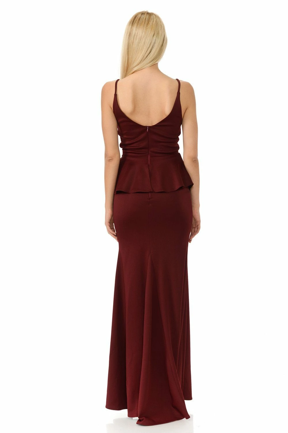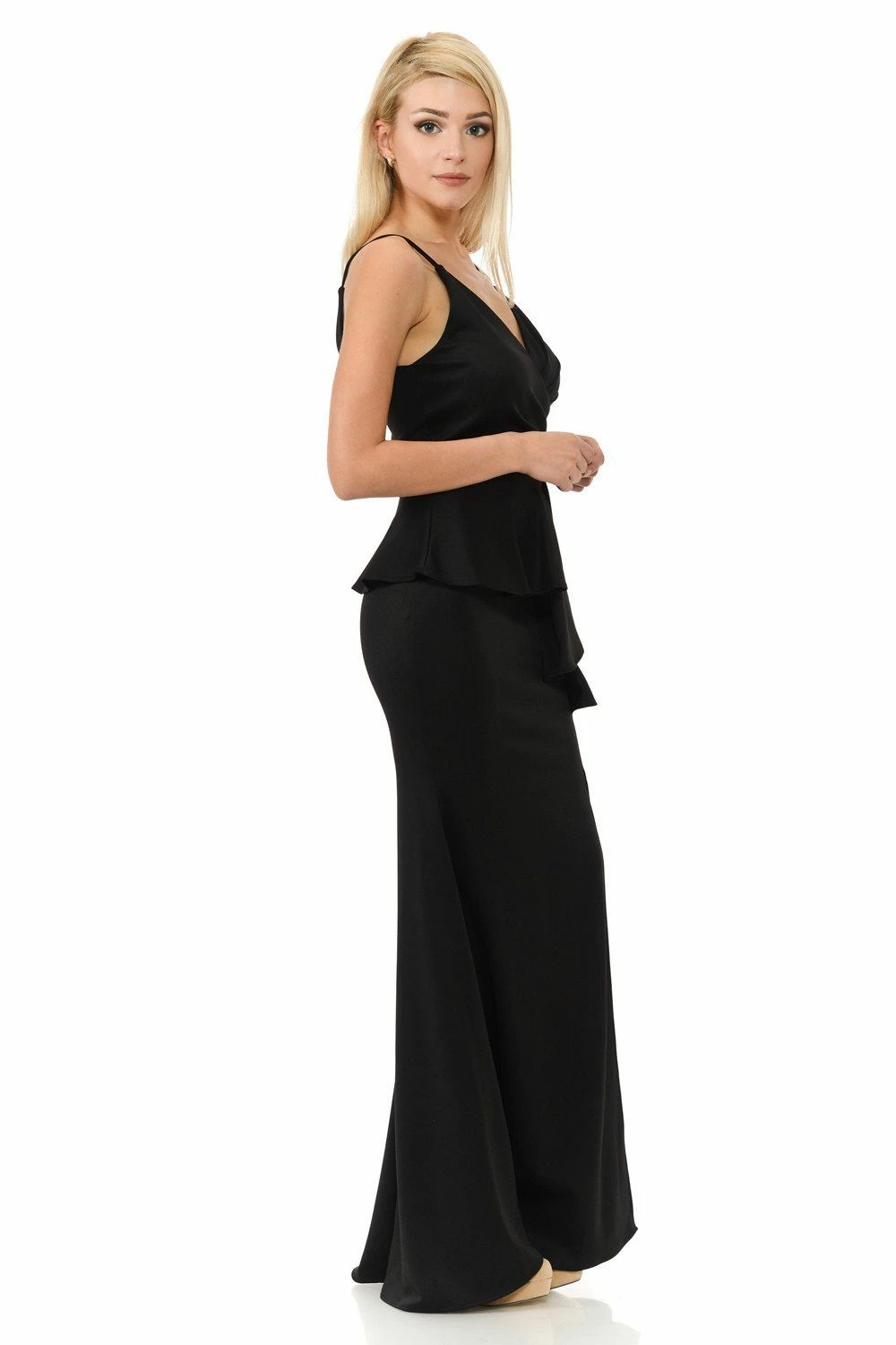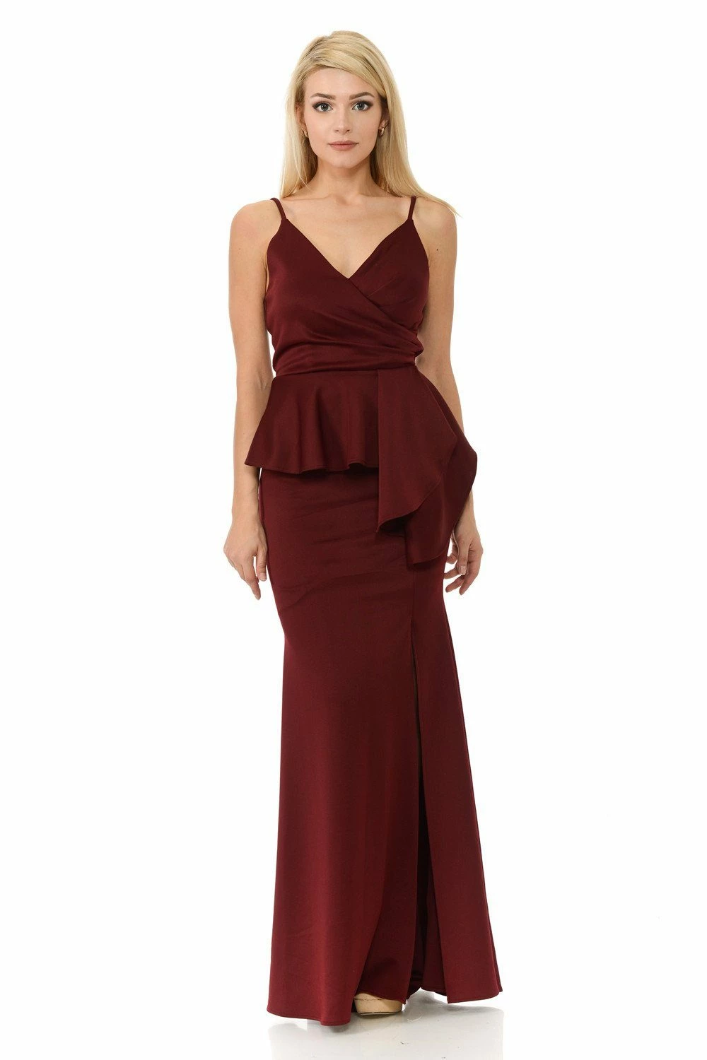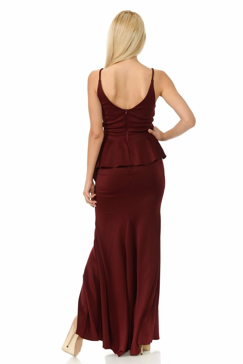 With so many stunning features, you’ll fall in love with this long sleeveless pleated V-neck peplum dress by Lenovia. This long evening gown features a sleeveless V-neck pleated bodice, lovely ruffled peplum, a full length skirt with side slit, and a zipper closure.