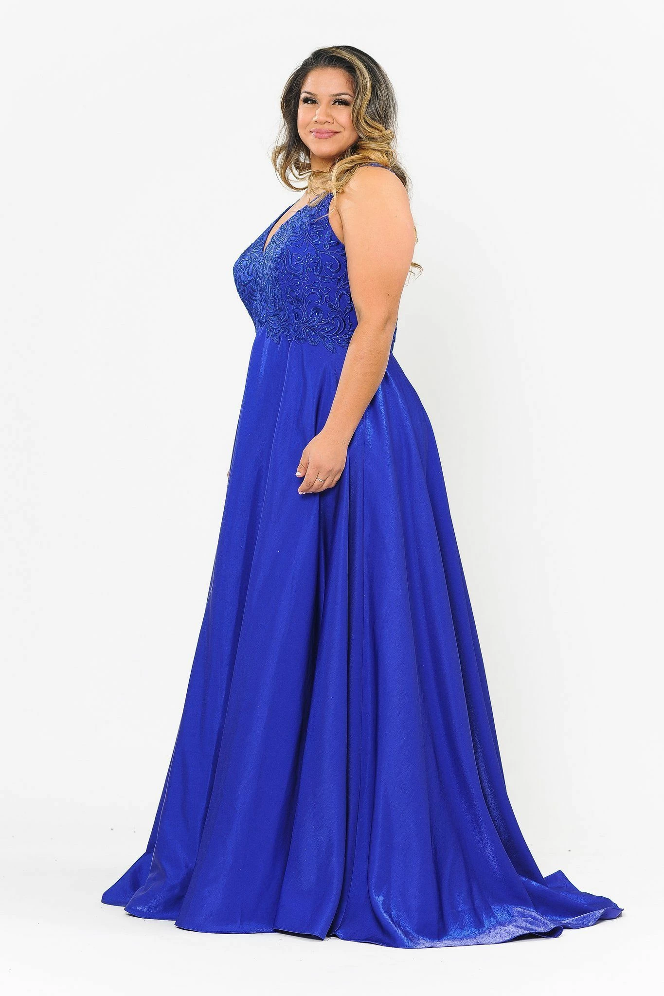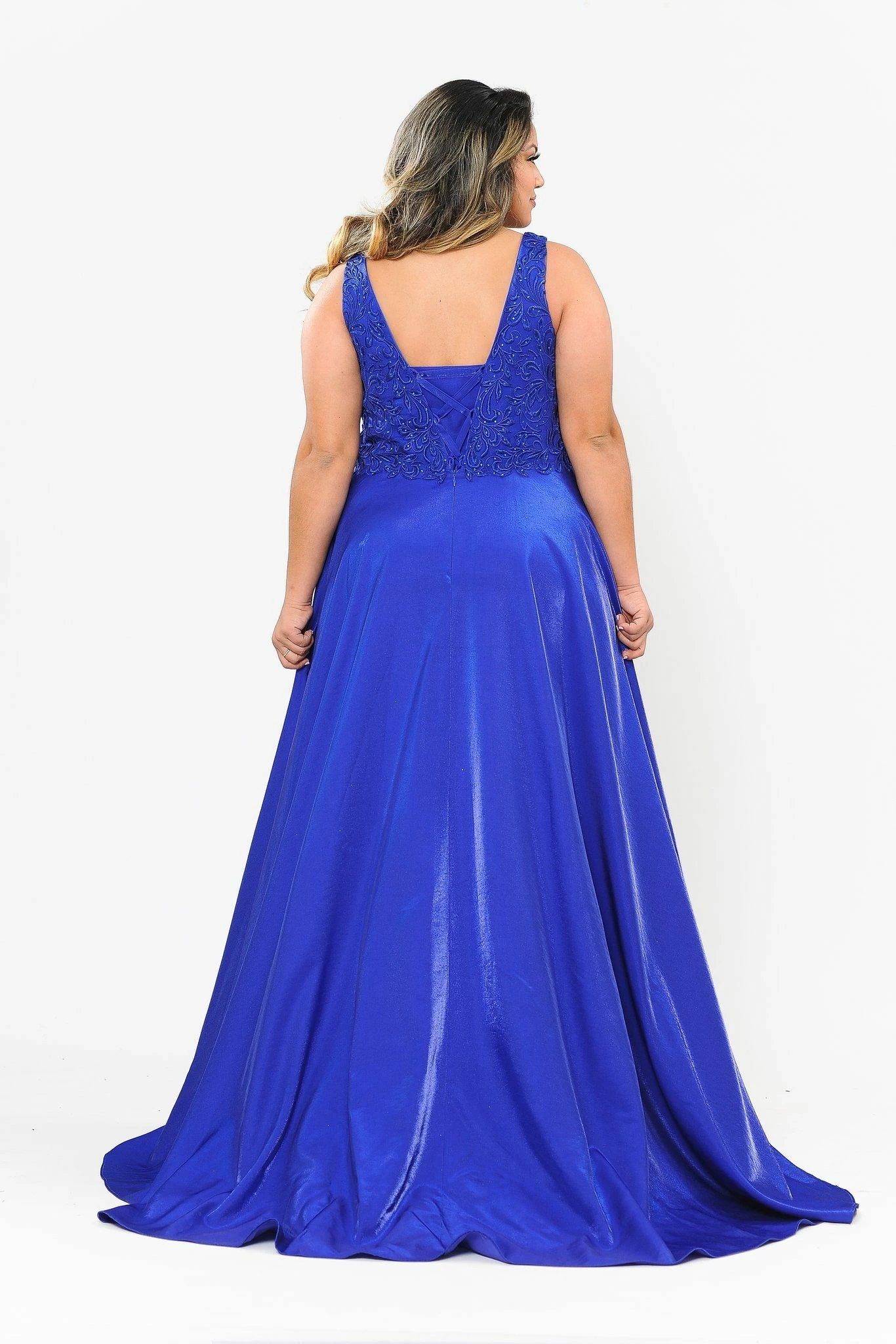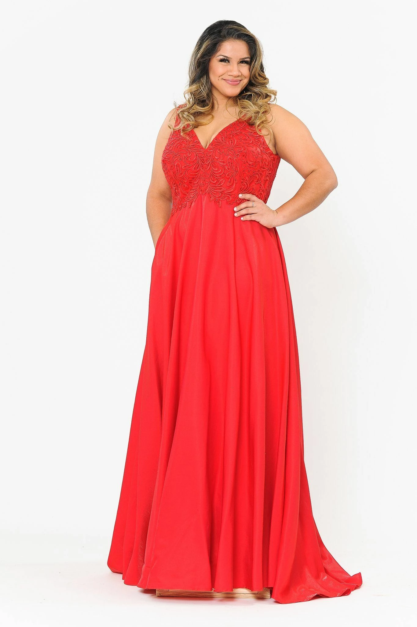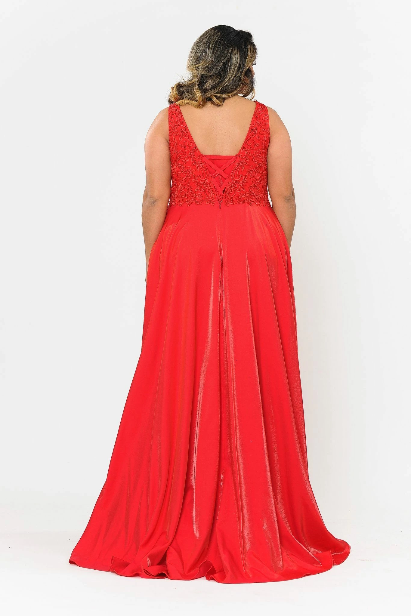Look timeless in this plus size long sleeveless A-line dress with embroidered top by Poly USA W1074. This beautiful gown features a sleeveless V-neck bodice adorned with embroidery that is accented with dainty beads, convenient side pockets, open back, floor length A-line skirt with sweep train, and a lace-up corset back.