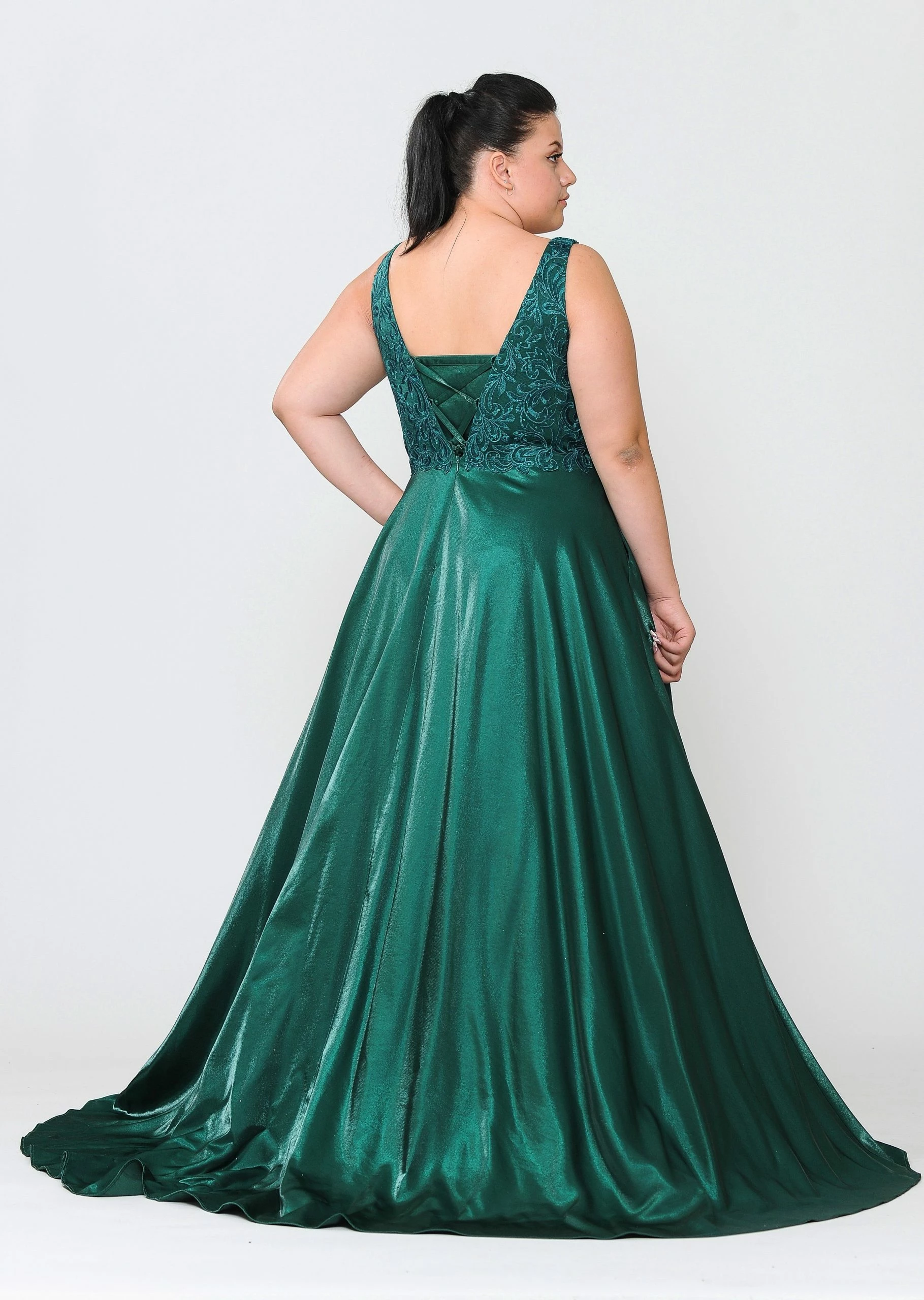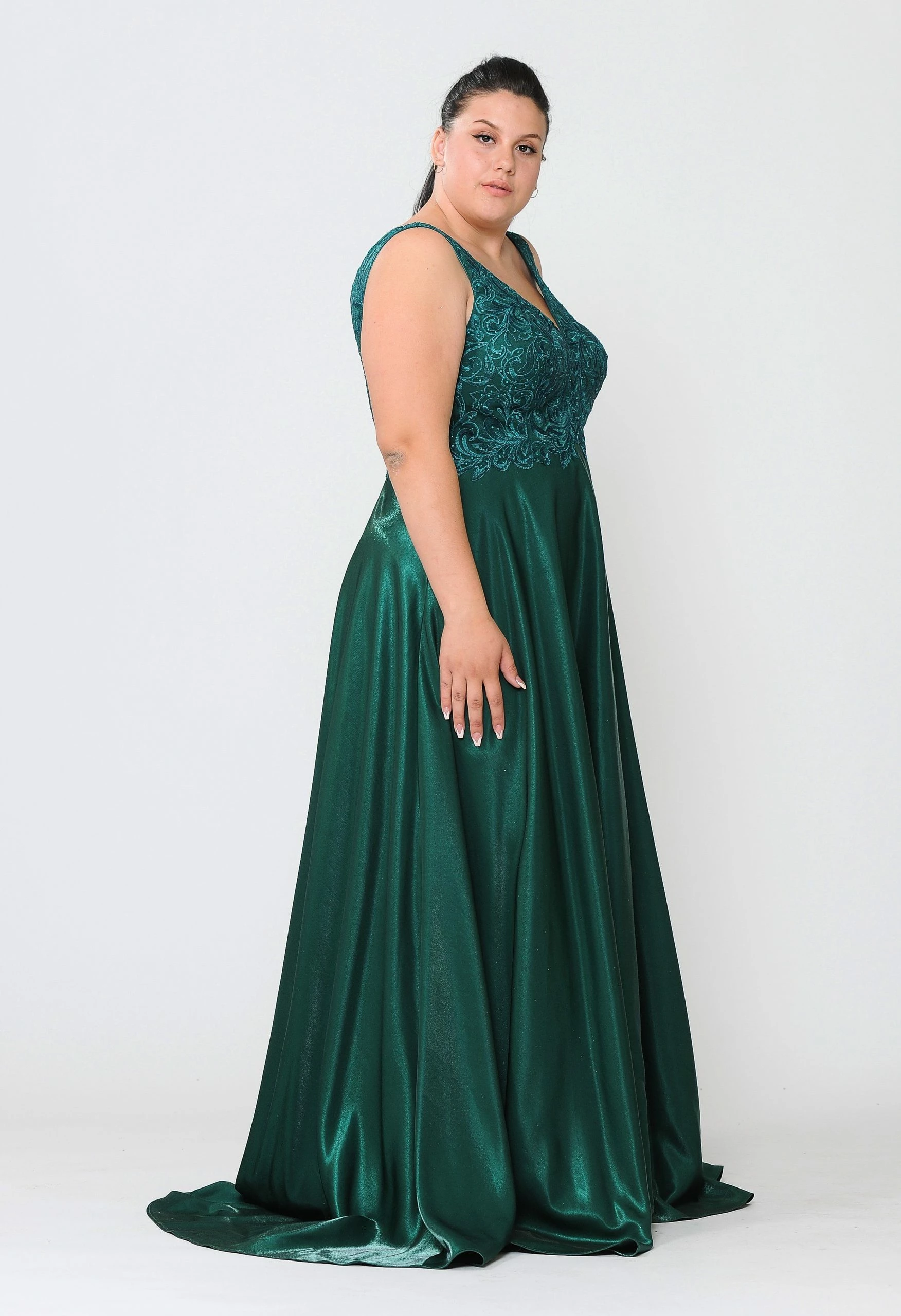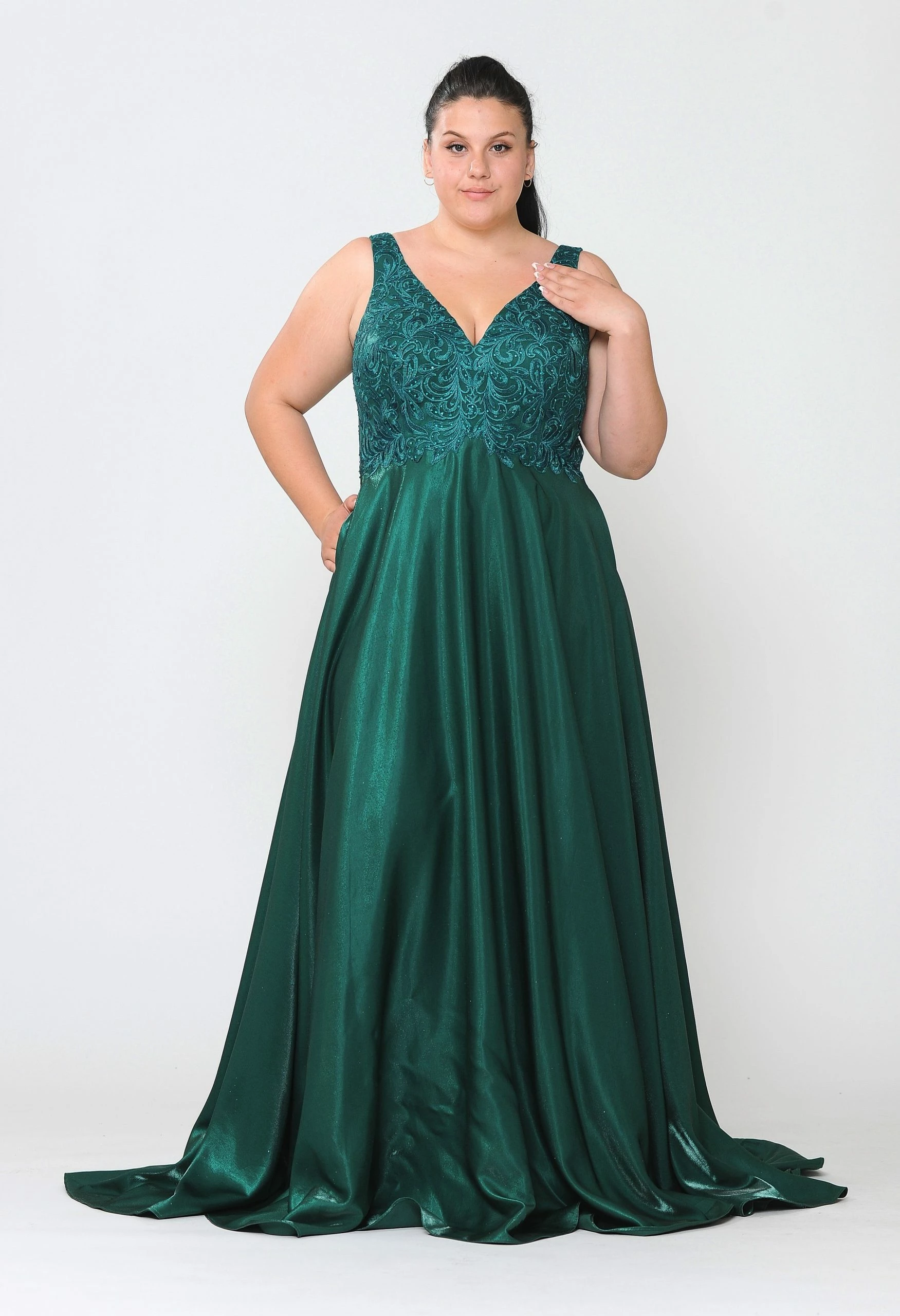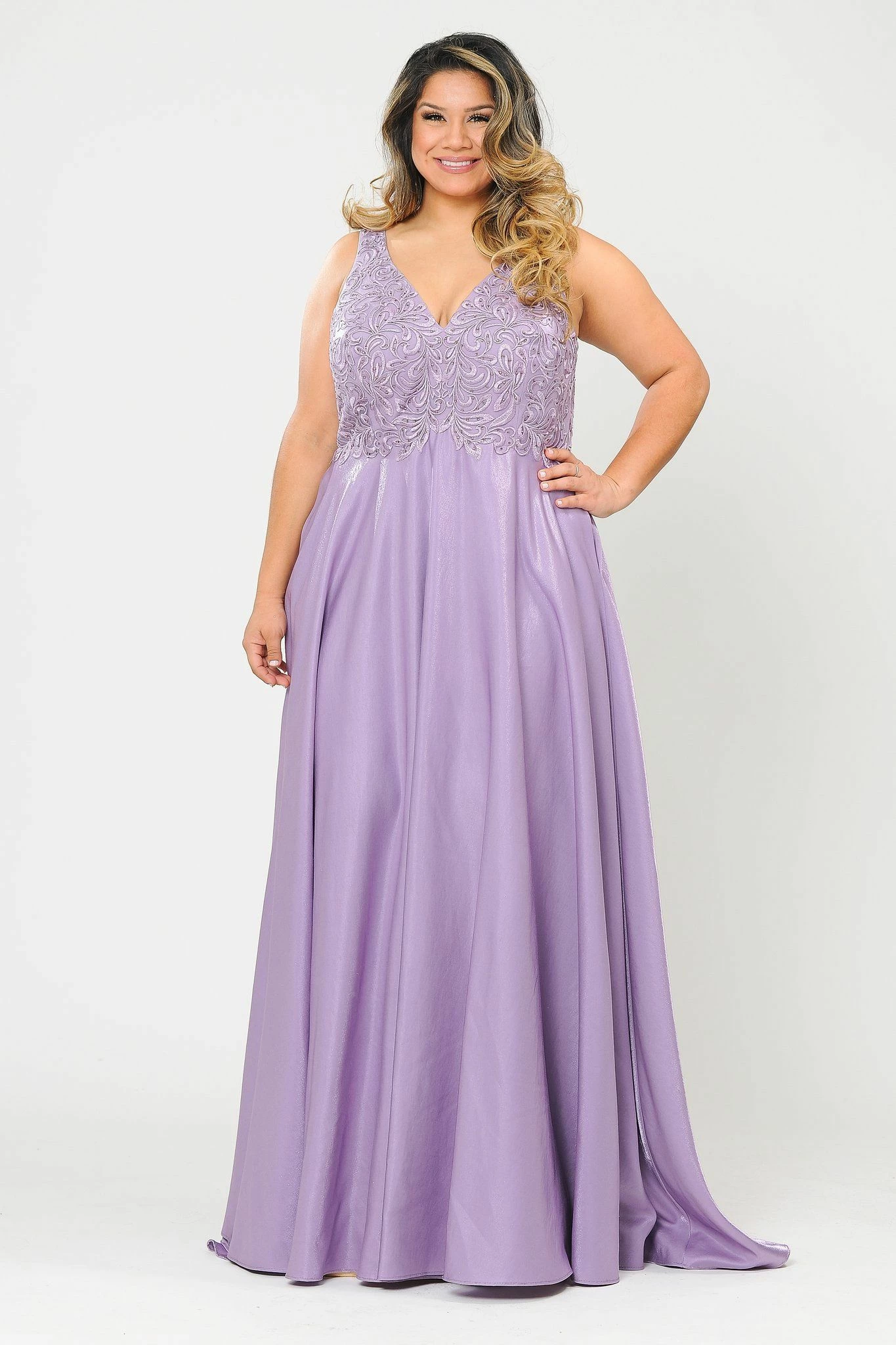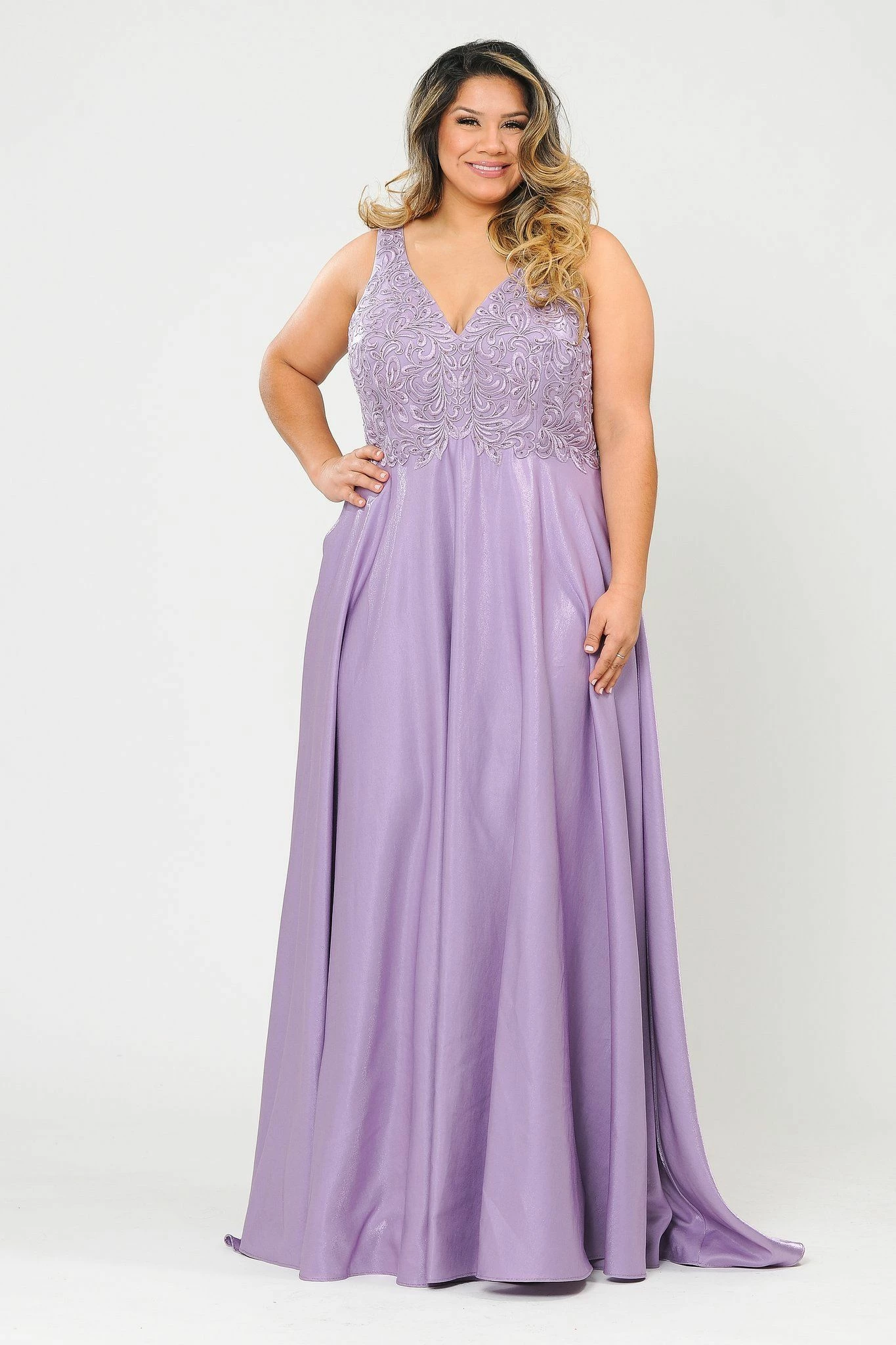 Look timeless in this plus size long sleeveless A-line dress with embroidered top by Poly USA W1074. This beautiful gown features a sleeveless V-neck bodice adorned with embroidery that is accented with dainty beads, convenient side pockets, open back, floor length A-line skirt with sweep train, and a lace-up corset back.
