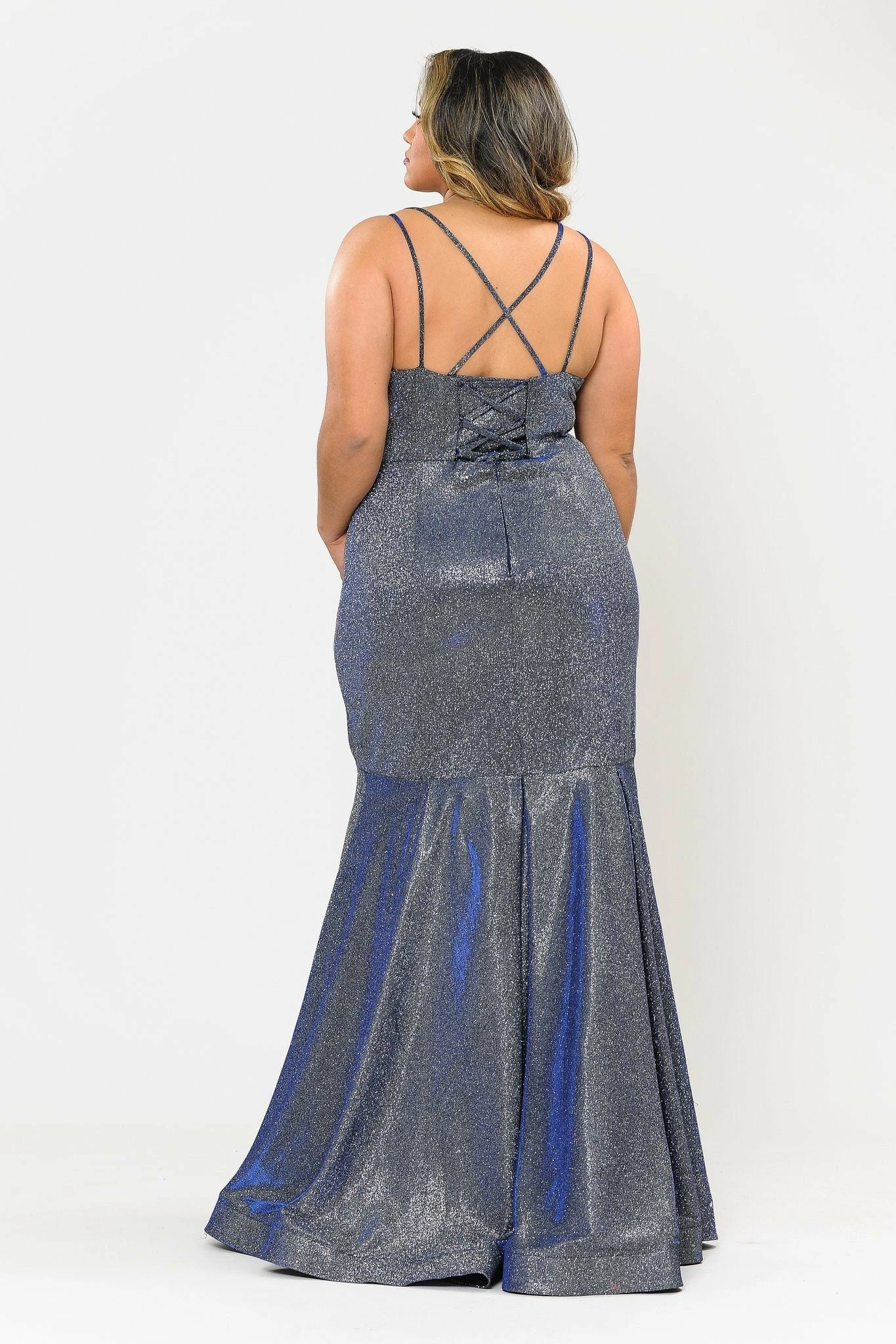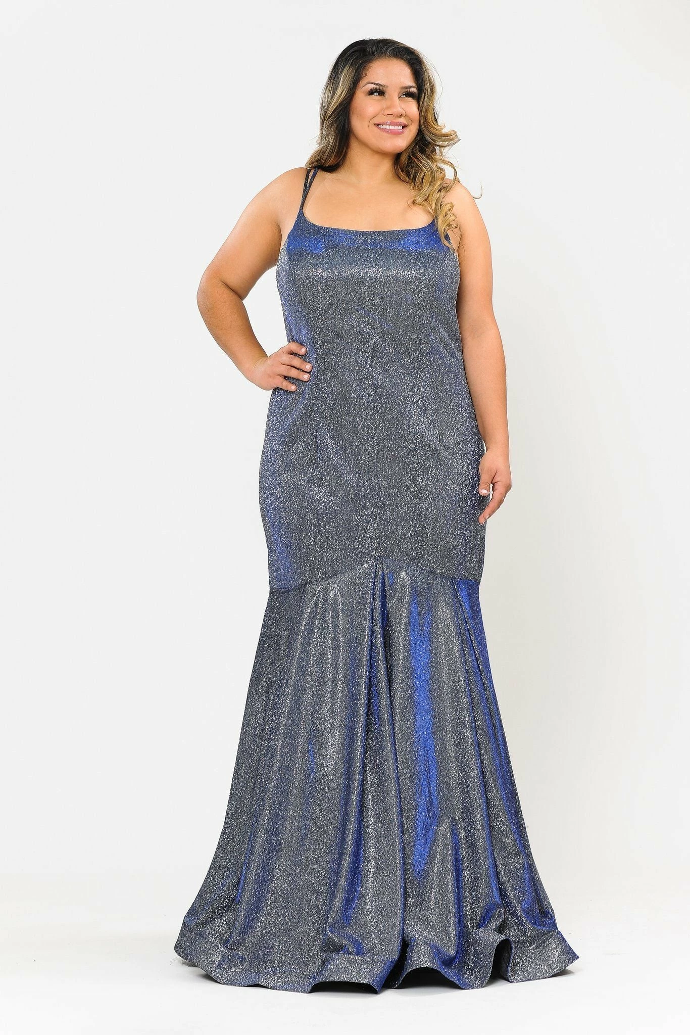 Dance the night away in this plus size long metallic glitter fitted dress by Poly USA W1102 with crisscross back. Made out of glitter knit, this beautiful gown features a sleeveless bodice with a square neckline, open back with crisscross straps, floor length mermaid skirt with sweep train, and a lace-up corset back.
