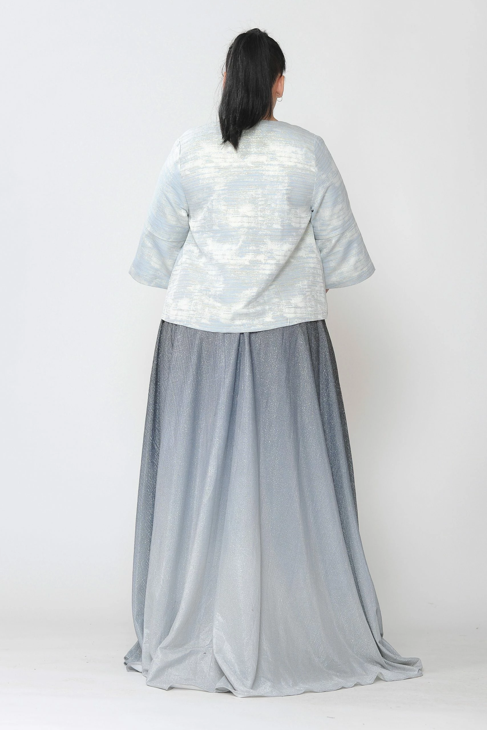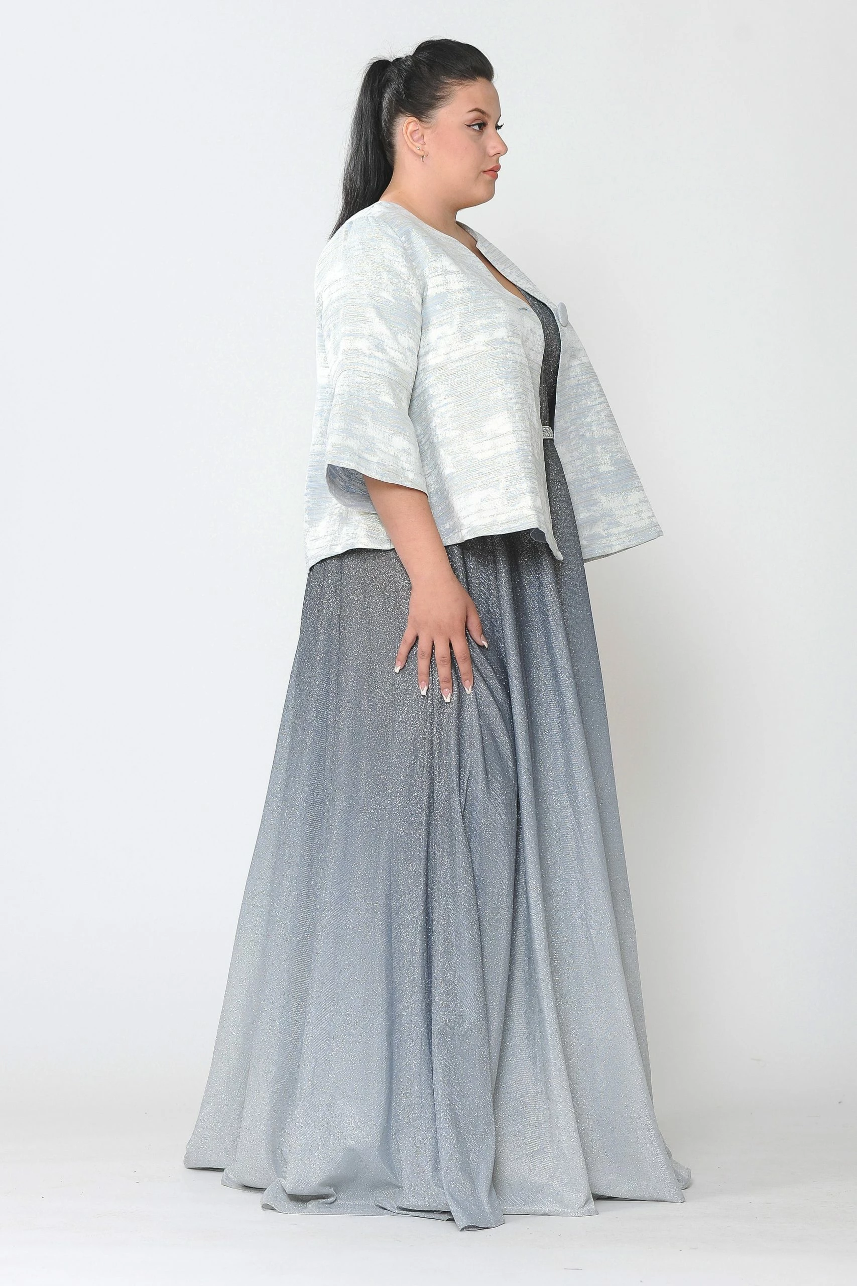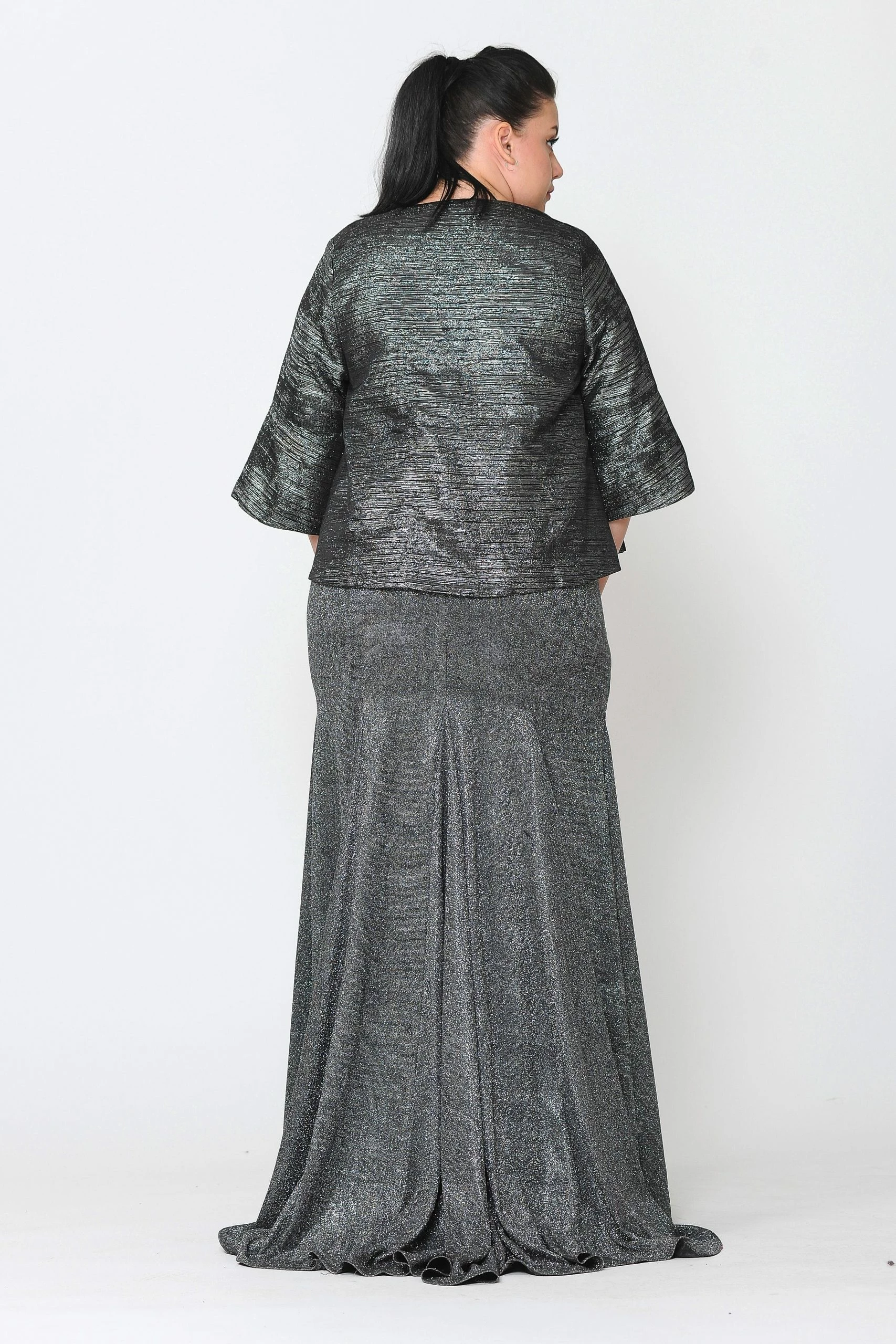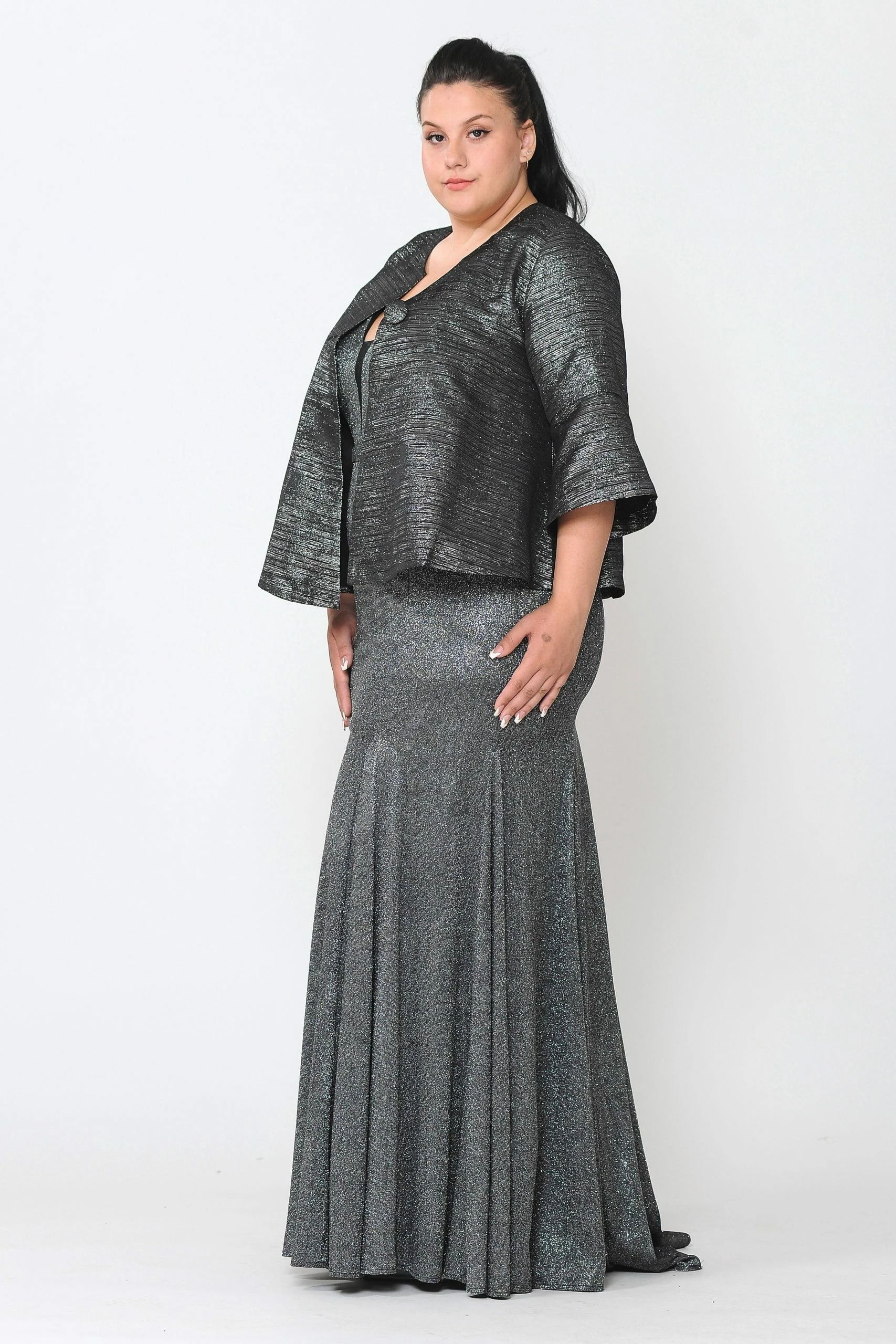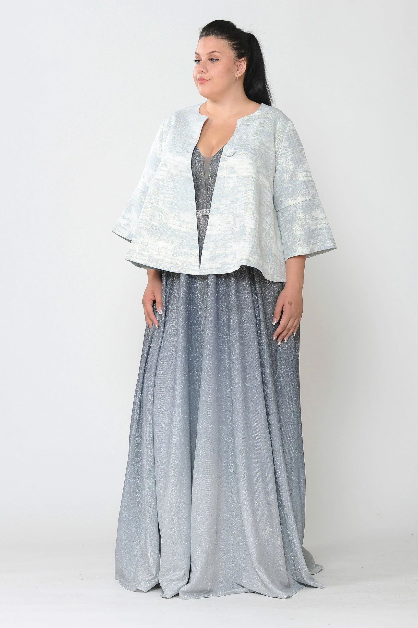 Add this versatile two-tone metallic plus size formal jacket with single-button by Poly USA JK1922 in your wardrobe.
