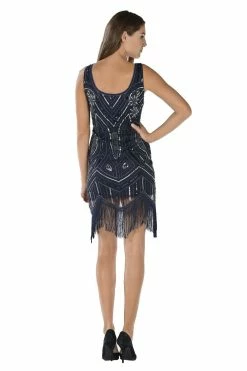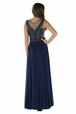 Navy Blue Long Illusion Dress With Beaded Bodice By Poly USA
