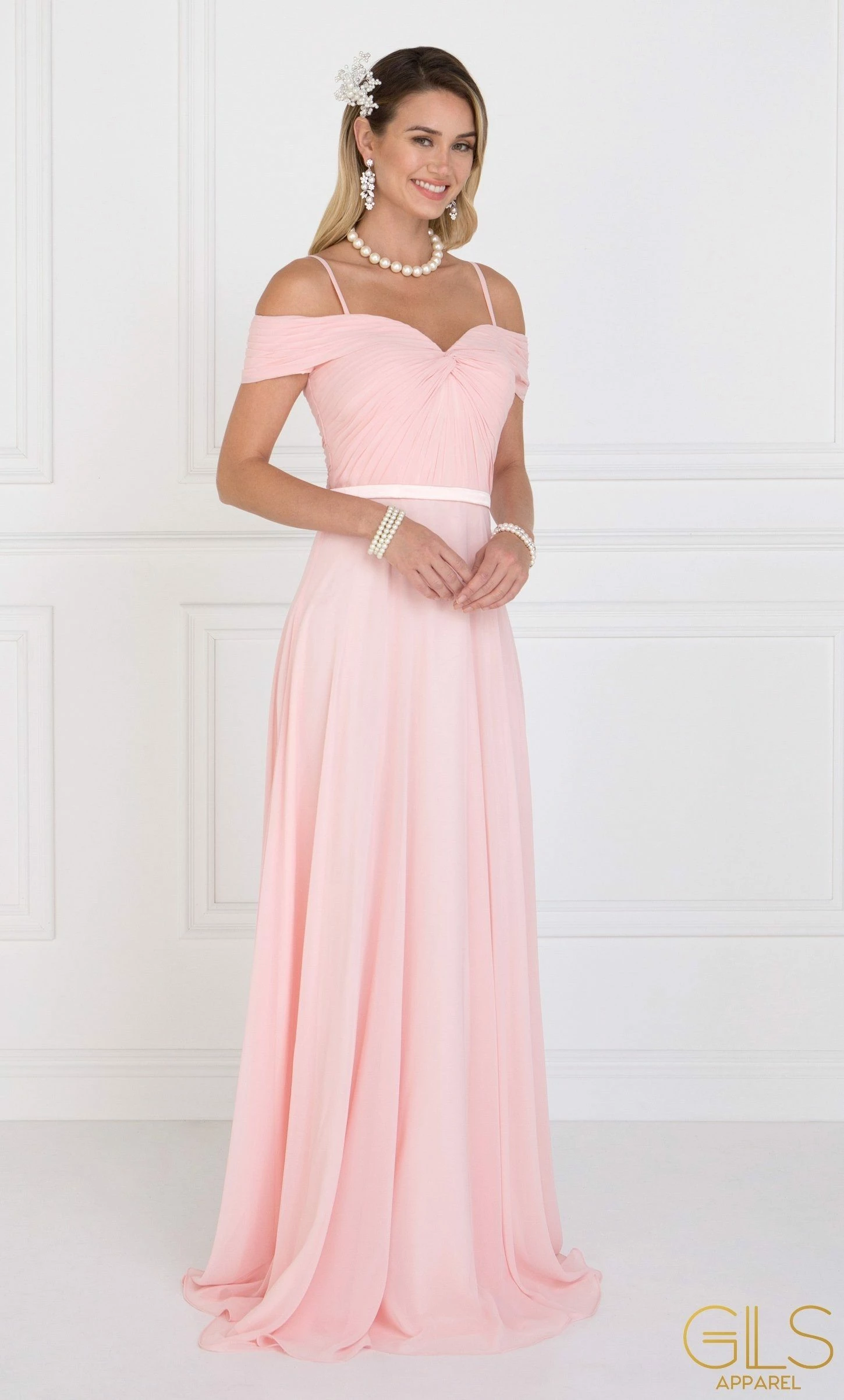 Look picture-perfect in this versatile long blush pink off-the-shoulder chiffon dress with ruched bodice by Elizabeth K GL1523. Spaghetti strap cold shoulder full length dress with an A-line silhouette. This gown features a ruched bodice with a classic sweetheart neckline, a relaxed horizon back, detachable and adjustable spaghetti straps for more support, a thin satin waistband, and a zipper closure.