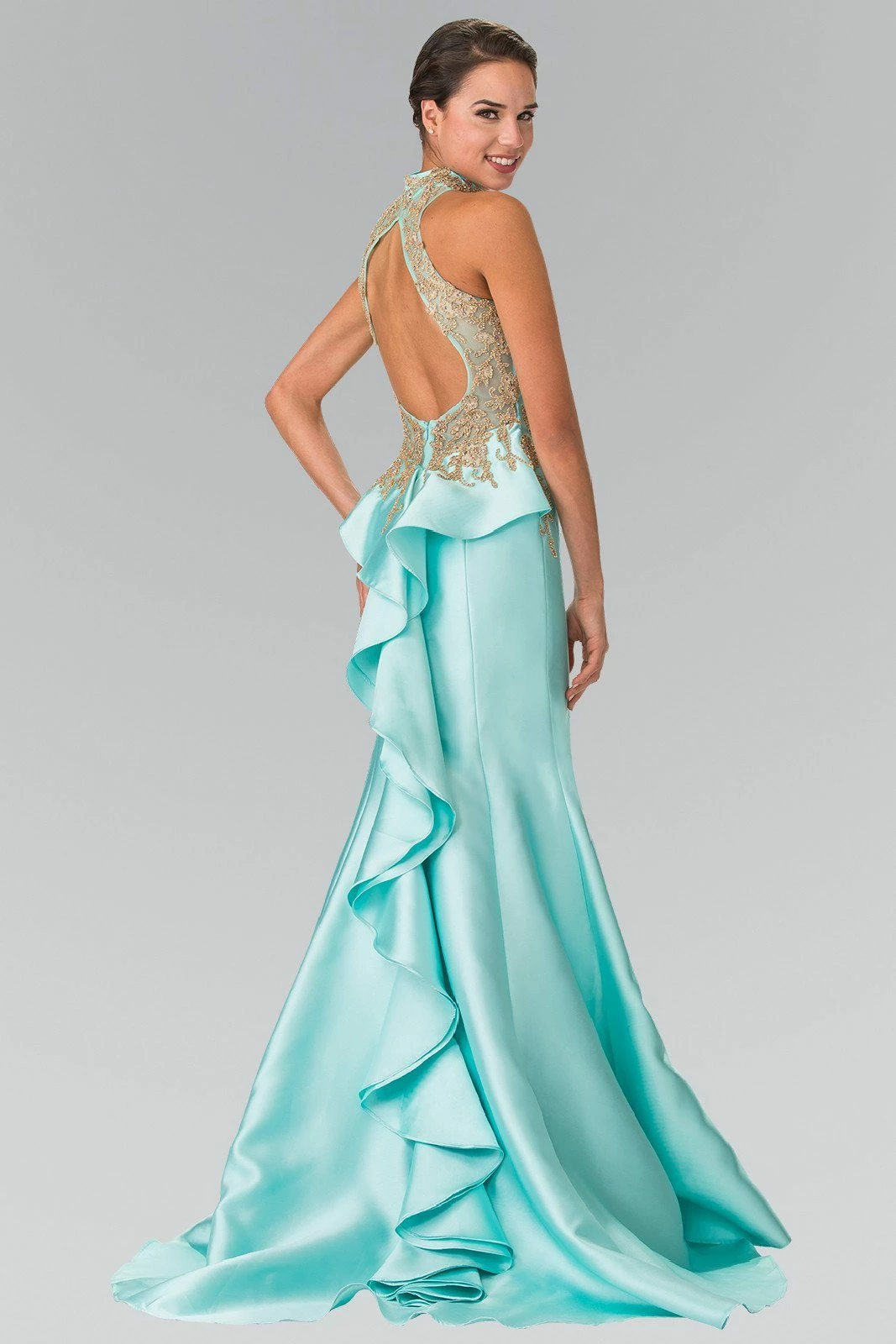 Look breathtaking in this bead embroidered long halter illusion dress with ruffled mermaid skirt by Elizabeth K GL2280.