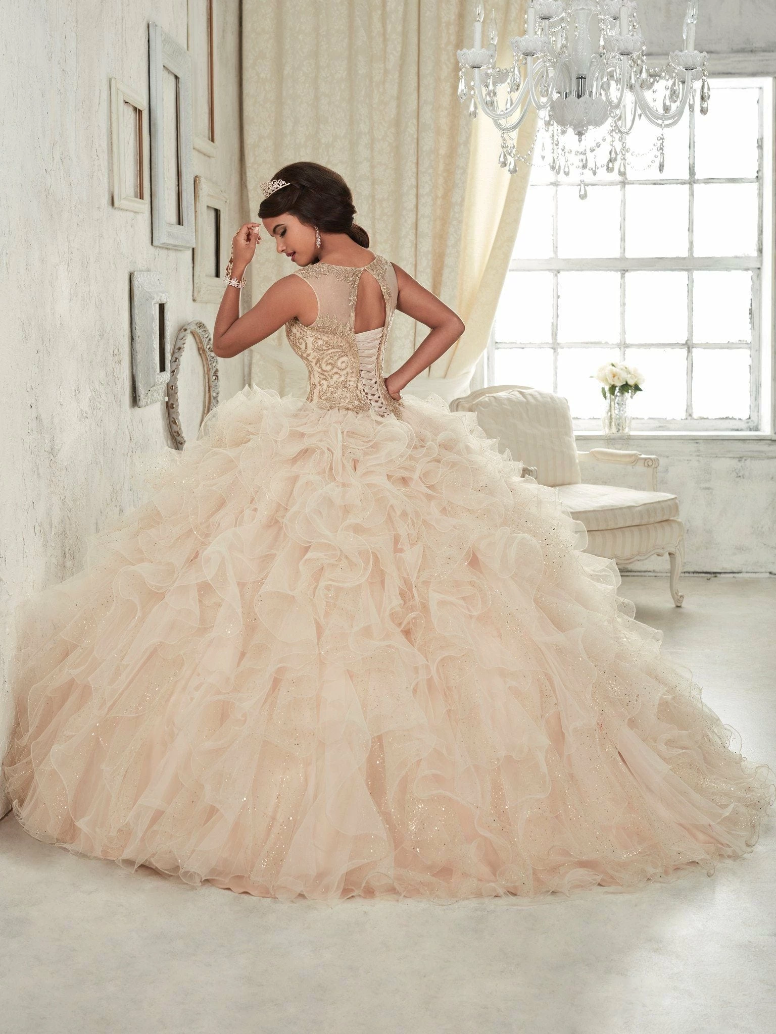 Receive lots of compliments in this beaded long sleeveless illusion dress with ruffled A-line skirt by House of Wu Quinceanera Collection 26835. Glimmering embroidery dipped in gold and wavy tulle flecked in sparkle like stars across a skirt canvas, with an embroidered illusion neckline and straps. Complete with lace-up corset and sweep train.