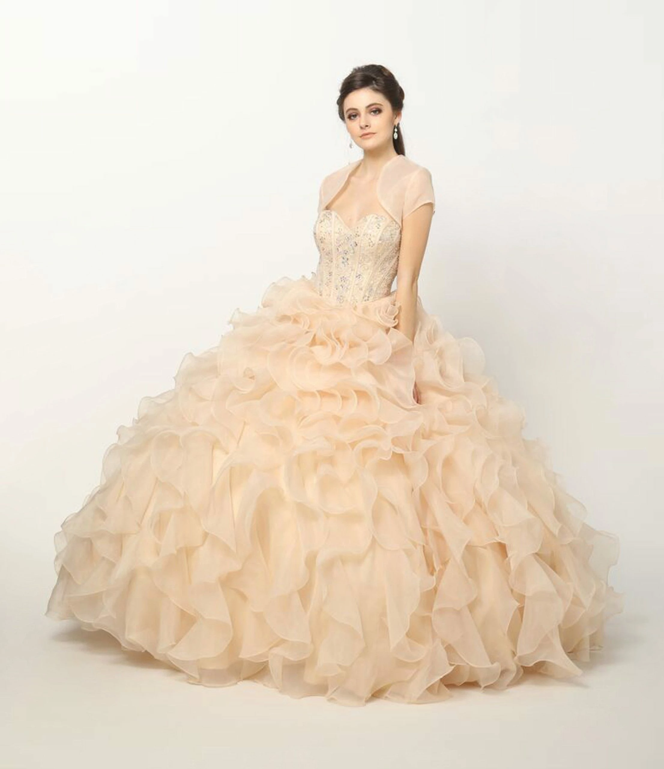 Impress your guests in this beaded long strapless sweetheart dress with ruffled organza skirt by Juliet 1418. Fully beaded sweetheart neckline, full ruffled skirt with sweep train. Matching bolero jacket included.