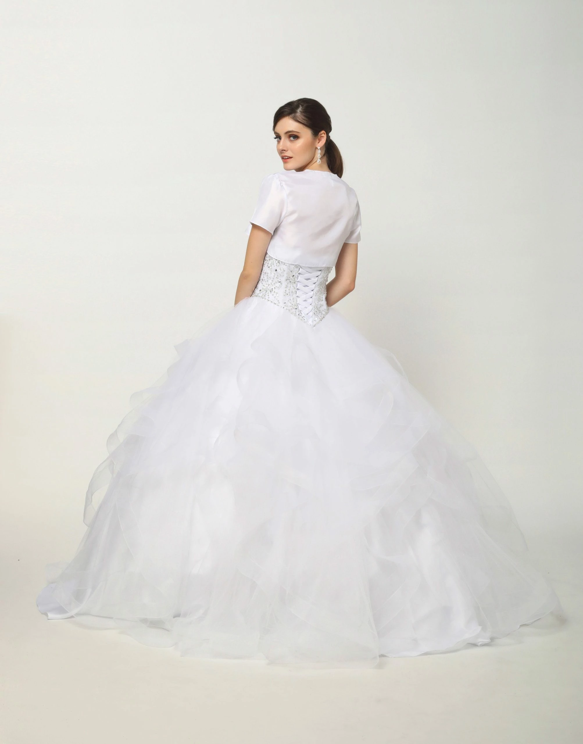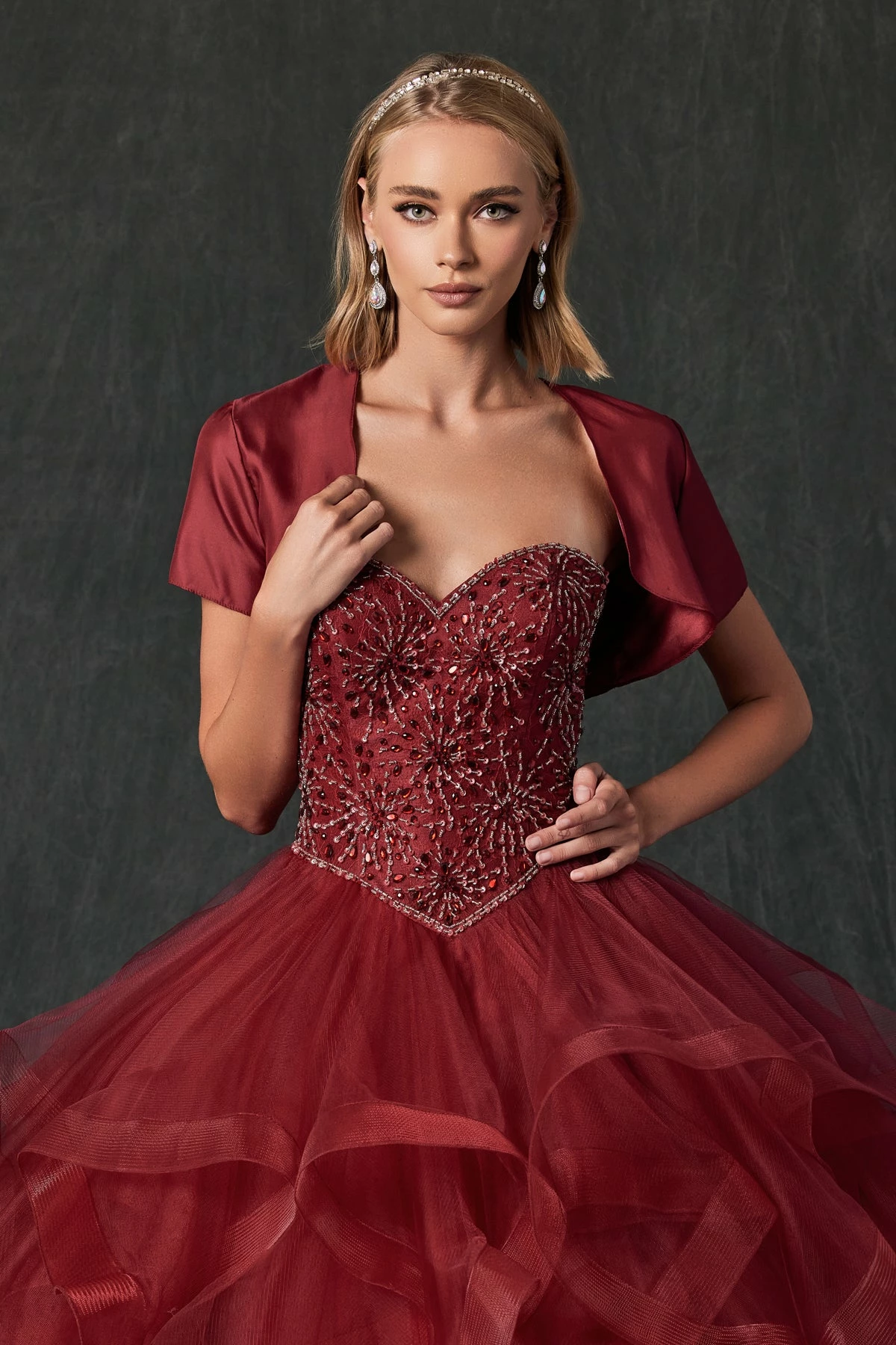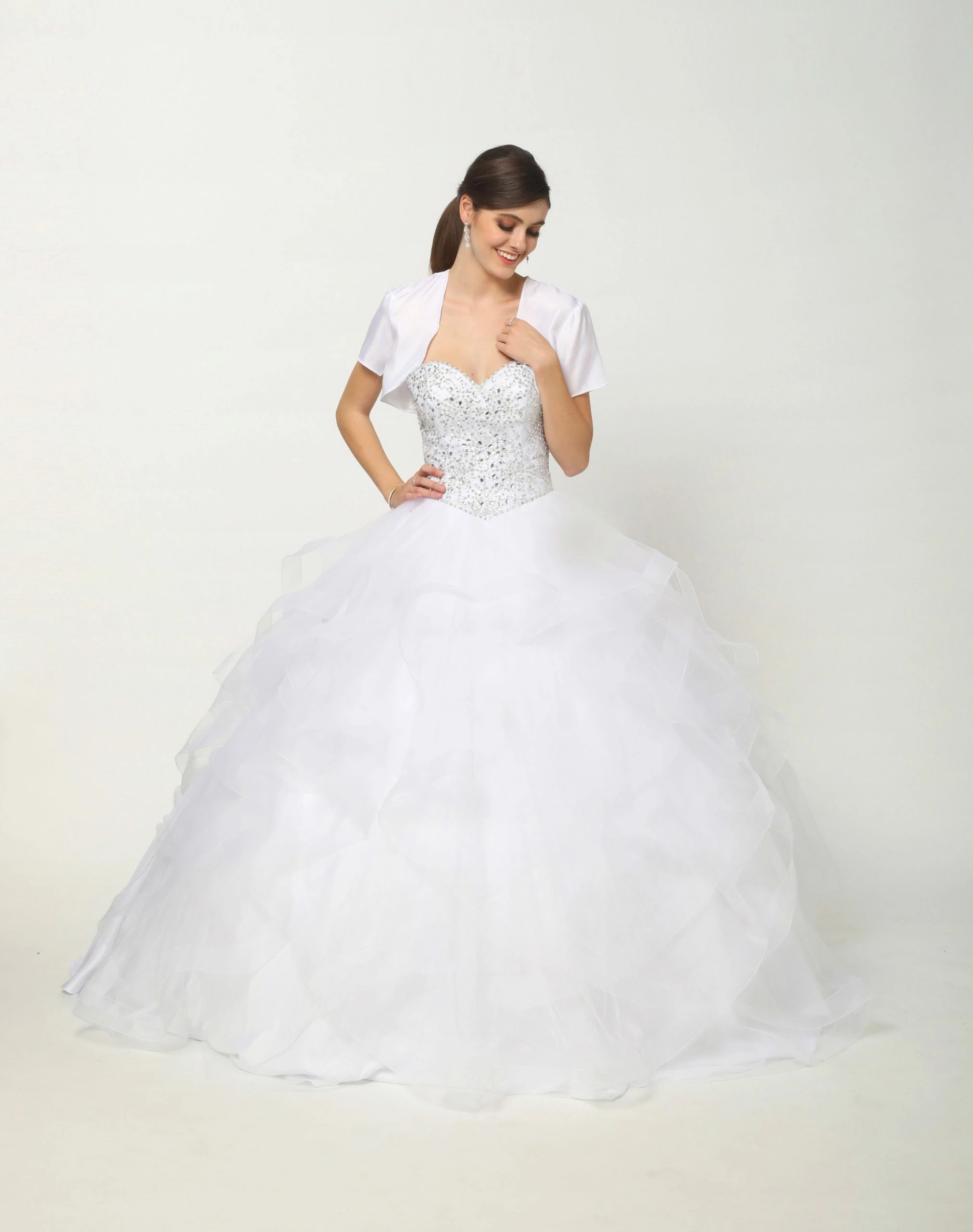 Look like a fairy tale Princess in this beaded lace long strapless sweetheart dress with flounced skirt by Juliet 1425. Fully beaded sweetheart bodice, full ruffled skirt accented with horsehair trim. Detachable sleeves and matching bolero jacket included.