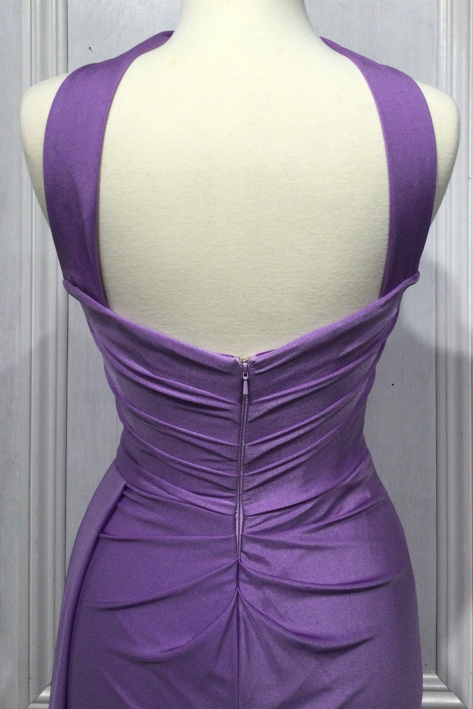 Make lasting memories in this fitted long halter dress with gloves from Ladivine by Cinderella Divine CD886. Cut from stretch satin, the dress is gathered up to the strapless bodice with halter straps. This gown is completed with fabulous long matching gloves and a sultry leg slit. The ruched bodice creates a sexy silhouette that hugs your curves accentuated with a draping side sash.