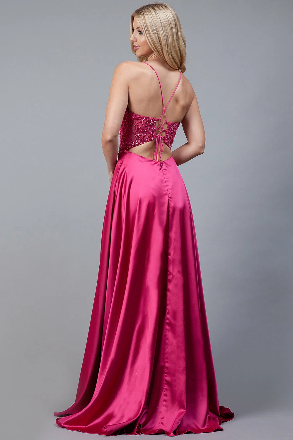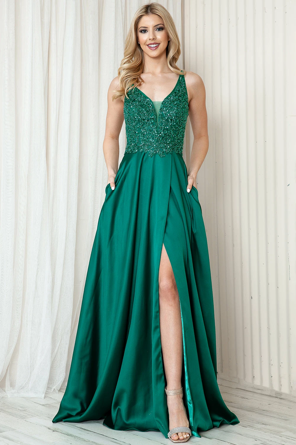 Dance the night away in this embroidered sequin applique long sleeveless satin dress with A-line slit skirt by Amelia Couture 6120.