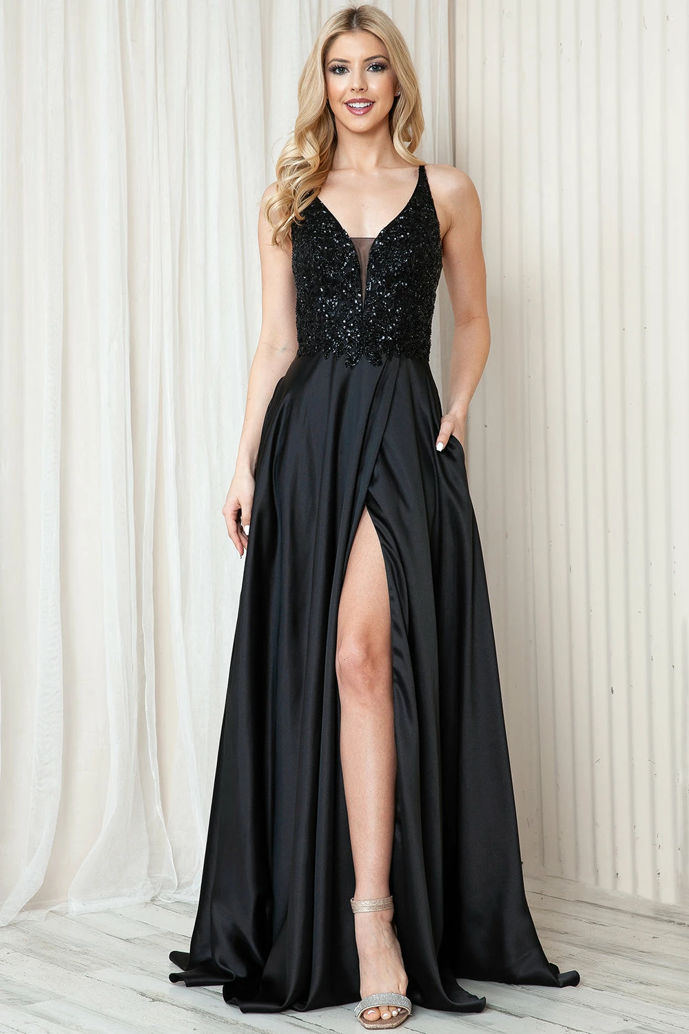 - Sequin Applique Satin Slit Gown by Amelia Couture 6120
