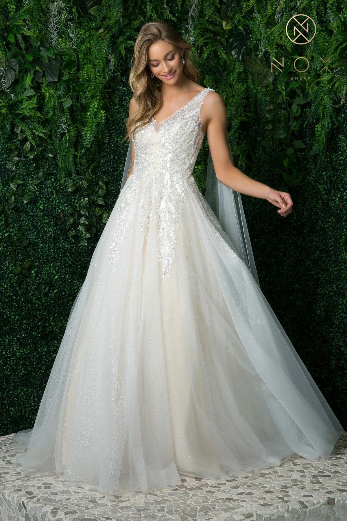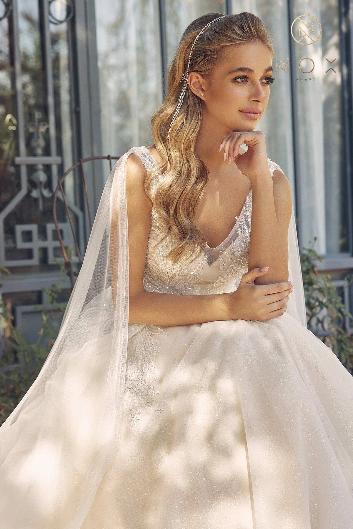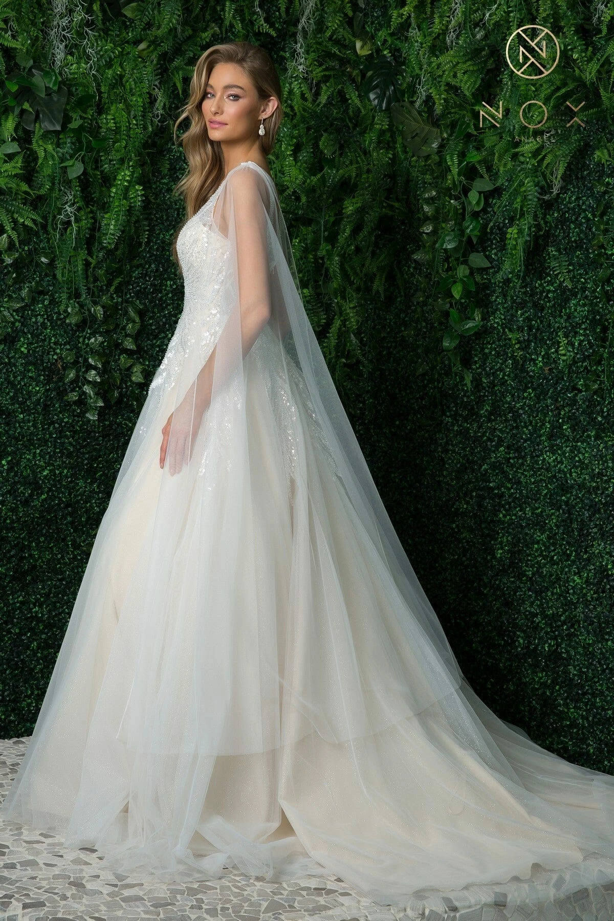 - Sequin Cape Sleeve Bridal Gown by Nox Anabel JE947