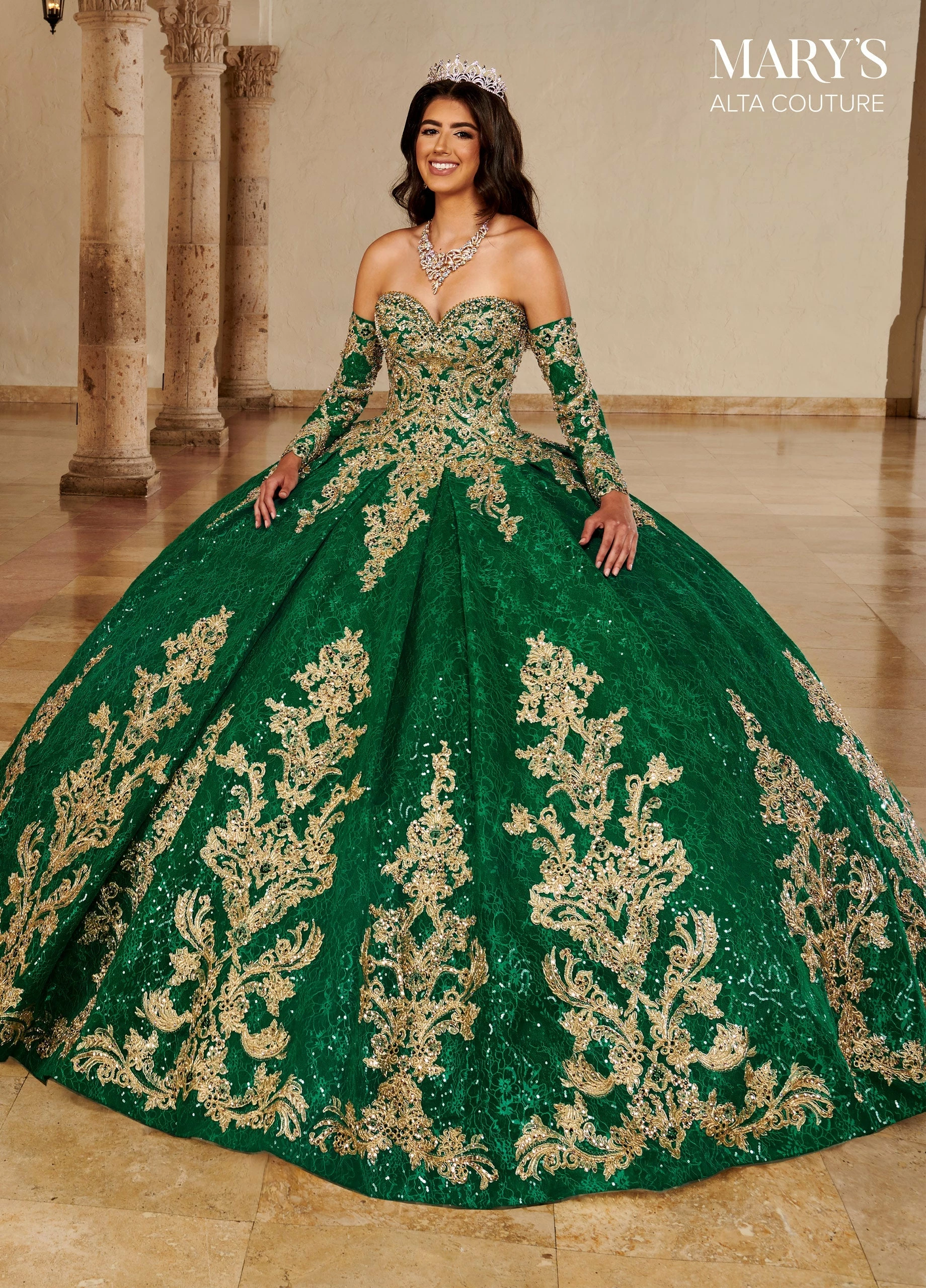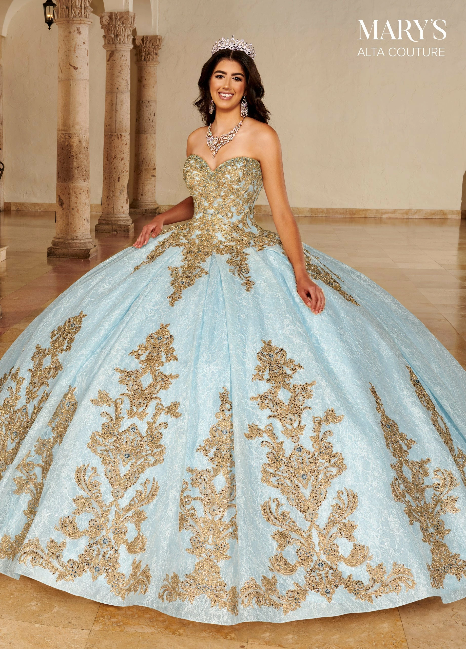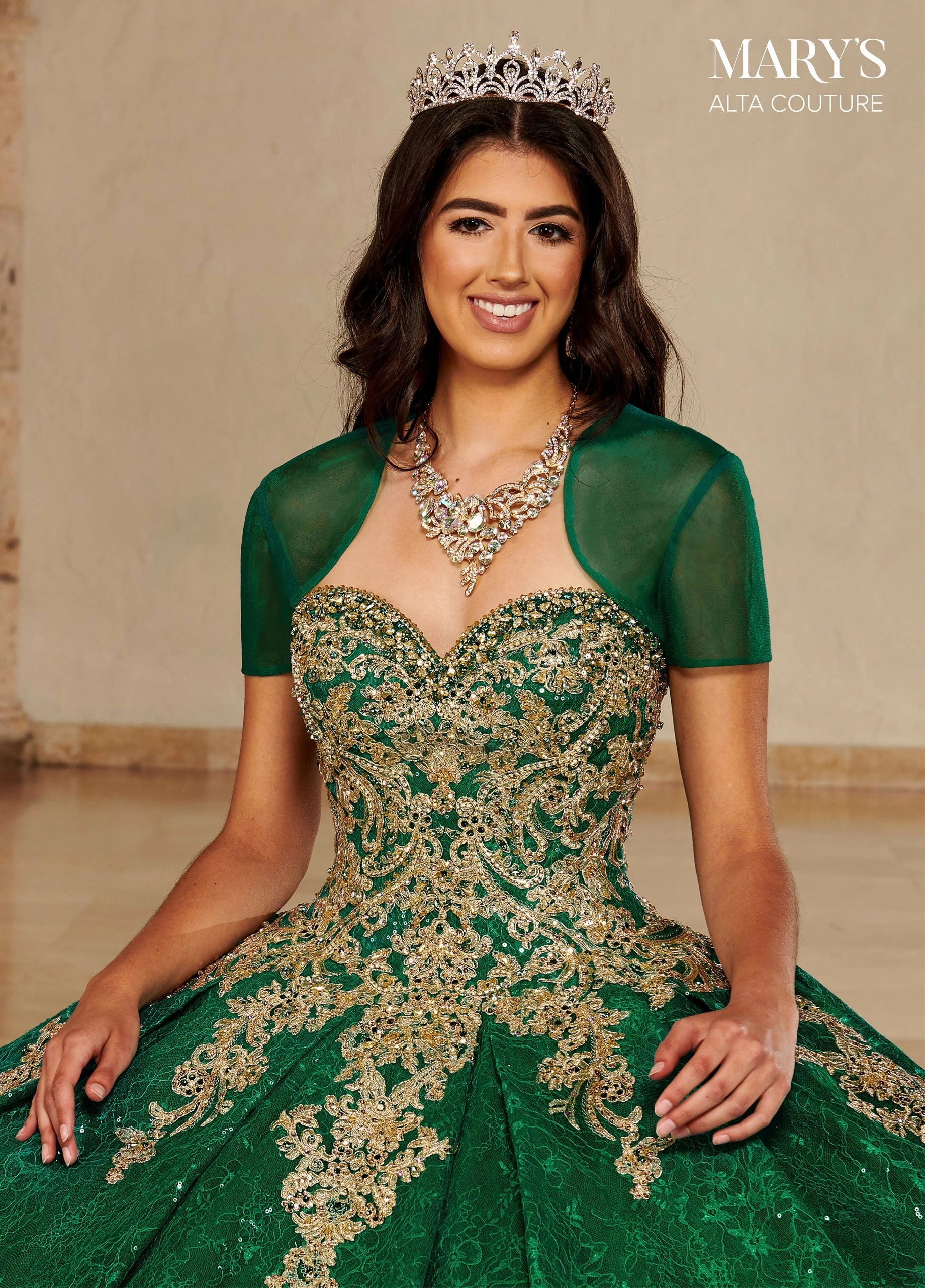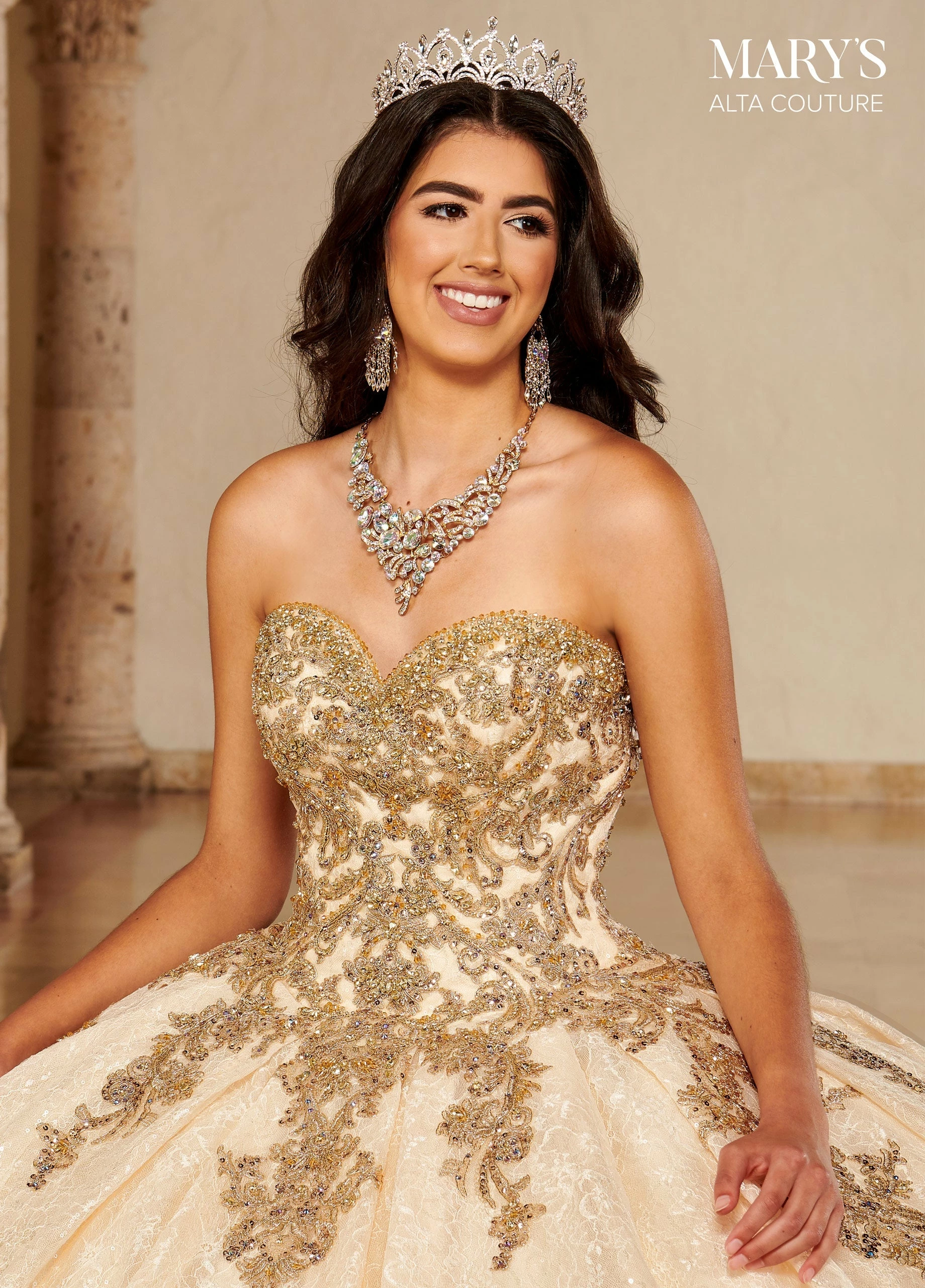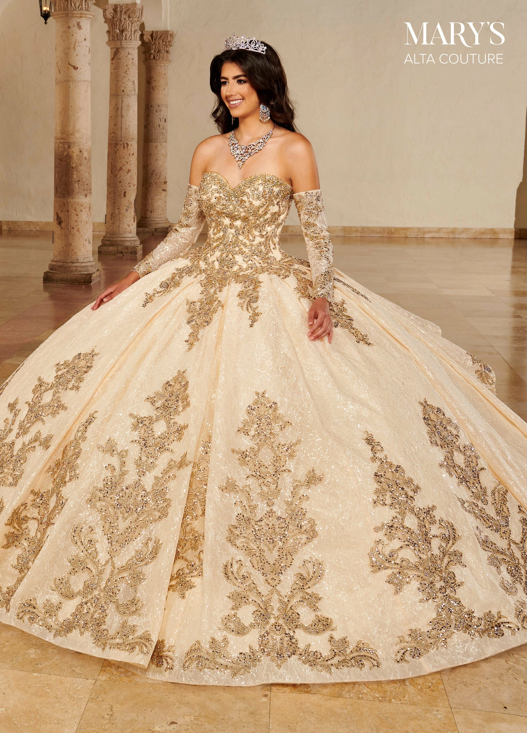 Look unforgettable in this long strapless dress with A-line skirt by Mary’s Bridal Alta Couture MQ3077. This strapless quinceanera ball gown is made out of sequined lace, glitter tulle, embroidery applique, and beading. This gown features a sweetheart neckline, detachable long sleeves, draped skirt with chapel train, and a matching bolero jacket.