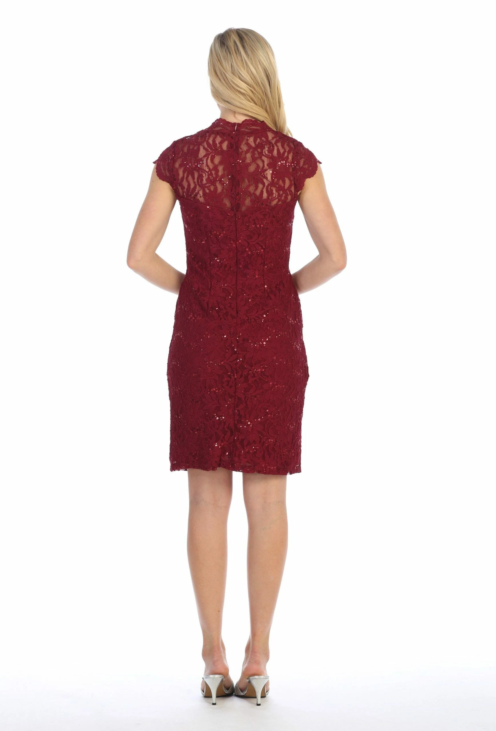 Receive lots of compliments in this sequined lace cocktail dress with cap sleeves by Celavie 6326. This beautiful short dress features a high-neckline with keyhole cutout, cap sleeves, sheer lace back, short A-line lace skirt that falls just above the knees, and a zipper closure. Affordably priced at $90, this short party dress is perfect for any formal event and will keep you on budget!