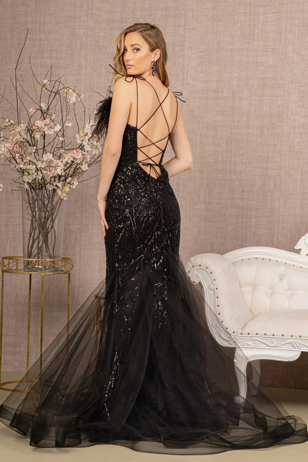 Turn heads in this sequin embroidered long sleeveless feather dress with fitted mermaid skirt by GLS Gloria GL3117.